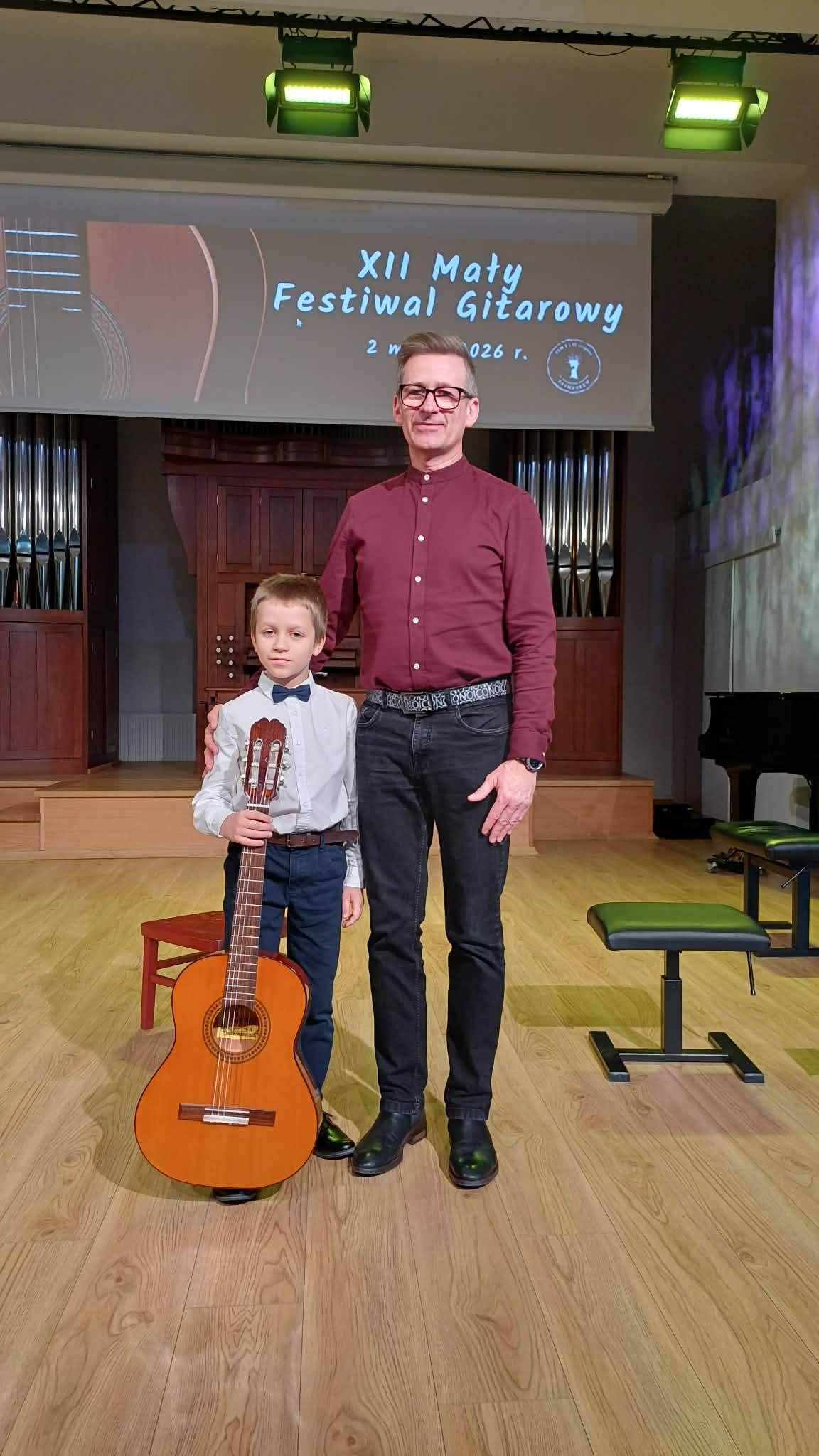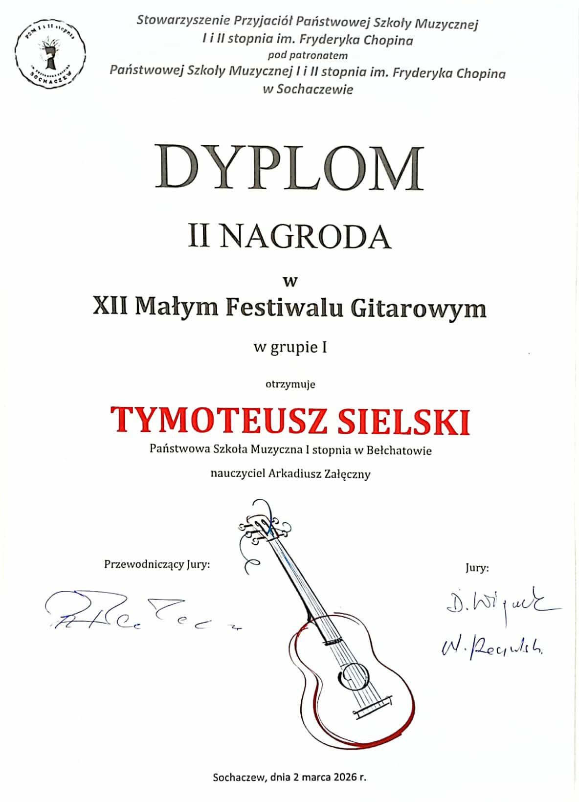 W dniu 2 marca 2026 roku w Państwowej Szkole Muzycznej I i II stopnia im. Fryderyka Chopina w Sochaczewie odbył się Ogólnopolski XII Mały Festiwal Gitarowy, w którym brał udział uczeń z naszej szkoły Tymoteusz Sielski z klasy gitary pana Arkadiusza Załęcznego. Tymoteusz zdobył II nagrodę w grupie I