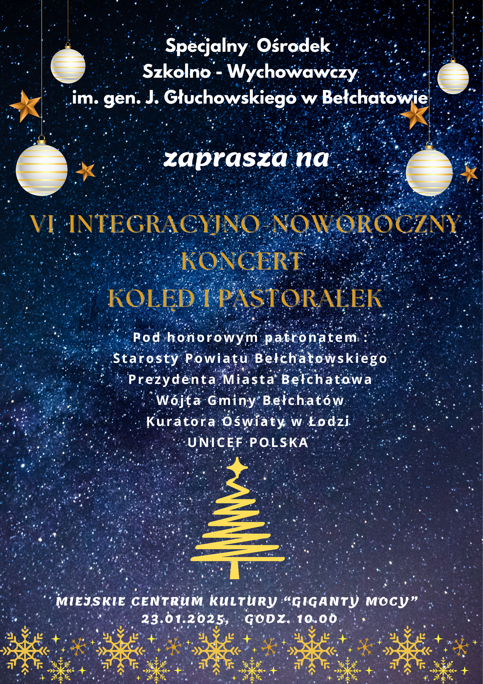 Specjalny Ośrodek Szkolno - Wychowawczy im. gen. J. Głuchowskiego w Bełchatowie zaprasza na VI Integracyjno Noworoczny Koncert Kolęd i Pastorałek, który odbędzie się 23.01.2025 roku o godzinie 10:00 w Miejskim Centrum Kultury "Giganty Mocy"