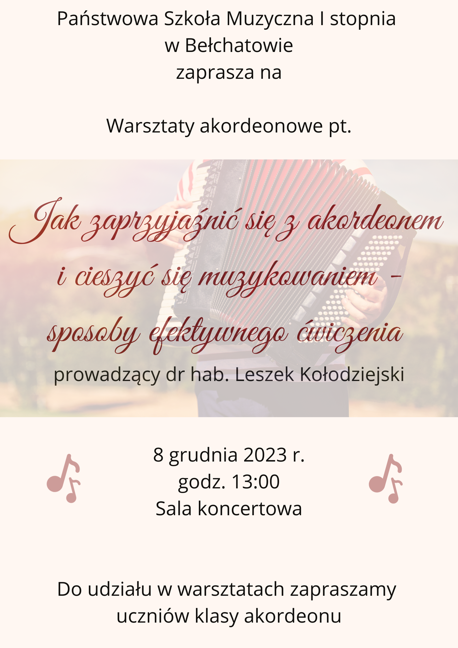 Serdecznie zapraszamy uczniów klasy akordeonu na warsztaty, które odbędą się 8 grudnia 2023 r. od godz. 13:00 w sali koncertowej Państwowej Szkoły Muzycznej I stopnia w Bełchatowie. Warsztaty poprowadzi dr hab. Leszek Kołodziejski.