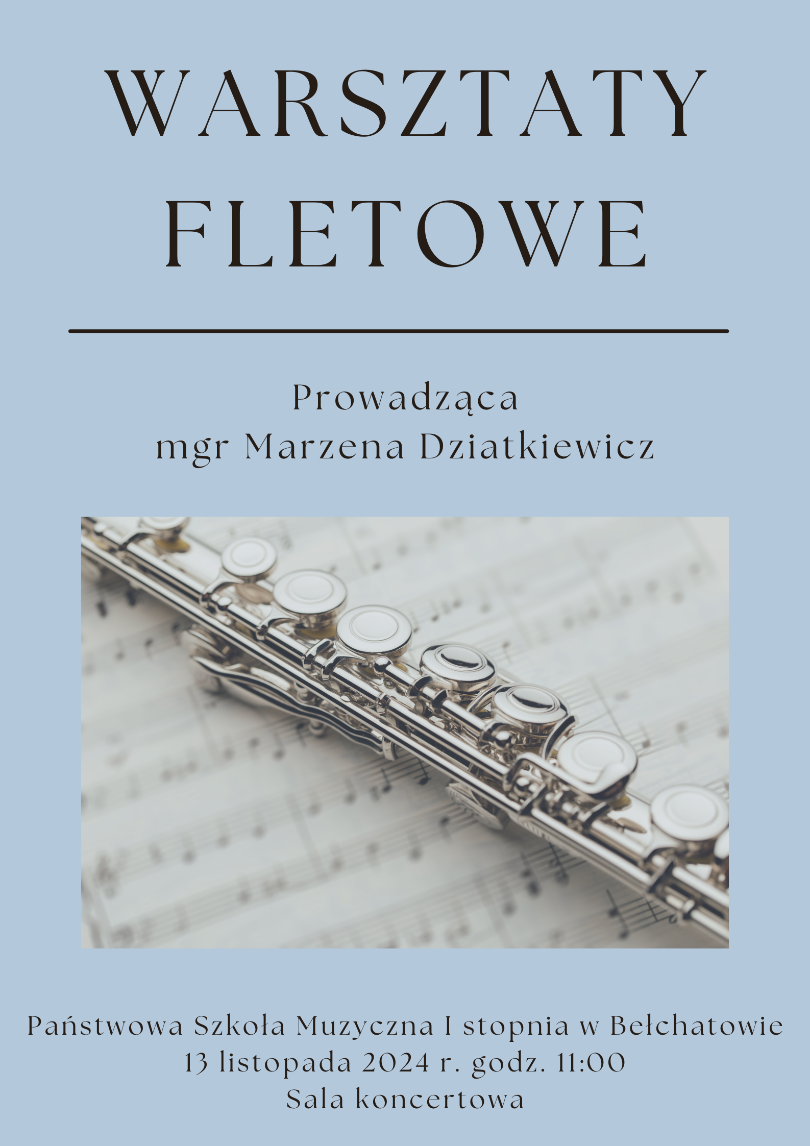 Serdecznie zapraszamy uczniów klasy fletu na warsztaty fletowe, które poprowadzi mgr Marzena Dziatkiewicz - nauczyciel fletu w Zespole Szkół Muzycznych im. S. Moniuszki w Łodzi. Warsztaty odbędą się 13 listopada 2024 r. o godzinie 11:00 w sali koncertowej Państwowej Szkoły Muzycznej I stopnia w Bełchatowie.