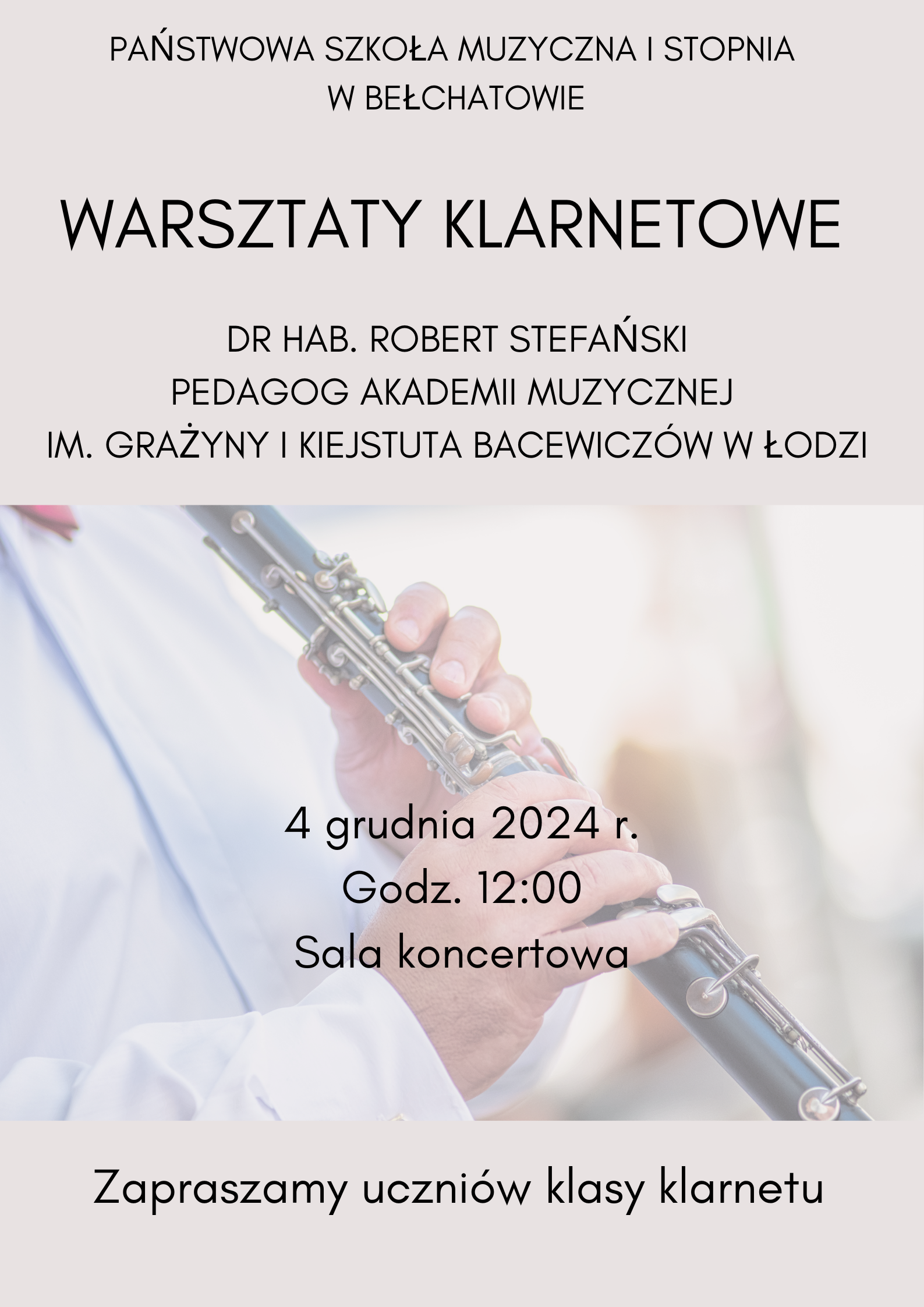 Serdecznie zapraszamy uczniów klasy klarnetu na warsztaty z dr hab. Robertem Stefańskim, które odbędą się 4 grudnia 2024 r. o godzinie 12:00 w sali koncertowej Państwowej Szkoły Muzycznej I stopnia w Bełchatowie.