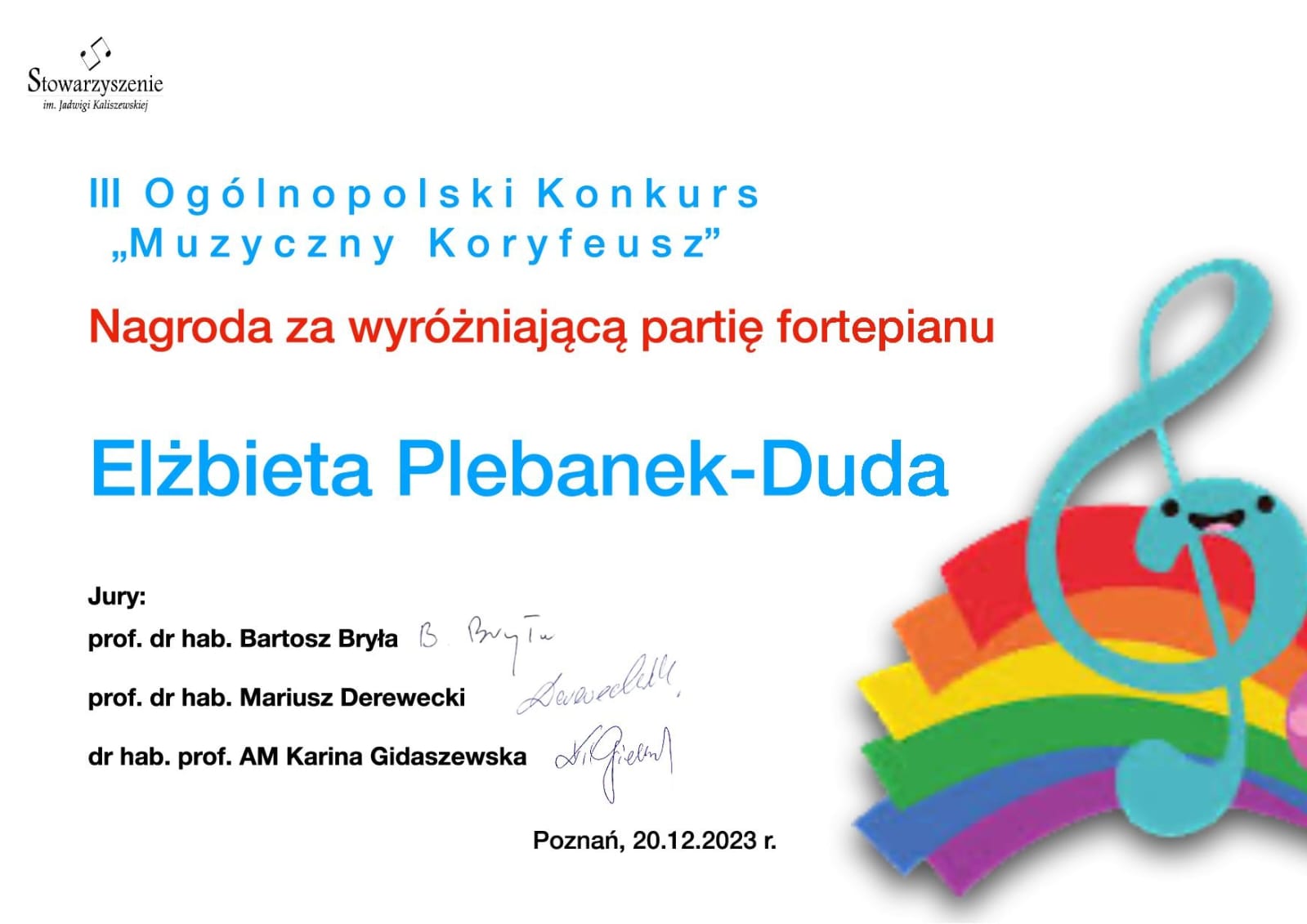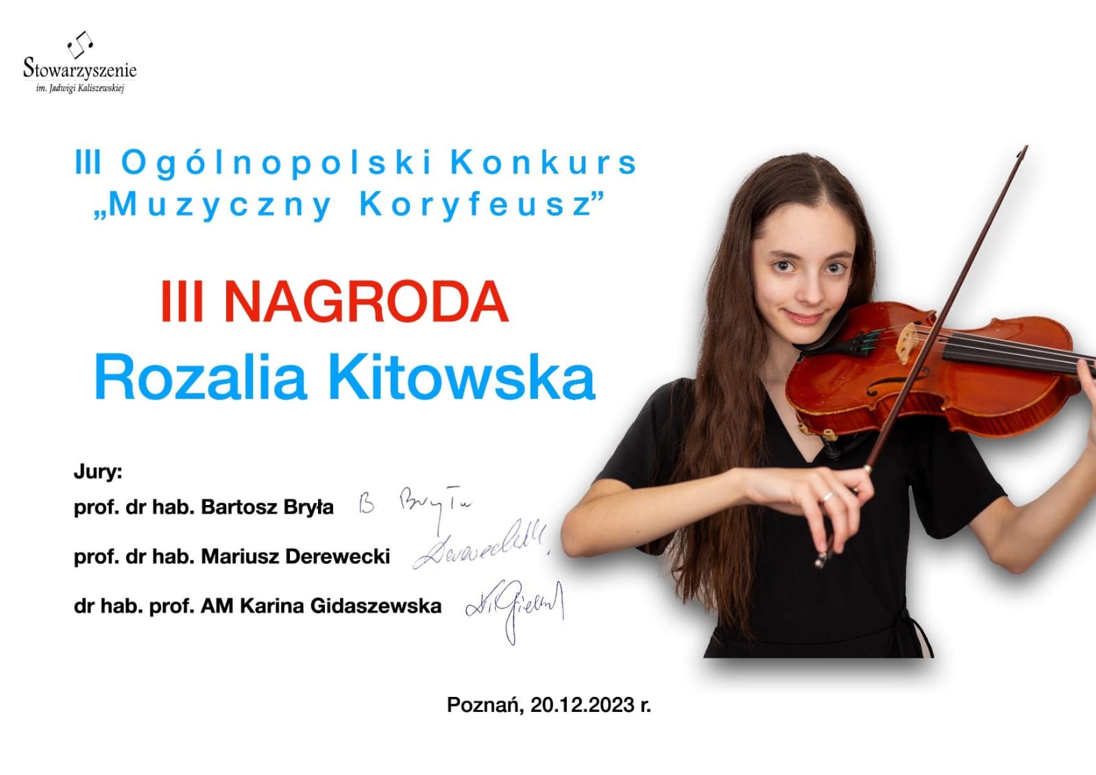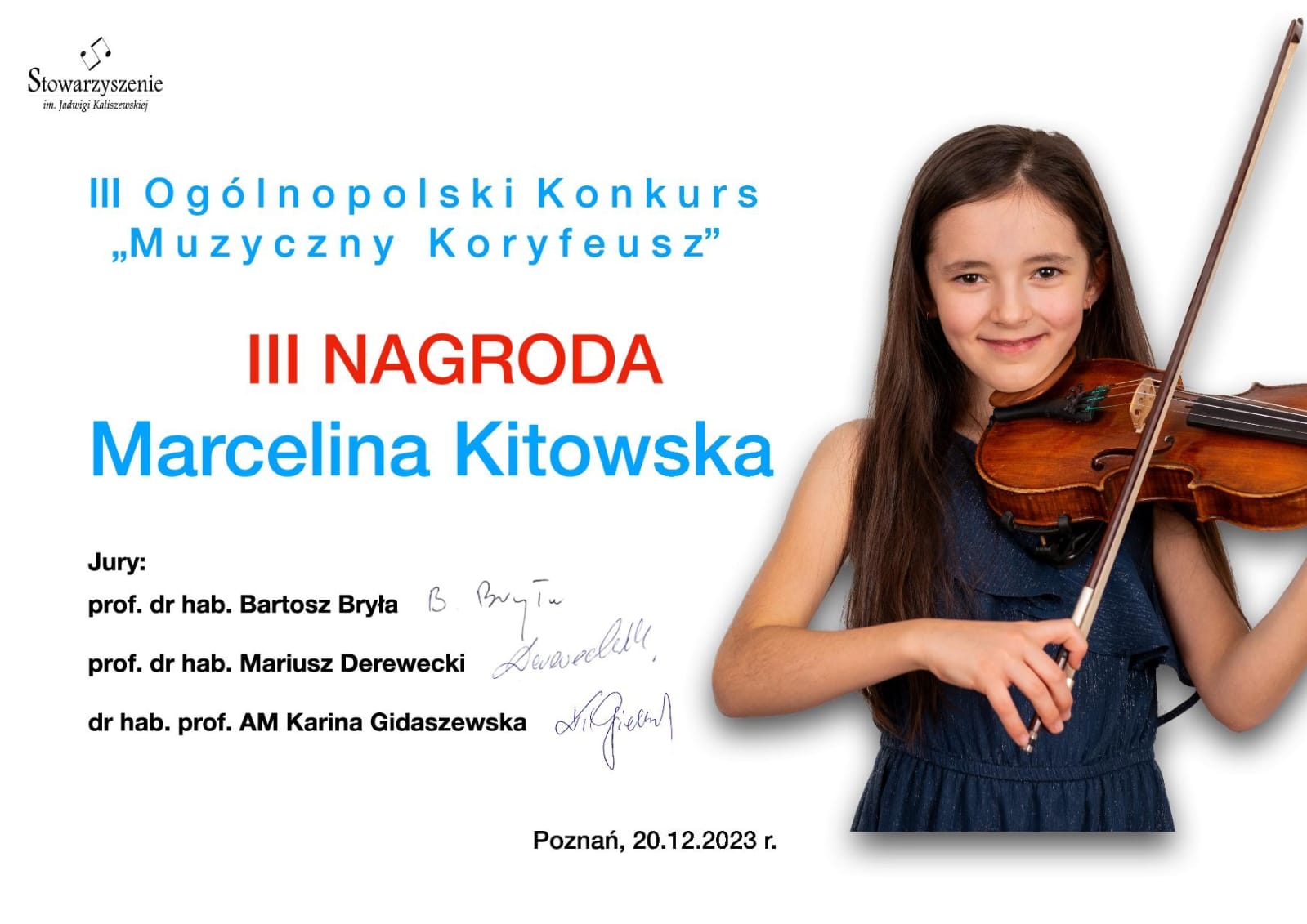 Dnia 20 grudnia 2023 roku odbył się w Poznaniu III Konkurs smyczkowy "Muzyczny Koryfeusz", w którym trzecie miejsca zdobyły nasze dwie uczennice - Marcelina Kitowska z kl. III c/6 oraz jej siostra Rozalia Kitowska z kl. VI c/6. Serdecznie gratulujemy dziewczynkom oraz nauczycielkom p. Aleksandrze Bratko i p. Malwinie Szczerbie. Przy fortepianie akompaniowała skrzypaczkom niezastąpiona p. Elżbieta Plebanek - Duda, którą jury uhonorowało nagrodą za wyróżniającą partię fortepianu. Gratulujemy!!!
