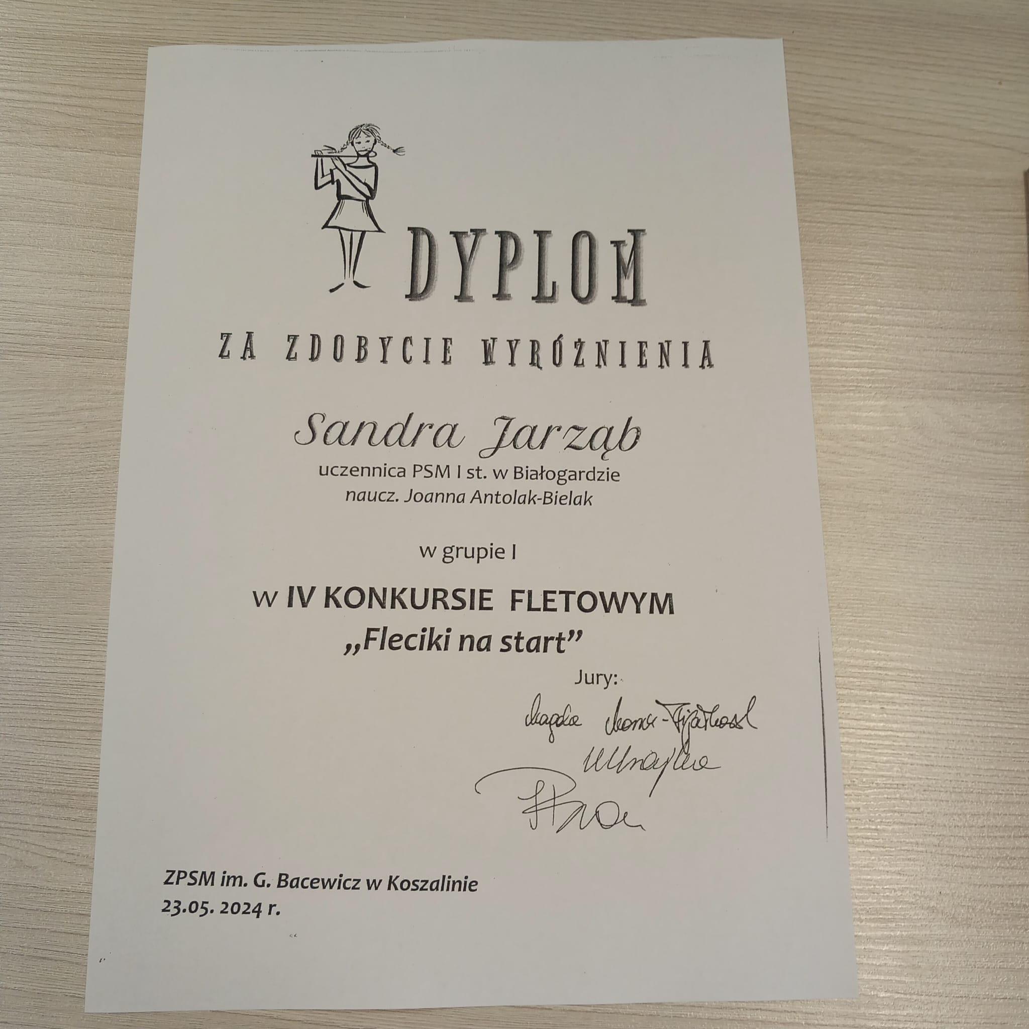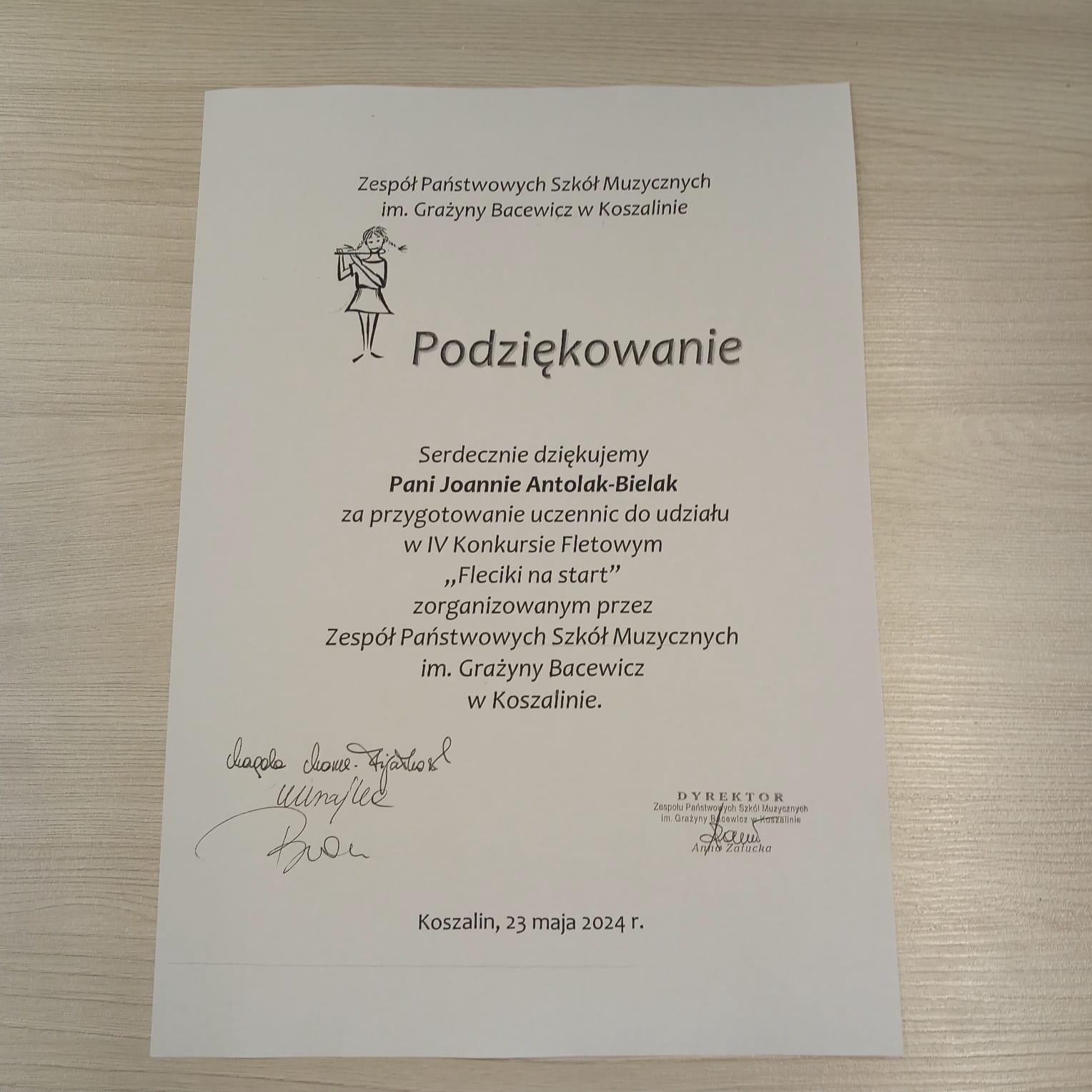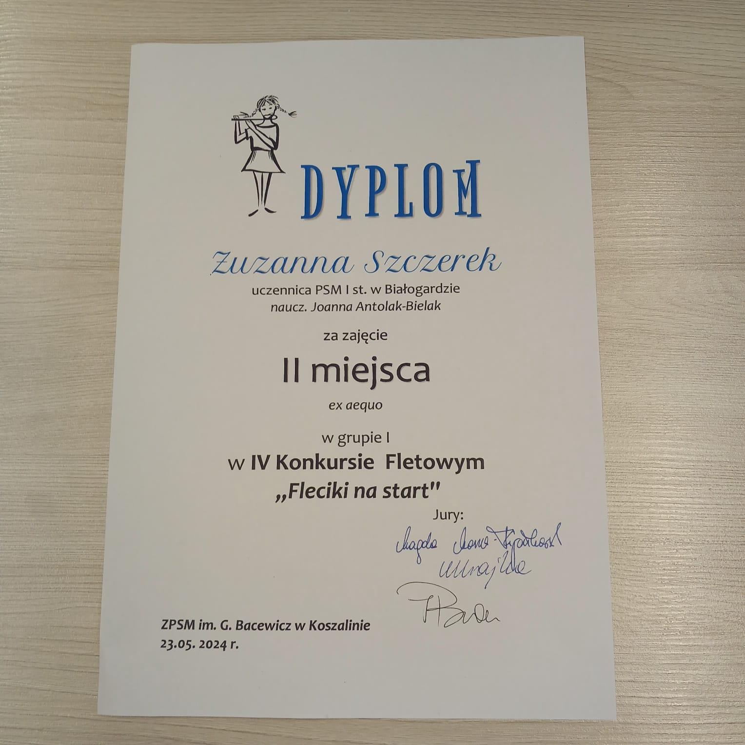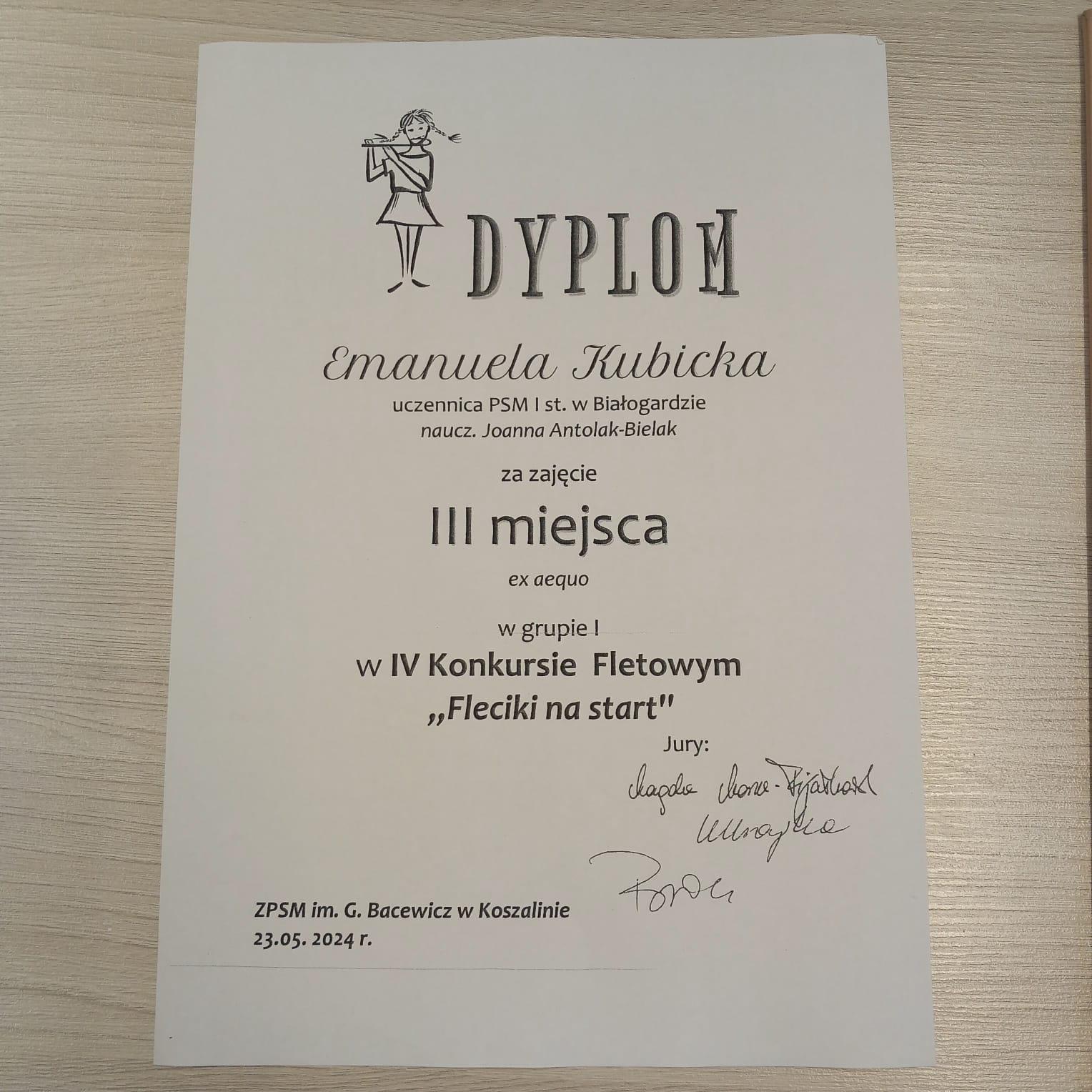23 maja 2024 roku, w Zespole Państwowych Szkół Muzycznych w Koszalinie, odbył się IV Konkurs Fletowy "Fleciki na start". Jury konkursu doceniło prezentacje uczennic naszej szkoły i przyznało II miejsce Zuzannie Szczerek, III miejsce Emanueli Kubickiej oraz wyróżnienie Sandrze Jarząb. Serdecznie gratulujemy dziewczynkom oraz nauczycielce pani Joannie Antolak - Bielak!!!