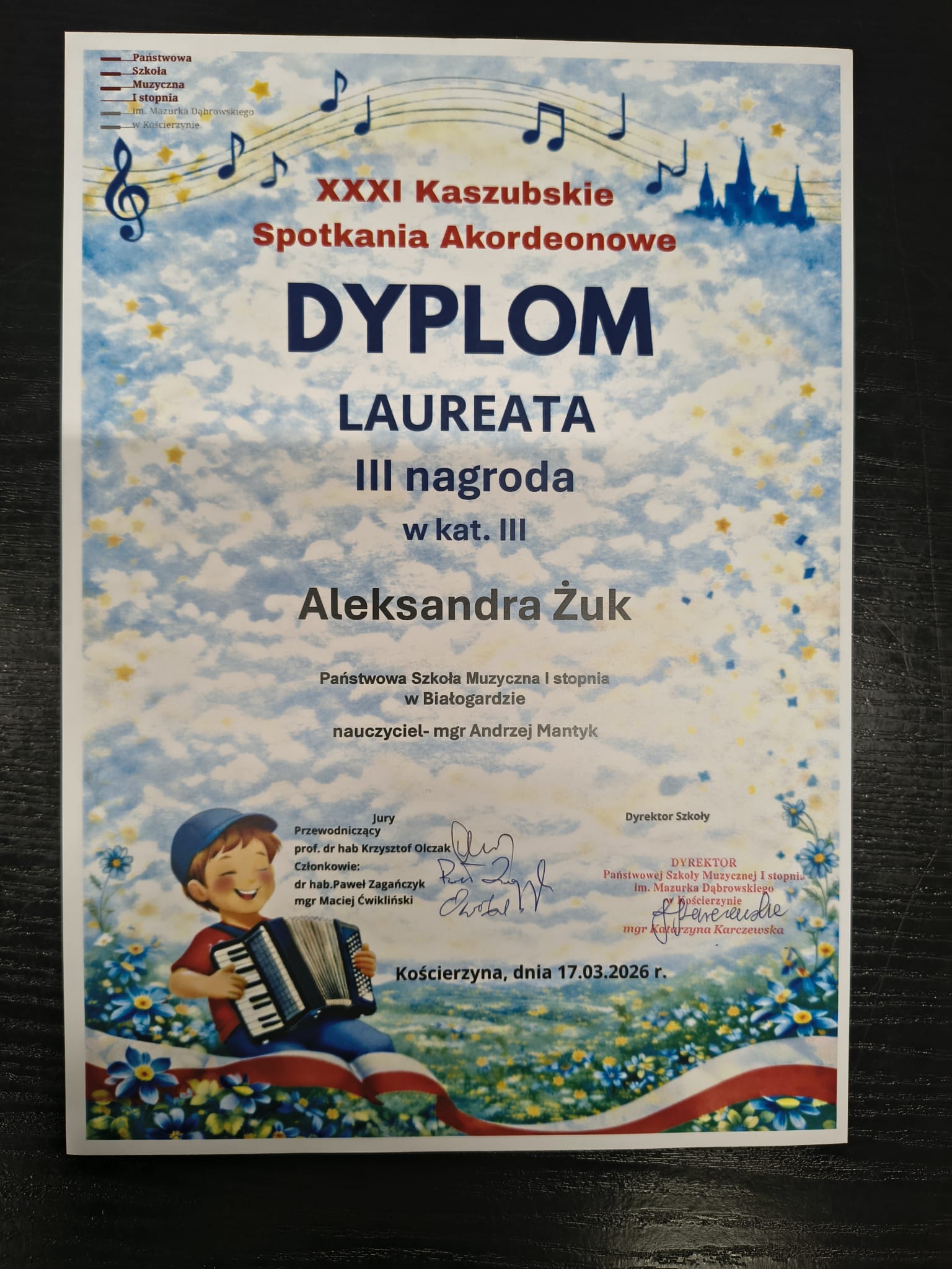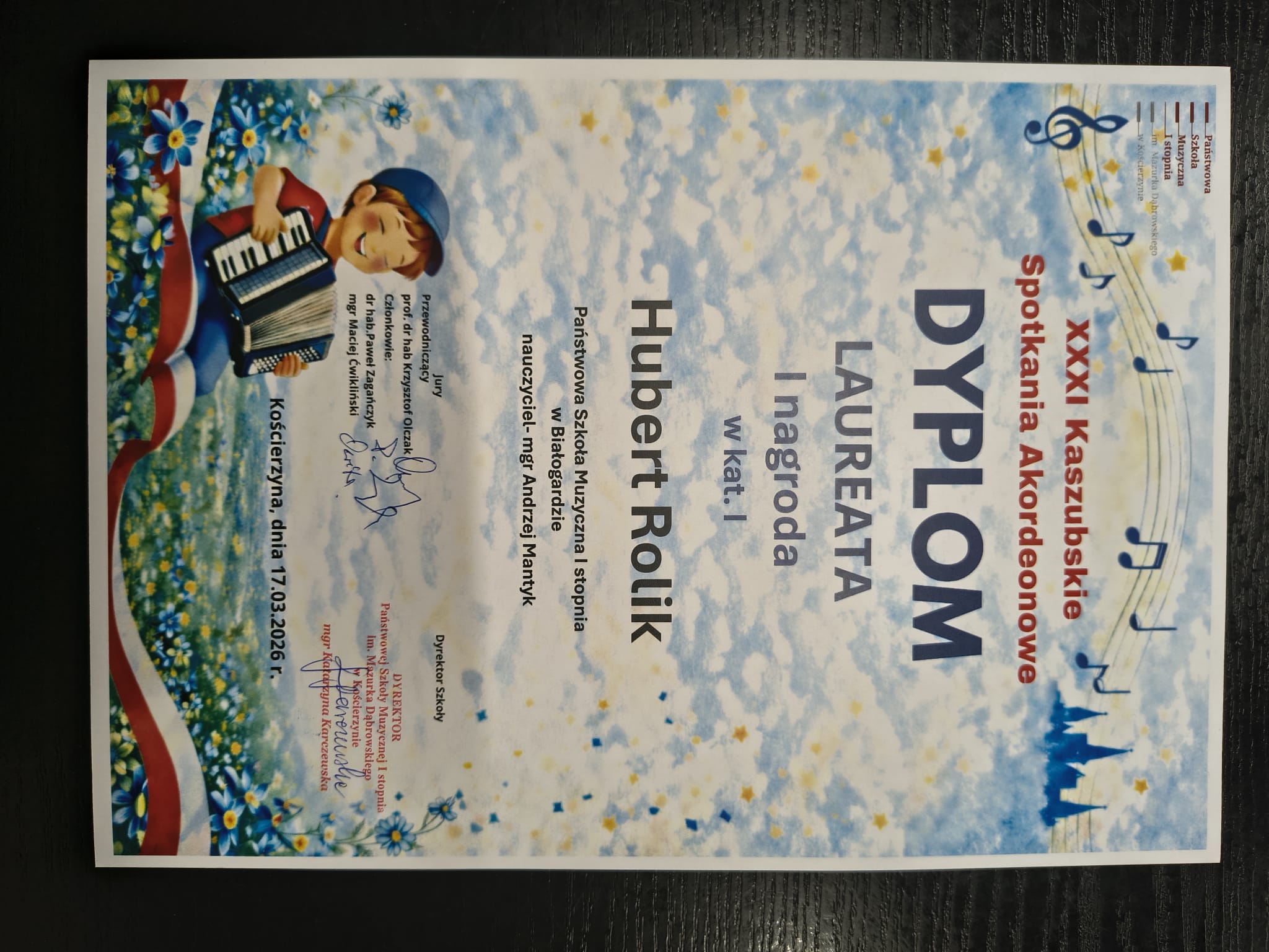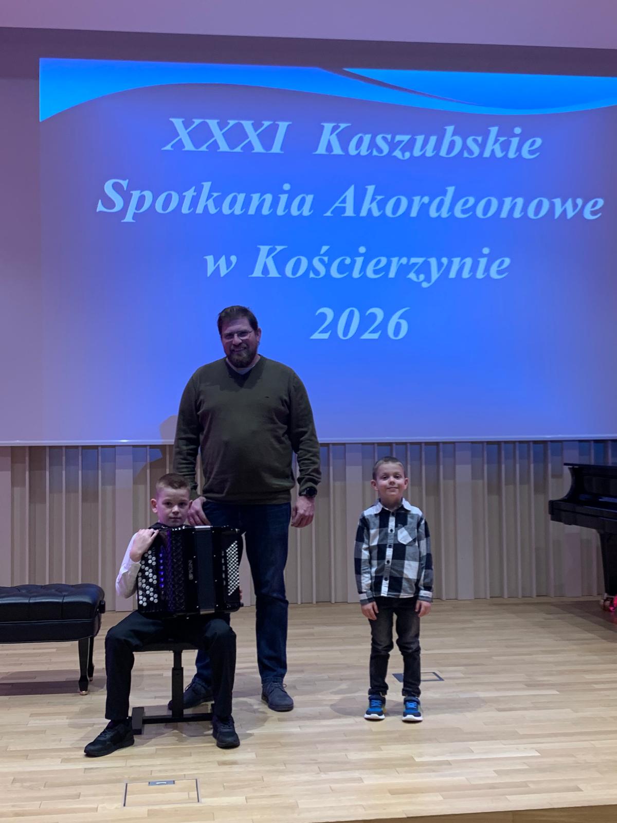 Dnia 17 marca 2026 roku uczniowie z klasy Pana Andrzeja Mantyka - Aleksandra Żuk, Hubert Rolik, Franciszek Kucper oraz Cyprian Korzeniewski - reprezentowali naszą szkołę na XXXI Kaszubskich Spotkaniach Akordeonowych. Konkurs miał zasięg makroregionalny. Hubert Rolik zdobył I miejsce (I kat.), natomiast Aleksandra Żuk zdobyła miejsce III (III kat.).