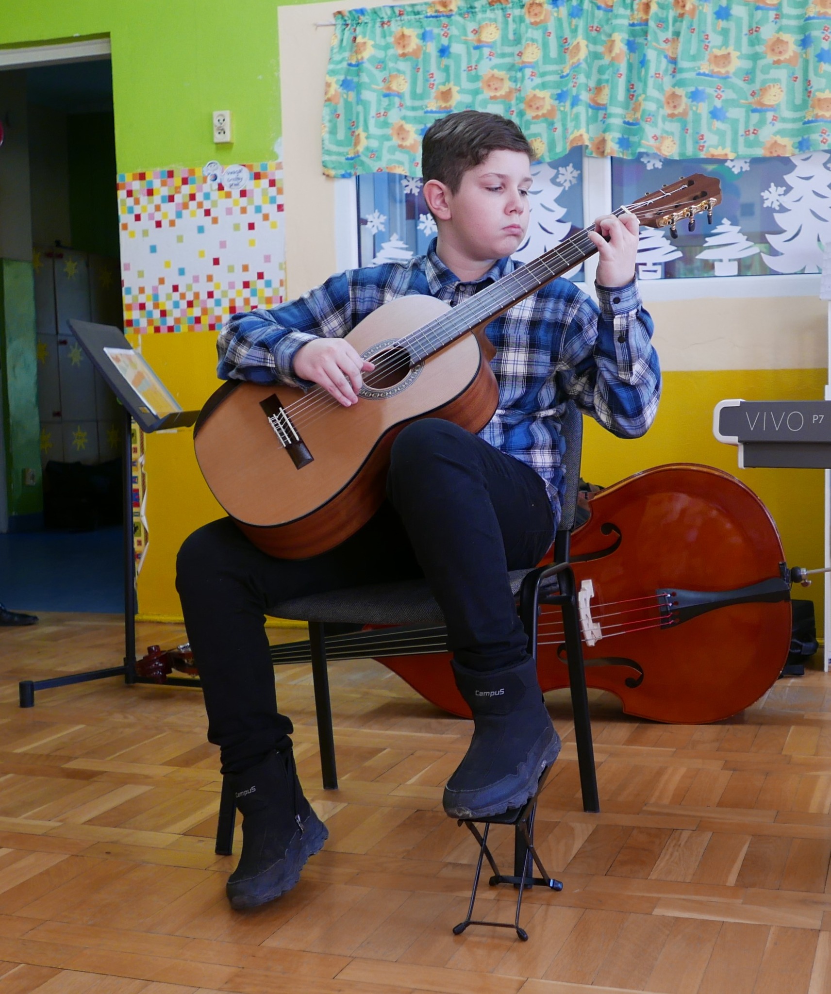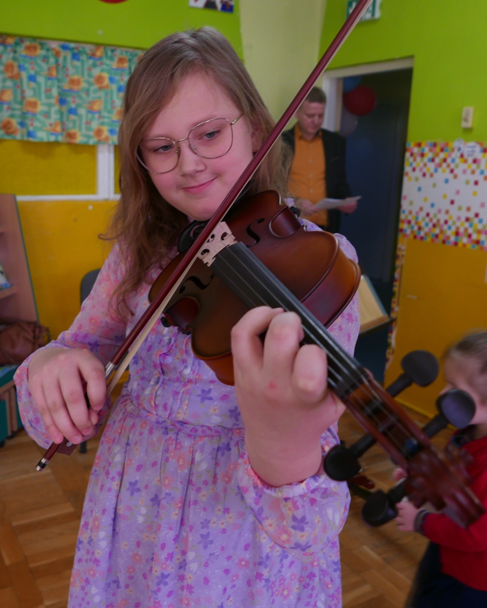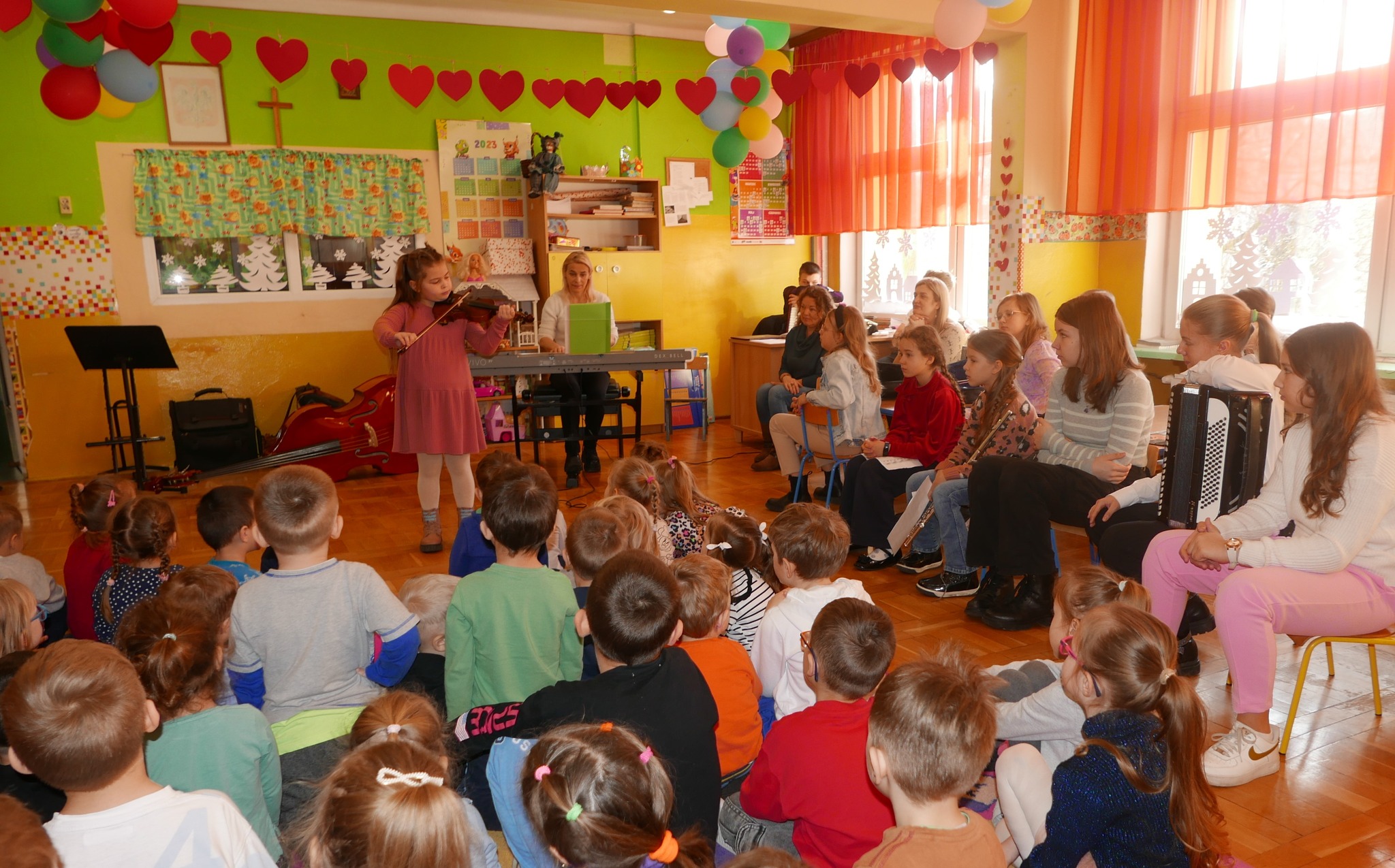 W koncercie wzięli udział: Gabrysia Barszczewska-fortepian, Laura Grzybowska-skrzypce, Zosia Czykwin-flet, Natalia Borowska-wiolonczela, Marysia Wołosik-akordeon, Pola Jurczuk-fortepian, Szymon Pauk-gitara, Lena Własiuk-skrzypce, Julia Mazuruk-kontrabas, Kornelia Pęczkowska-fortepian, Krzysztof Gierasimiuk-Chomicki-trąbka, Tymon Roszczyc-akordeon oraz Zosia Gierasimiuk-klarnet. Koncert poprowadził p. Ireneusz Ławreszuk. Uczniowie grali utwory skoczne i radosne, a przedszkolaki były zachwycone, że wykonawcy tak wesoło grają. Na zakończenie koncertu, młodzi słuchacze próbowali zatańczyć