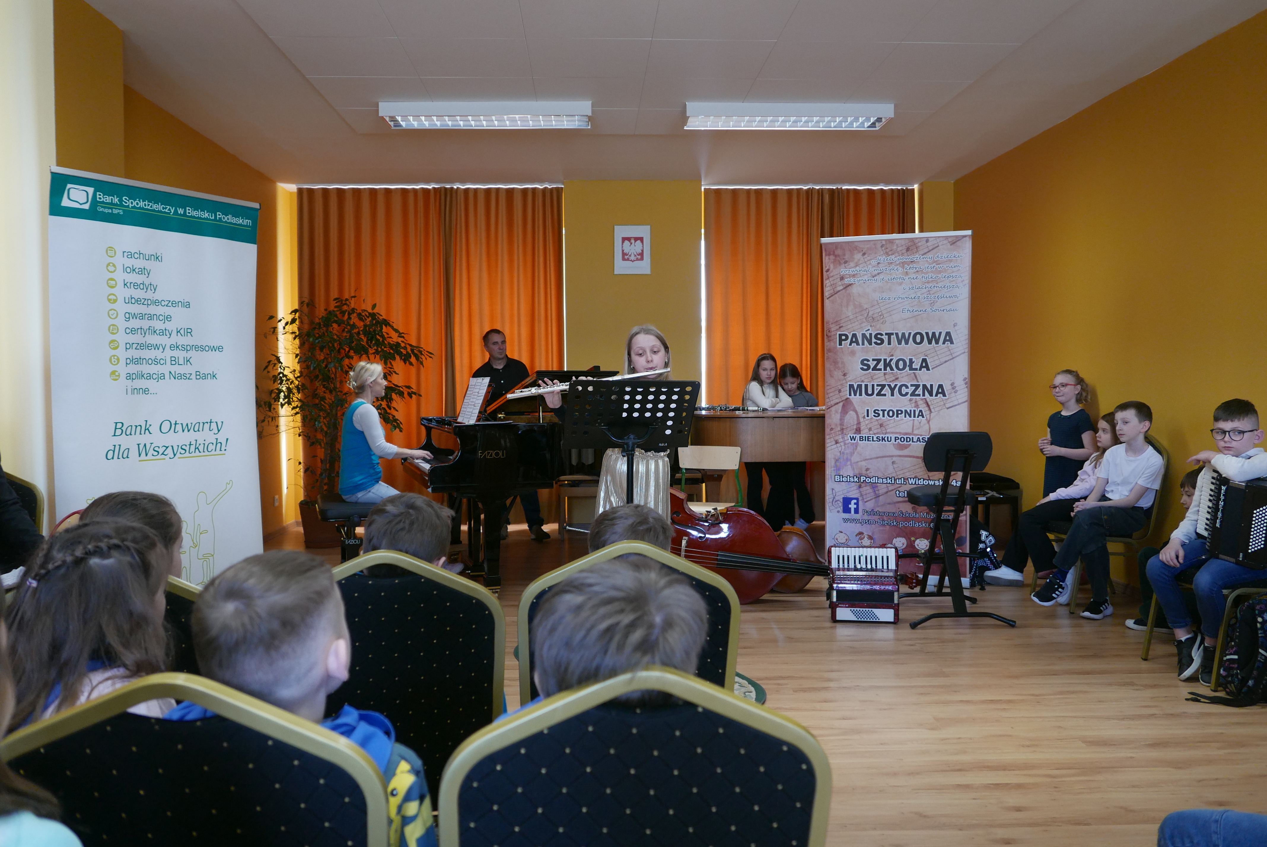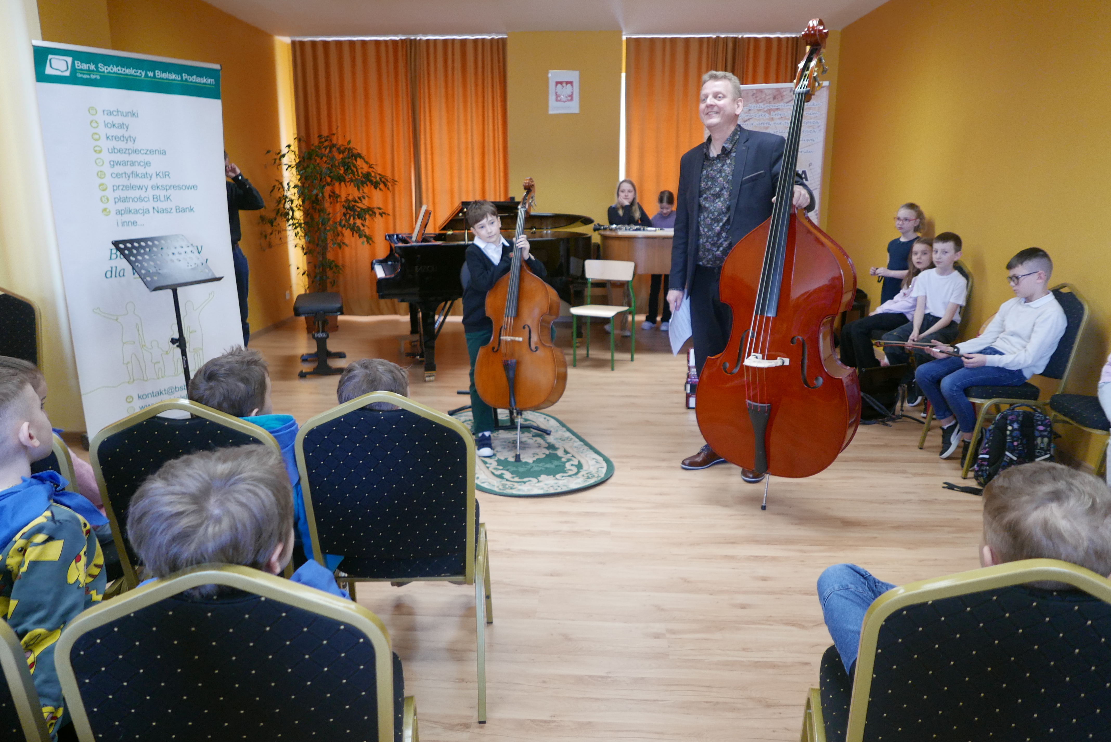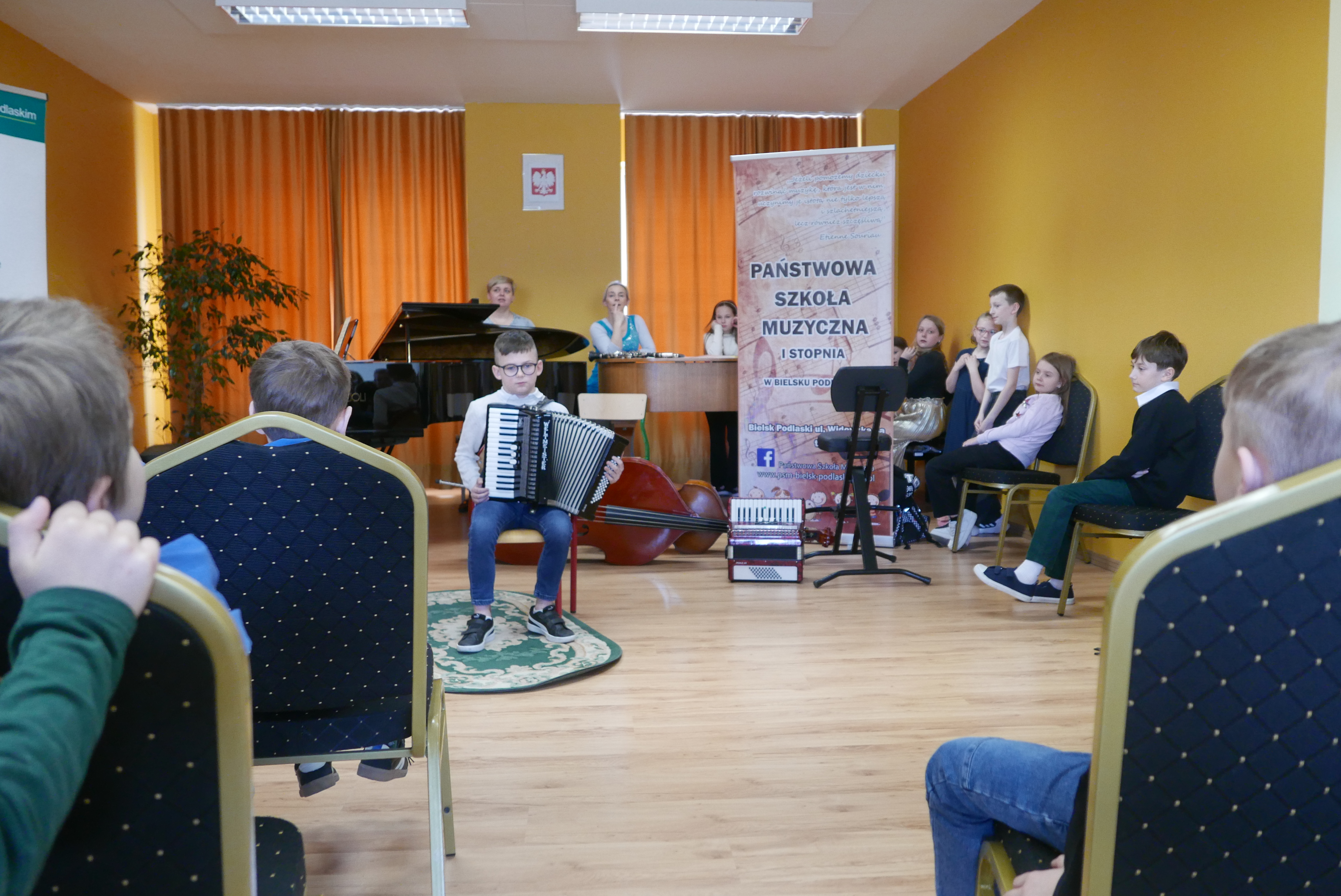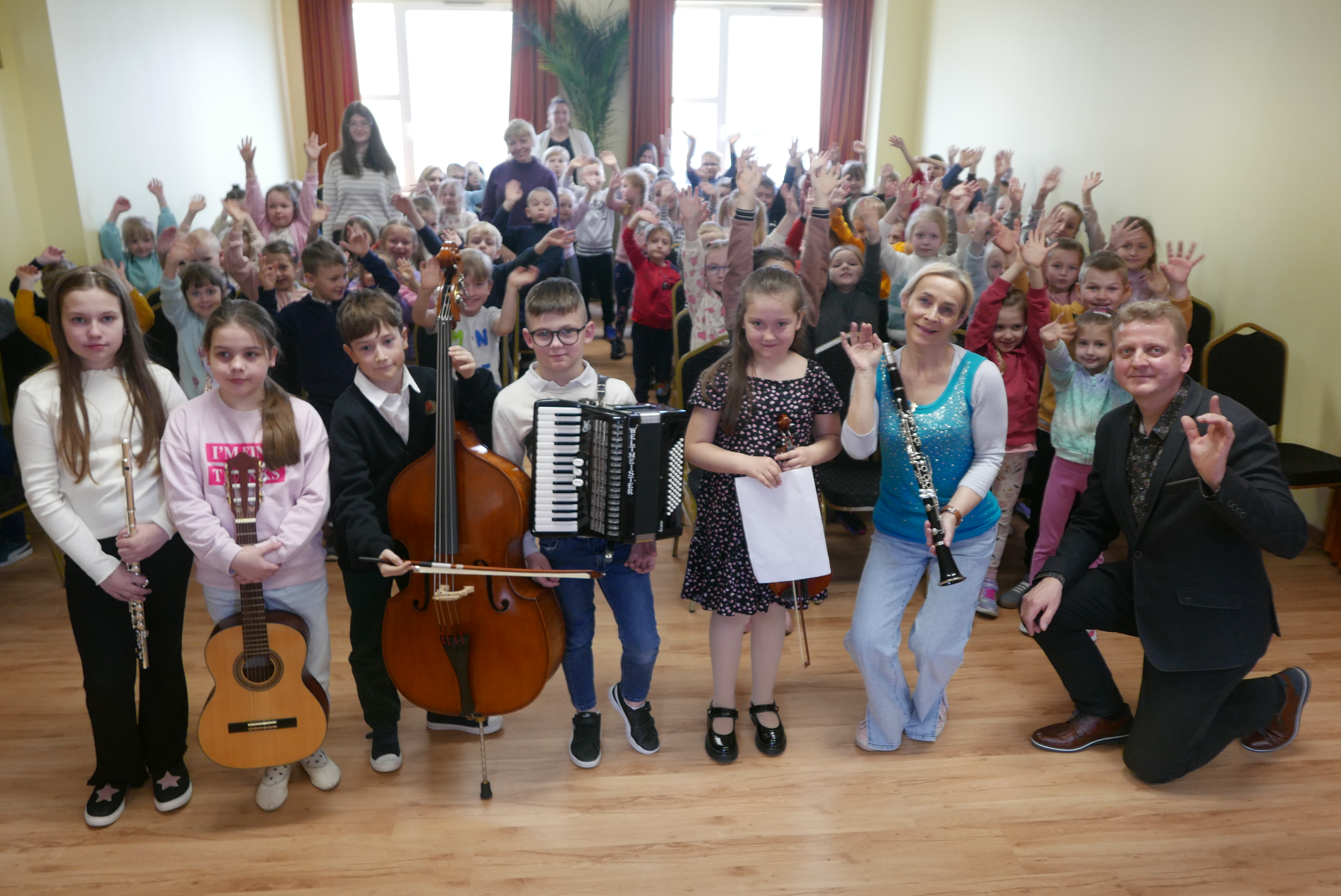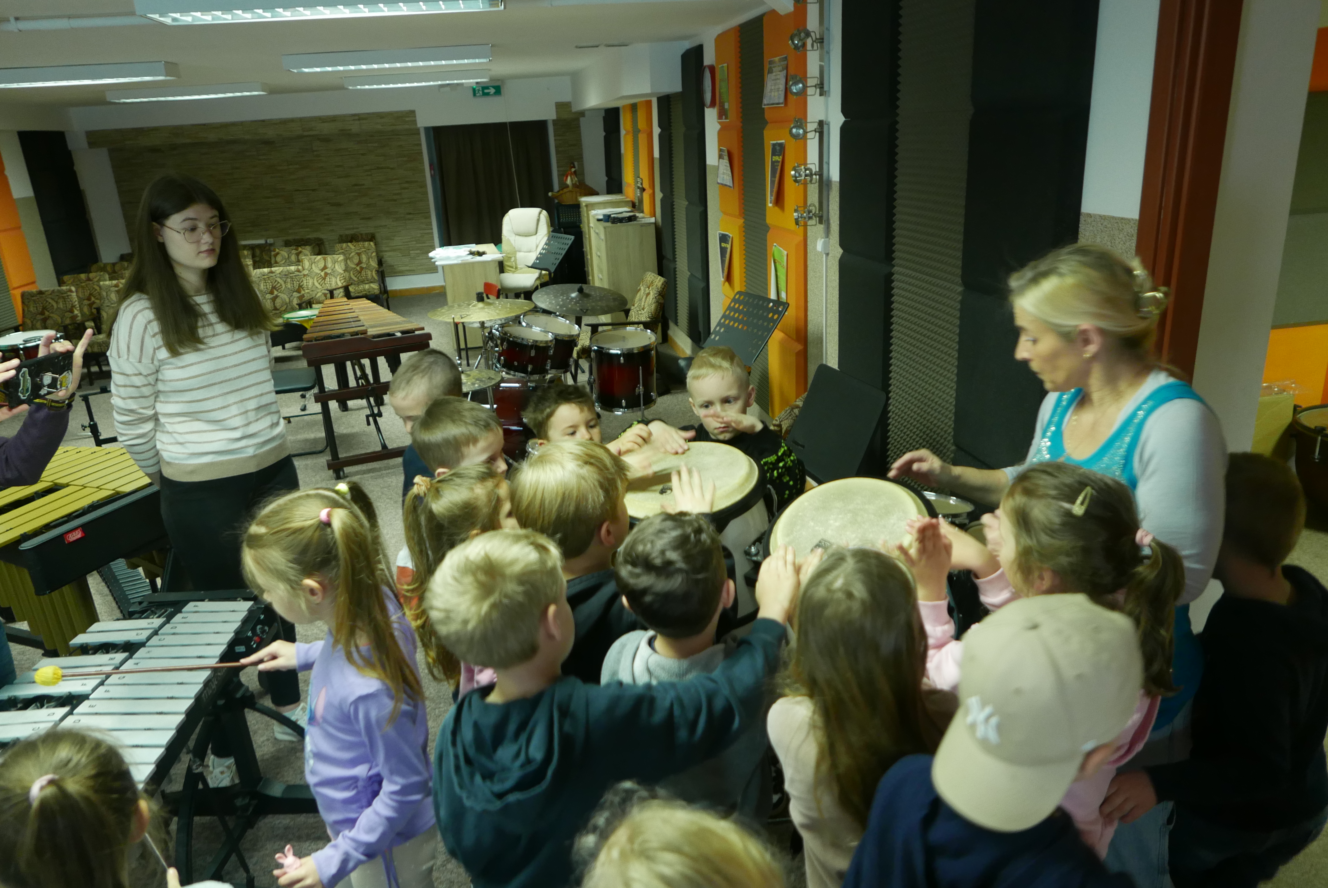 14 kwietnia 2025r., o godz. 9.30 gościliśmy w naszej szkole przedszkolaków wraz z opiekunami z Przedszkola nr 5 im. Krasnala Hałabały oraz z Przedszkola "Na Hołowiesku" działającym przy Parafii Opatrzności Bożej w Bielsku Podlaskim. O godz. 10.30 zawitały do nas grupy przedszkolne z Przedszkola nr 9 "Leśna Polana" oraz Katolickiego Przedszkola Niepublicznego "Karmelki". Swoje instrumenty oraz umiejętności prezentowali w większości byli wychowankowie tych placówek. Opiekunowie grup przedszkolnych z zachwytem wsłuchiwali się w dźwięki wydobywające się z poszczególnych instrumentów a dzieci chwaliły się, których uczniów PSM I st. znają z przedszkola. Pan Ireneusz Ławreszuk, przed każdym występem omawiał poszczególne instrumenty, opowiadał o kompozytorach oraz o utworach, które były wykonywane. Przedszkolaki były bardzo wsłuchane w dźwięki poszczególnych instrumentów. Po skończonych prezentacjach wszyscy chcieli uczyć się grać w szkole muzycznej! To wspaniale jest widzieć taki entuzjazm i chęci wśród dzieci!