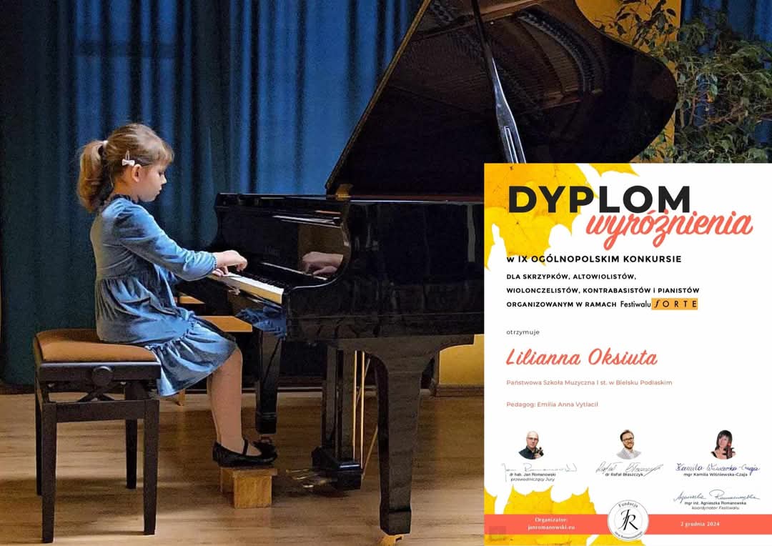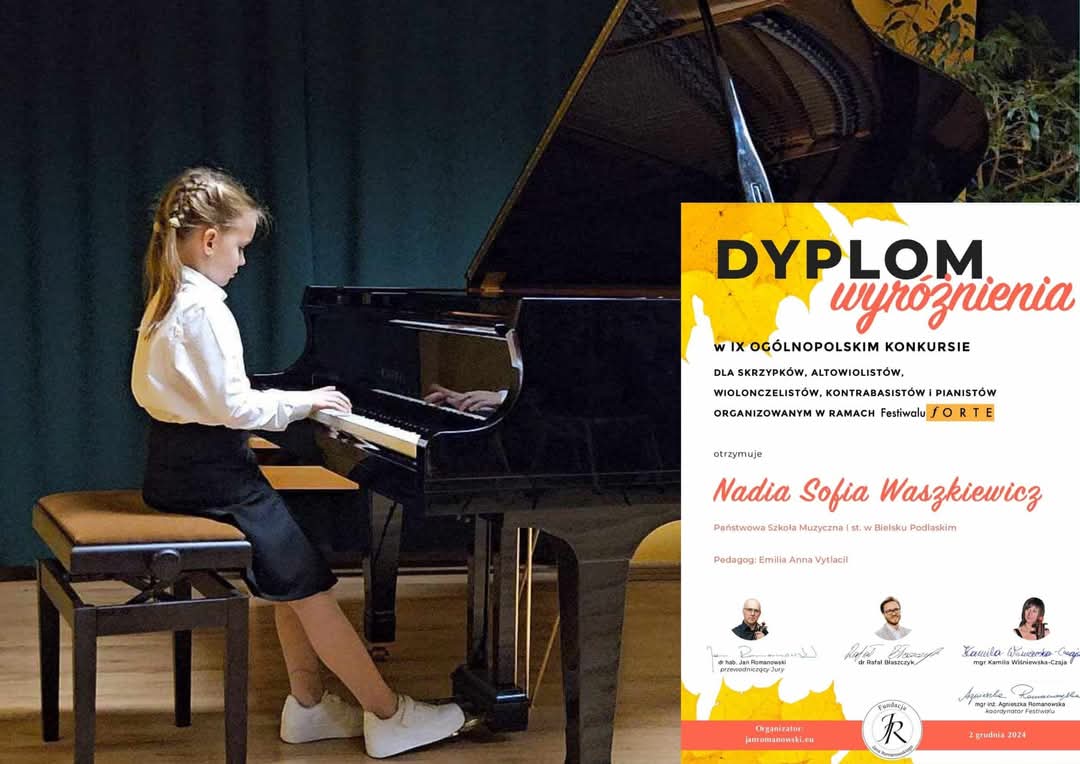 Młodzi pianiści reprezentujący klasę fortepianu Pani Emilii Vytlacil wzięli udział w IX Ogólnopolskim Konkursie organizowanym przez fundację Jana Romanowskiego w ramach Festiwalu Forte. Gratulujemy zdobycia wyróżnień w tym współzawodnictwie! Naszą szkołę reprezentowali Nadia Sofia Waszkiewicz z klasy IIc6, która pomimo krótkiego stażu nauki jest już weteranką konkursową - zawsze z sukcesami oraz Lilianna Oksiuta oraz Wojciech Czykwin z klasy Ic6, którzy świetnie zaprezentowali się po zaledwie dwóch miesiącach nauki gry na instrumencie! Brawo! Gratulujemy nauczycielce, p.Emilii Vytlacil, która przyczyniła sie do sukcesu swoch uczniów. Brawo! Jesteśmy z Was dumni i podziwiamy Waszą determinację i ciężką pracę.