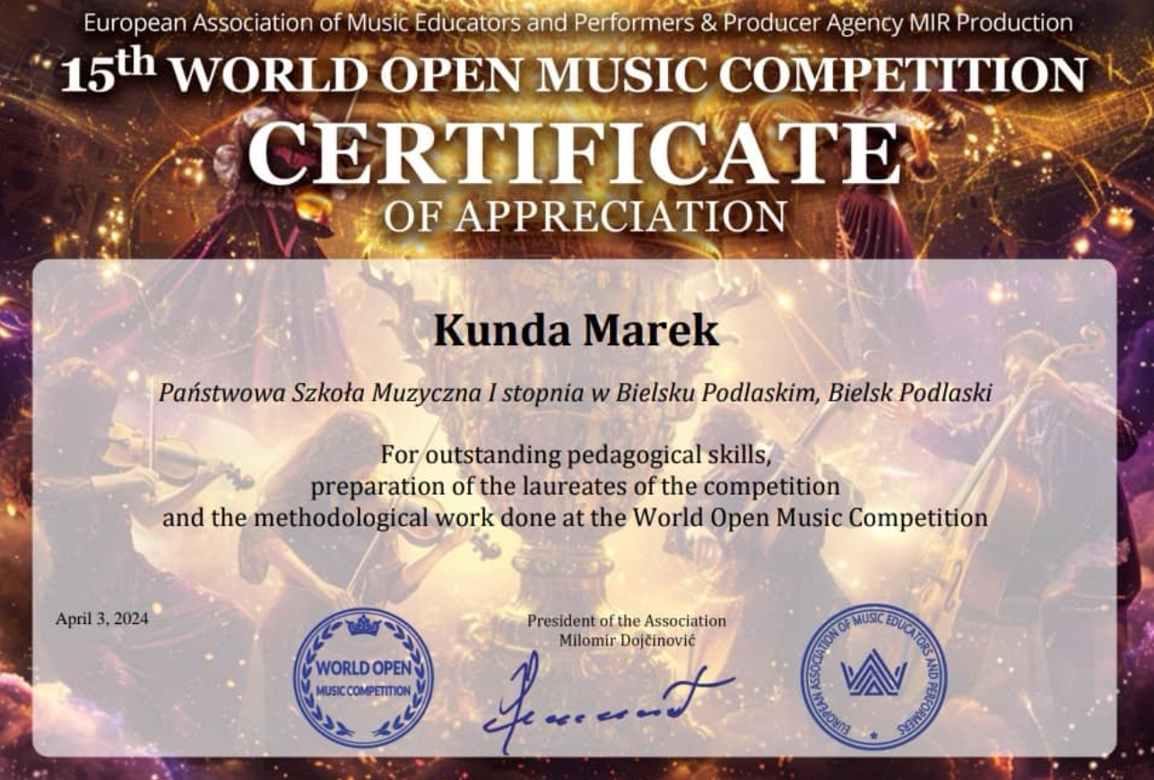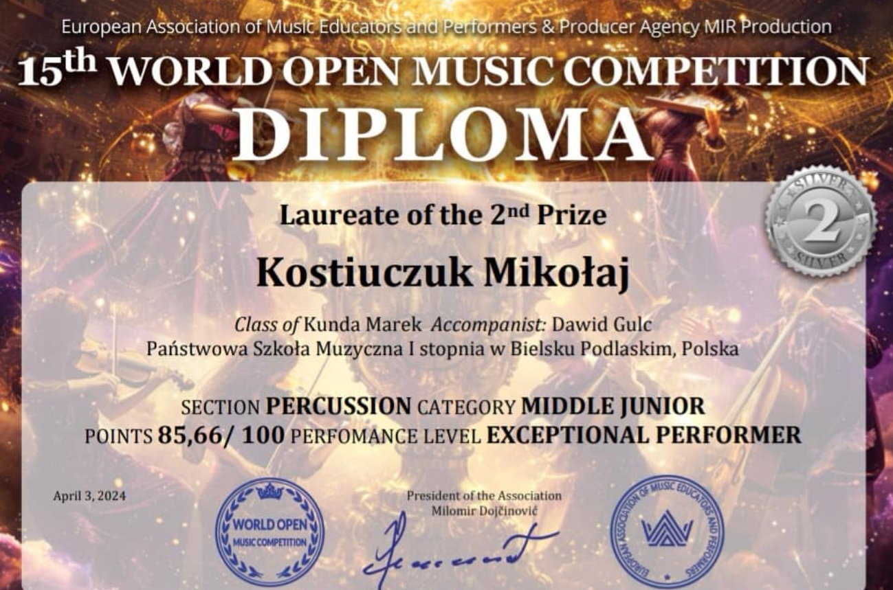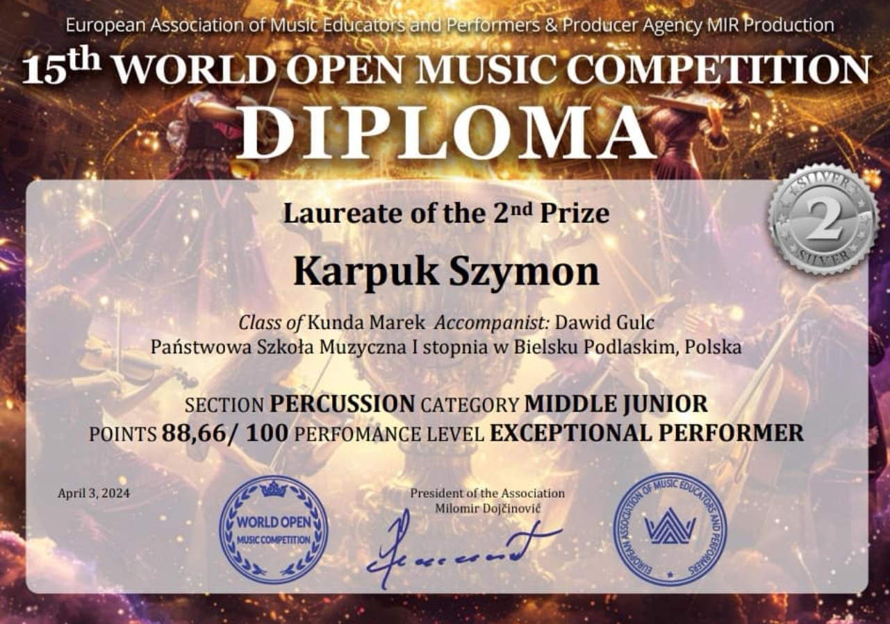 Szymon Karpuk uczeń klasy III cyklu sześcioletniego oraz Mikołaj Kostiuczuk uczeń klasy V cyklu sześcioletniego w klasie perkusji Pana Marka Kundy otrzymali drugie nagrody na World Open Online Music Competition 2024 . Gratulujemy ogromnego sukcesu i czekamy na dalsze osiągnięcia.