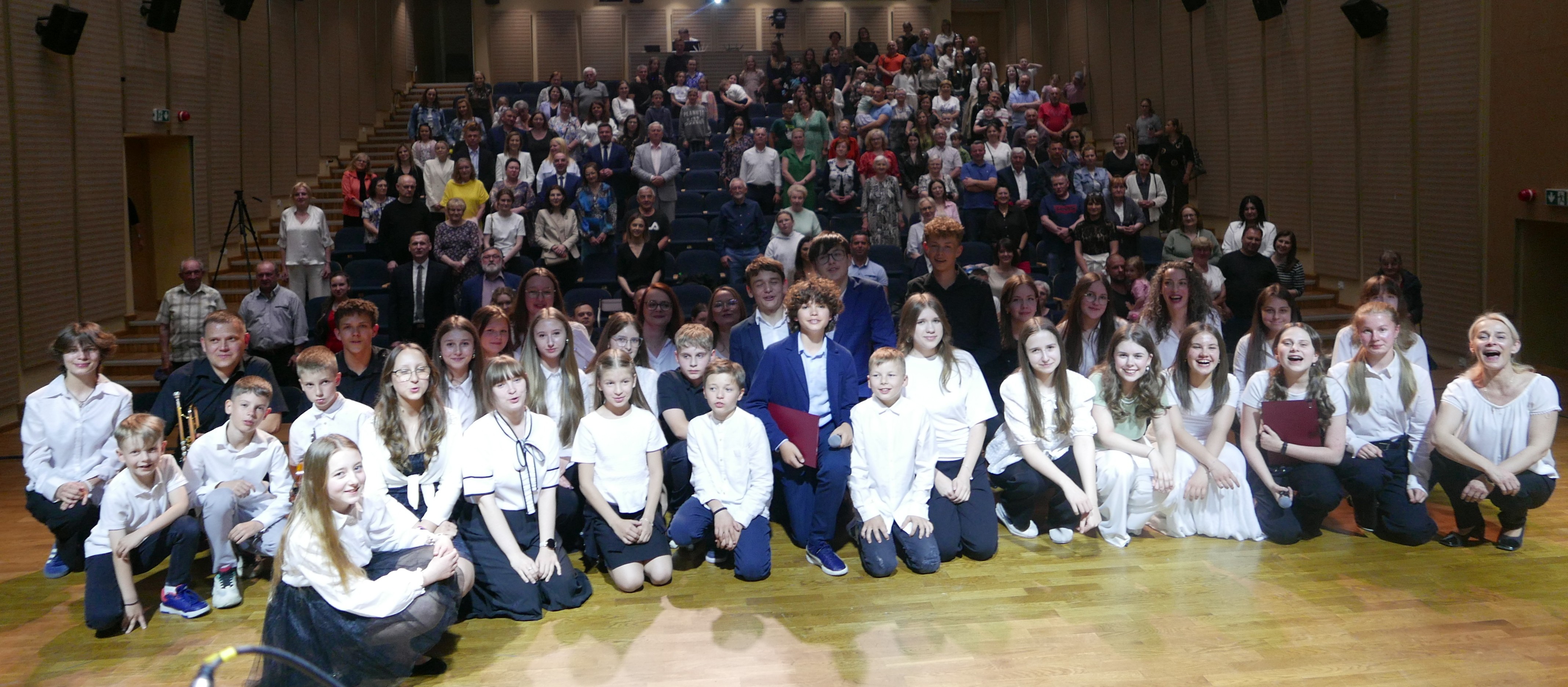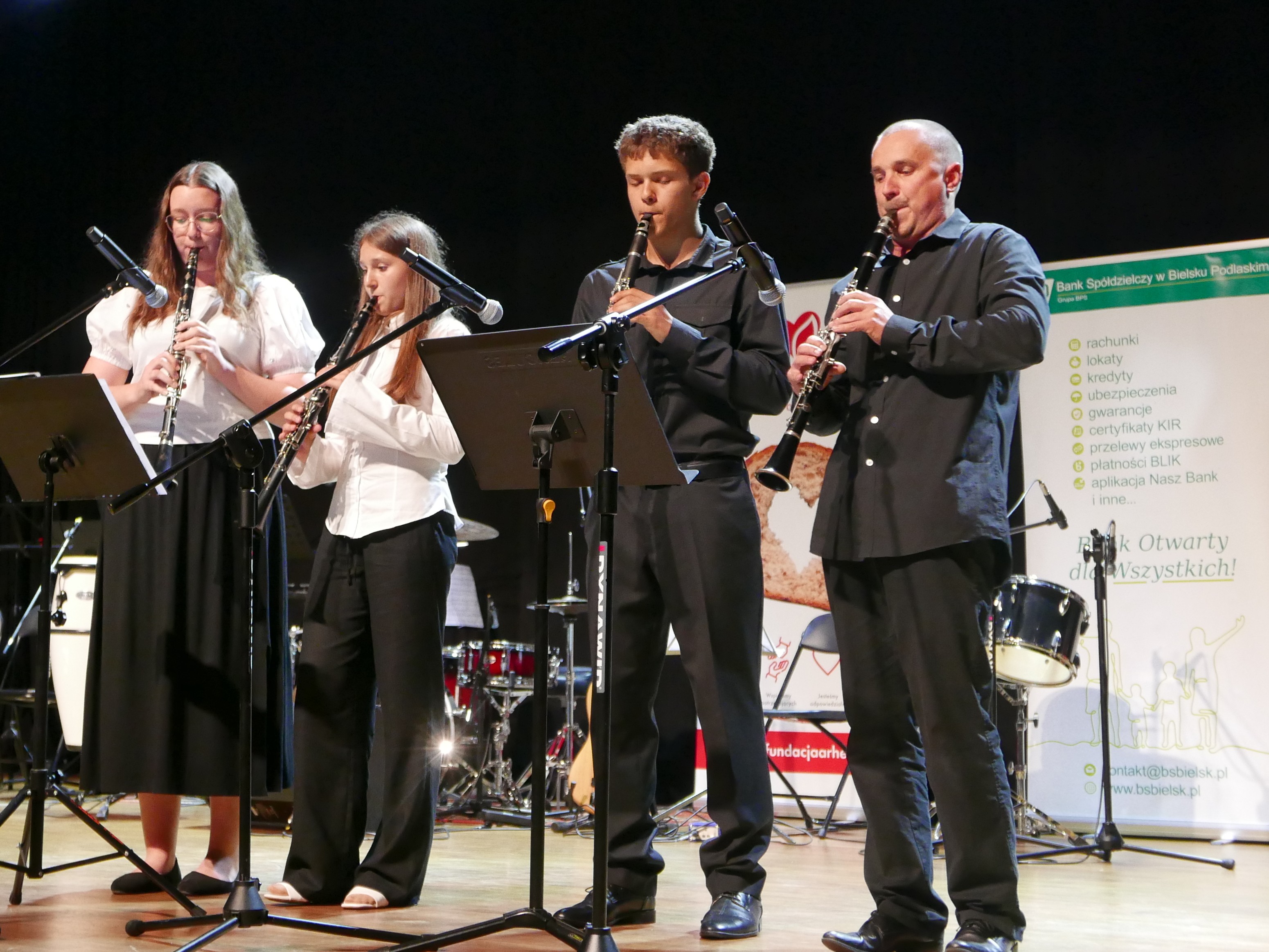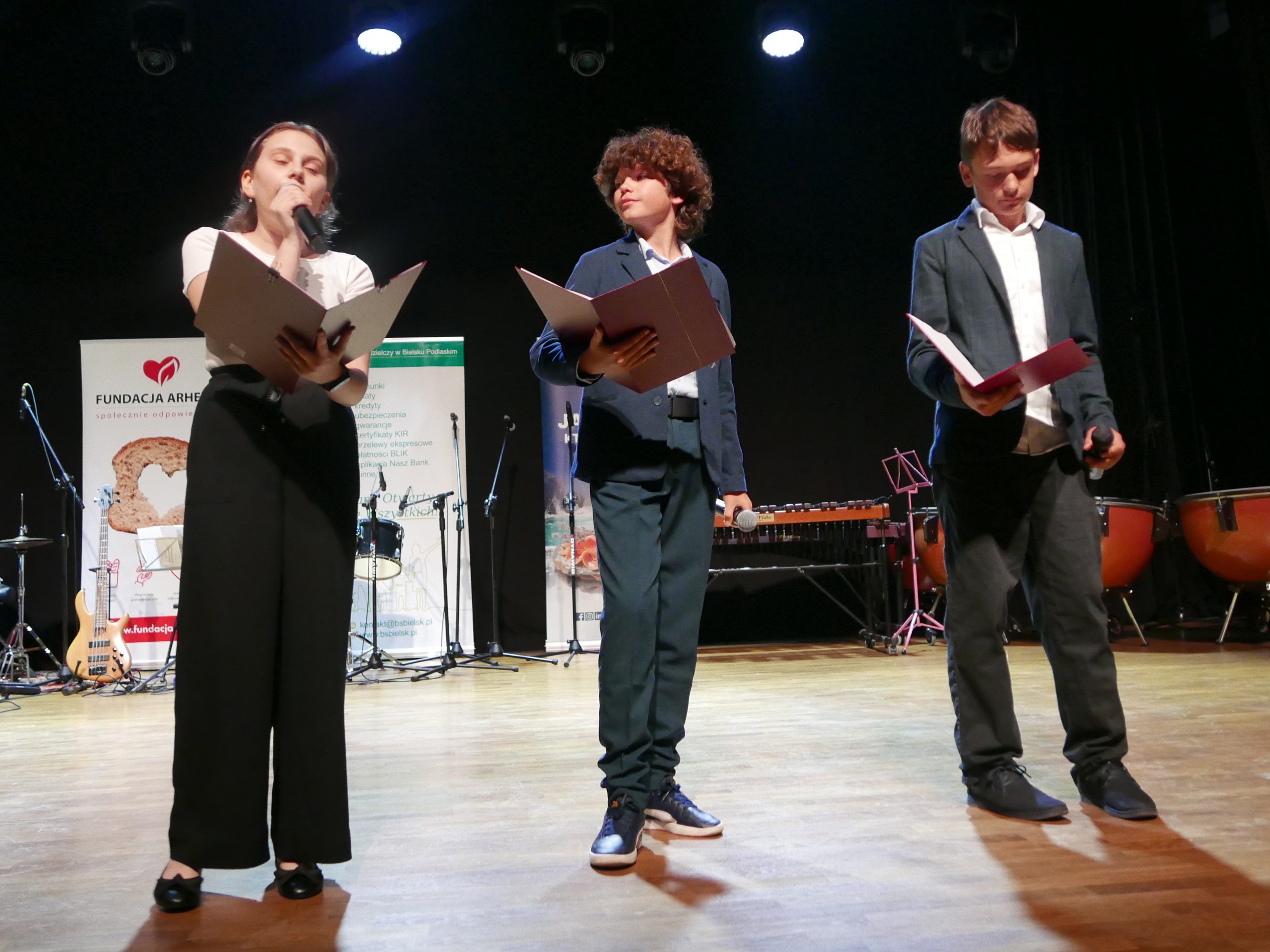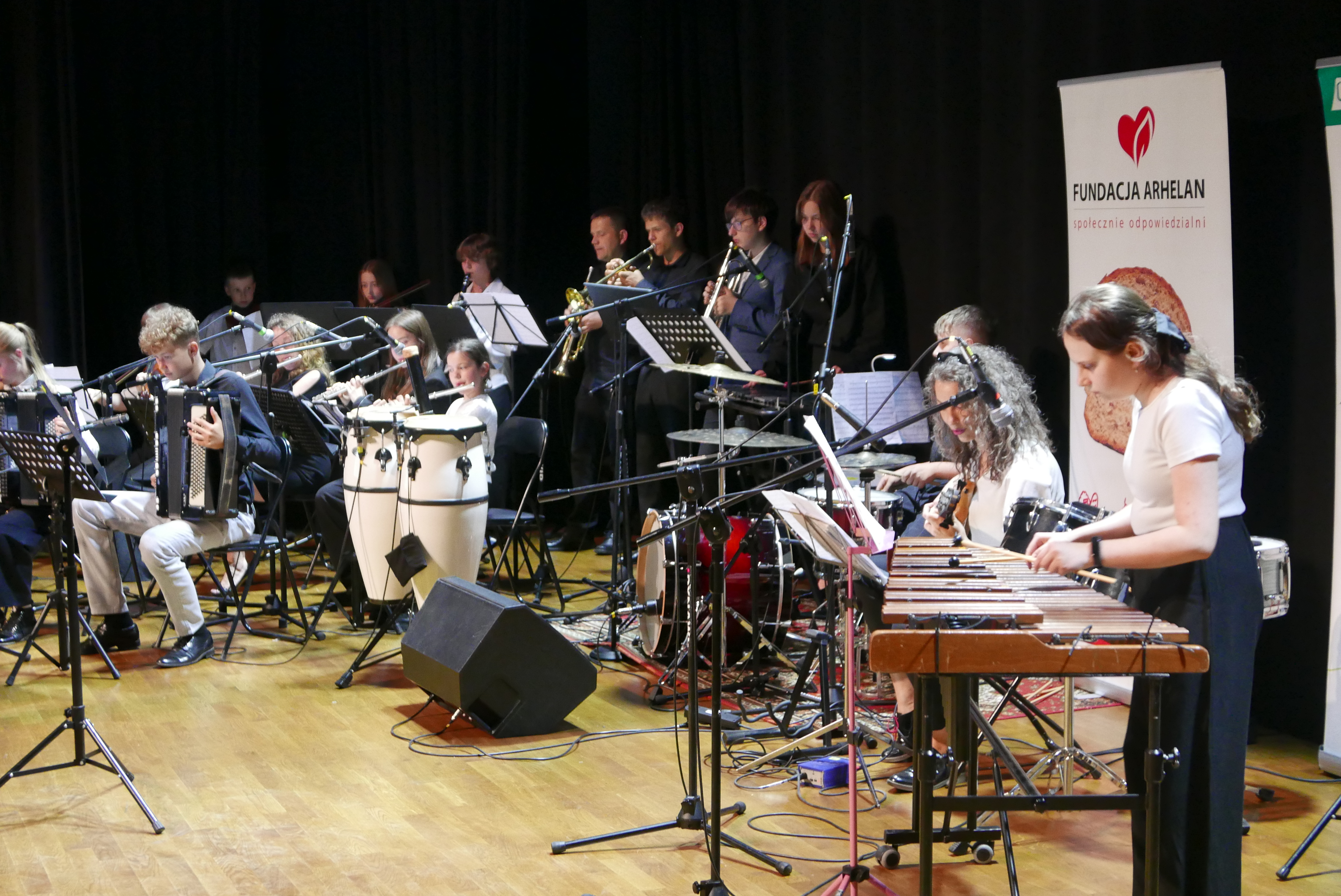 KONCERT DOROCZNY w ramach 43 Dni Miasta Bielska Podlaskiego, to doniosłe wydarzenie w kończącym się roku szkolnym. Uczestnictwo w koncercie to wielki zaszczyt i nobilitacja dla uczniów jak i pedagogów, zawsze grają ci którzy doskonale opanowali swój warsztat muzyczny. Nie inaczej było i w tym roku. Koncert otworzyła Pani Dyrektor Edyta Lebieżyńska, której towarzyszył Przewodniczący Rady Rodziców Pan Piotr Daniło. Powitano Burmistrza Miasta Pana Piotra Wawulskiego, Panią Wice Burmistrz Iwonę Kołos, Wójta Gminy Bielsk Pana Walentego Koryckiego, przedstawicieli Starostwa Bielskiego, Panią Agatę Michałowską-Dyrektor Departamętu Kultury Urzędu Marszałkowskiego, Prezesa Banku Spółdzielczego w Bielsku Podlaskim Pana Piotra Bobla, właściciela firmy „Arhelan” Pana Mirosława Burzyńskiego, przedstawicieli firmy „Suempol” oraz wielu innych zaproszonych gości i wspaniałą publiczność. Pani Dyrektor podziękowała naszemu sponsorowi strategicznemu Bankowi Spółdzielczemu za pomoc w realizacji przedsięwzięć szkolnych. Słowa podziękowania skierowane zostały do firmy „Arhelan” za pomoc przy oprawie koncertów i ognisk szkolnych. Szczególne podziękowania popłynęły do firmy „Suempol”, która przyczyniła się do zakupu ławy fortepianowej „Fazioli”. Następnie rozpoczął się koncert brawurowo poprowadzony przez trójkę konferansjerów w osobach Julii Daniło, Mikołaja Kosińskiego i Maksymiliana Kosińskiego. Część pierwszą rozpoczął Ludowy Zespół Pieśni i Tańca „Podlaskie Kukułki” w którym grają nauczyciele z naszej szkoły, następnie grali soliści, kwartety instrumentalne- fletowy i klarnetowy, zespół perkusyjny. W czasie przygotowań do drugiej części koncertu, nauczyciel naszej szkoły Pan Ireneusz Ławreszuk odczytał długą listę sukcesów odniesionych przez uczniów Państwowej Szkoły Muzycznej I stopnia w Bielsku Podlaskim. Były to konkursy instrumentalne: perkusyjne, fortepianowe, fletowe, trąbki, klarnetowe -na których uczniowie szkoły zajęli wysokie lokaty. Pan Ławreszuk poinformował o wymienione wszystkich pianin i fortepianów, a to dzięki staraniom naszej Pani Dyrektor która pozyskała na ten cel środki z Ministerstwa Kultury i Dziedzictwa Narodowego. Szczególnie dumni jesteśmy z zakupu fortepianu klasy mistrzowskiej Firmy „Fazioli”. Zakupiono wibrafon renomowanej firmy „Adams”, dużą tablicę multimedialną, instrumenty perkusyjne, skrzypce, flety i wiele innych potrzebnych akcesoriów muzycznych. Następnie były podziękowania dla wszystkich sponsorów i współpracujących z naszą szkołą jak: firmia Unibus z Bielska Podlaskiego, Nadleśnictwo Bielsk Podlaski, Bank Spółdzielczy z Brańska, Firma Kandel z Brańska, Spółdzielnia Mieszkaniowej z Bielska Podlaskiego, Zarząd Dróg z Bielska Podlaskiego, parafie rzymsko katolickim i prawosławne z miasta Bielska, przedszkola, szkoły podstawowym i średnie. W tym czasie na ekranie wyświetlane były zdjęcia z koncertów szkolnych z ostatniego roku które mieliśmy na terenie miasta i województwa( sporo ich było), dyplomy uczestników konkursów i przeglądów instrumentalnych. Drugą część Koncertu Dorocznego rozpoczął występ zespołu instrumentalnego Ad Libitum, a po nim kończący koncert Zespół Rodzinny. Na koniec była wspólna fotografia wszystkich wykonawców ze wspaniałą publicznością.