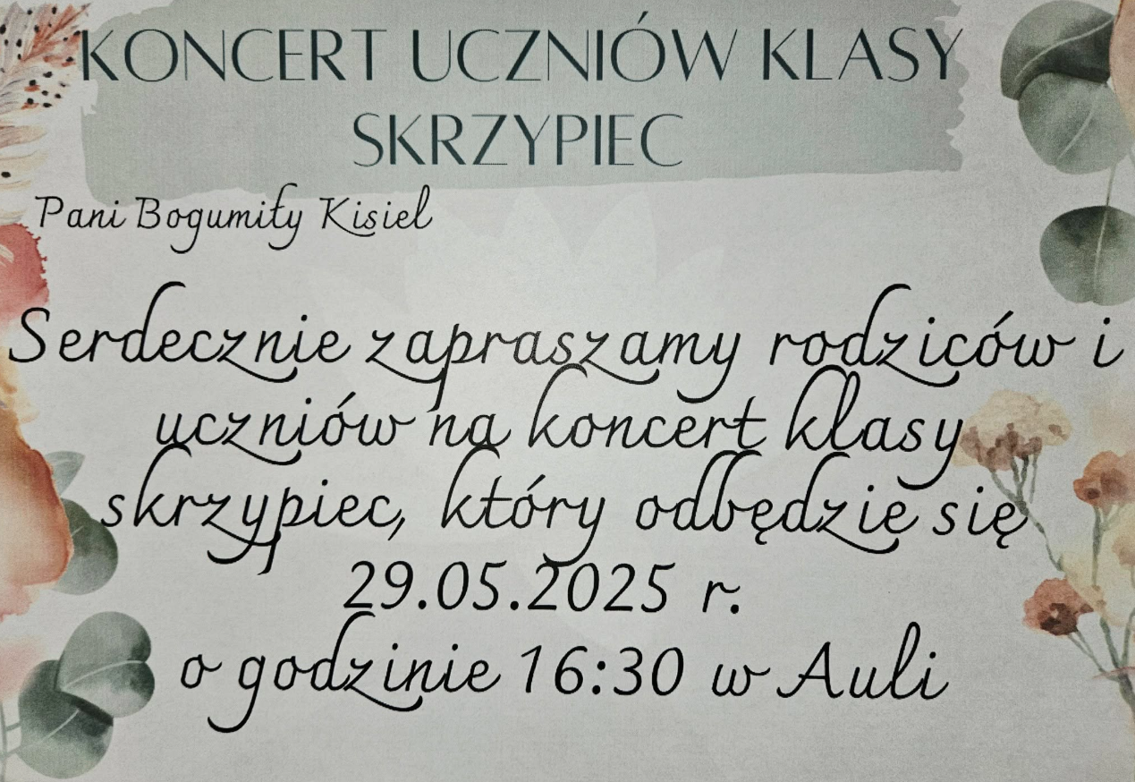 W dniu 29.05.2025 r. odbył się koncert w wykonaniu uczniów klasy skrzypiec p.Bogumiły Kisiel. Uczniowie grali utwory z towarzyszeniem akompaniamentu fortepianu p.Magdaleny Włodarczyk. Usłyszeliśmy wiele ciekawych utworów, w tym również duet i zespół skrzypcowy. Wykonawcy otrzymali gromkie brawa za piękne wykonania przygotowanych utworów.