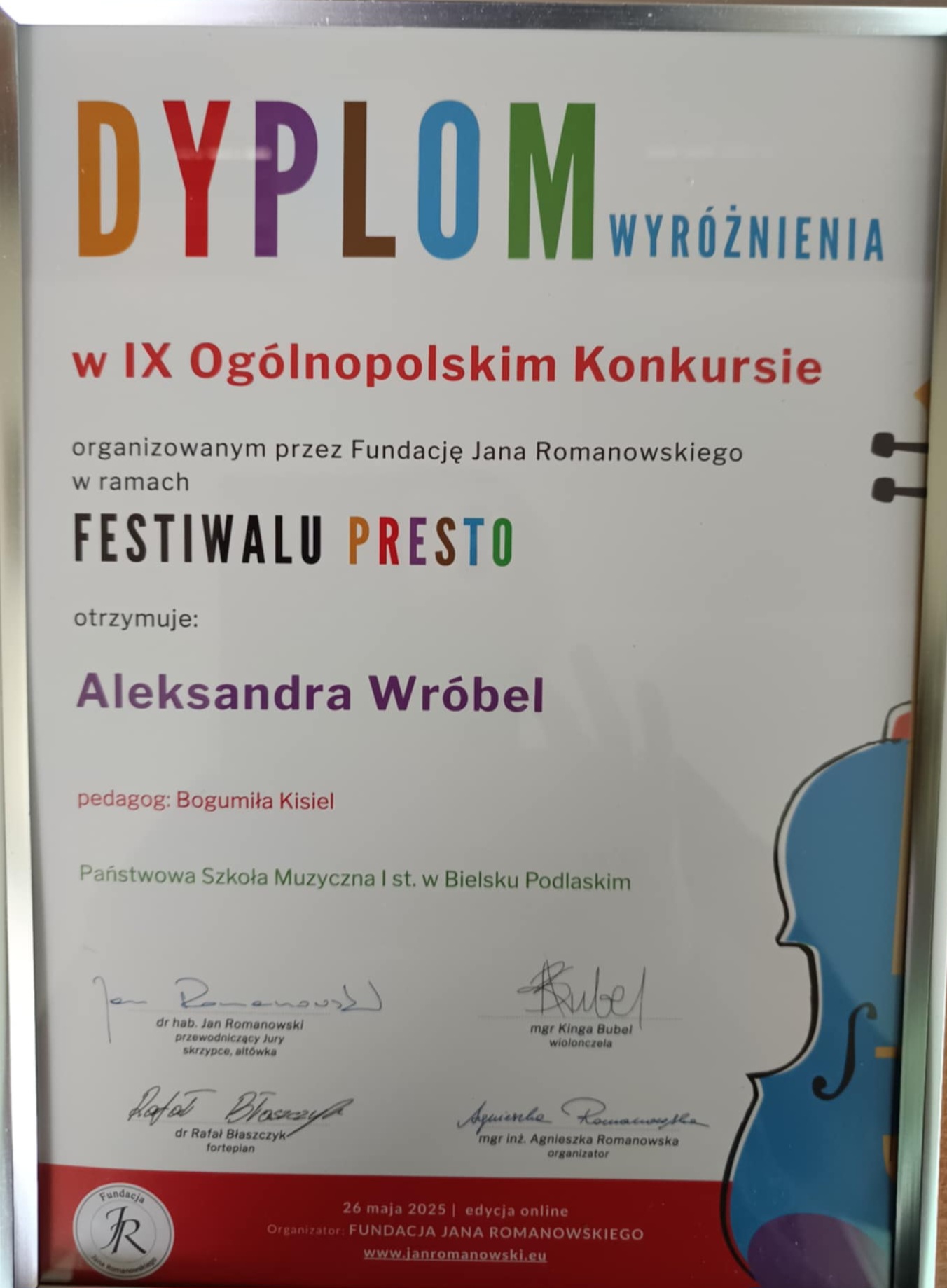 Już kolejny raz uczennica naszej szkoły Aleksandra Wróbel , z kl.II c.4 skrzypiec p.Bogumiły Kisiel została zauważona i doceniona przez Jury konkursowe, zdobywając wyróżnienie w IX OgólnopolskimKonkursie w ramach Festiwalu Presto. Akompaniował p.Magdalena Włodarczyk.