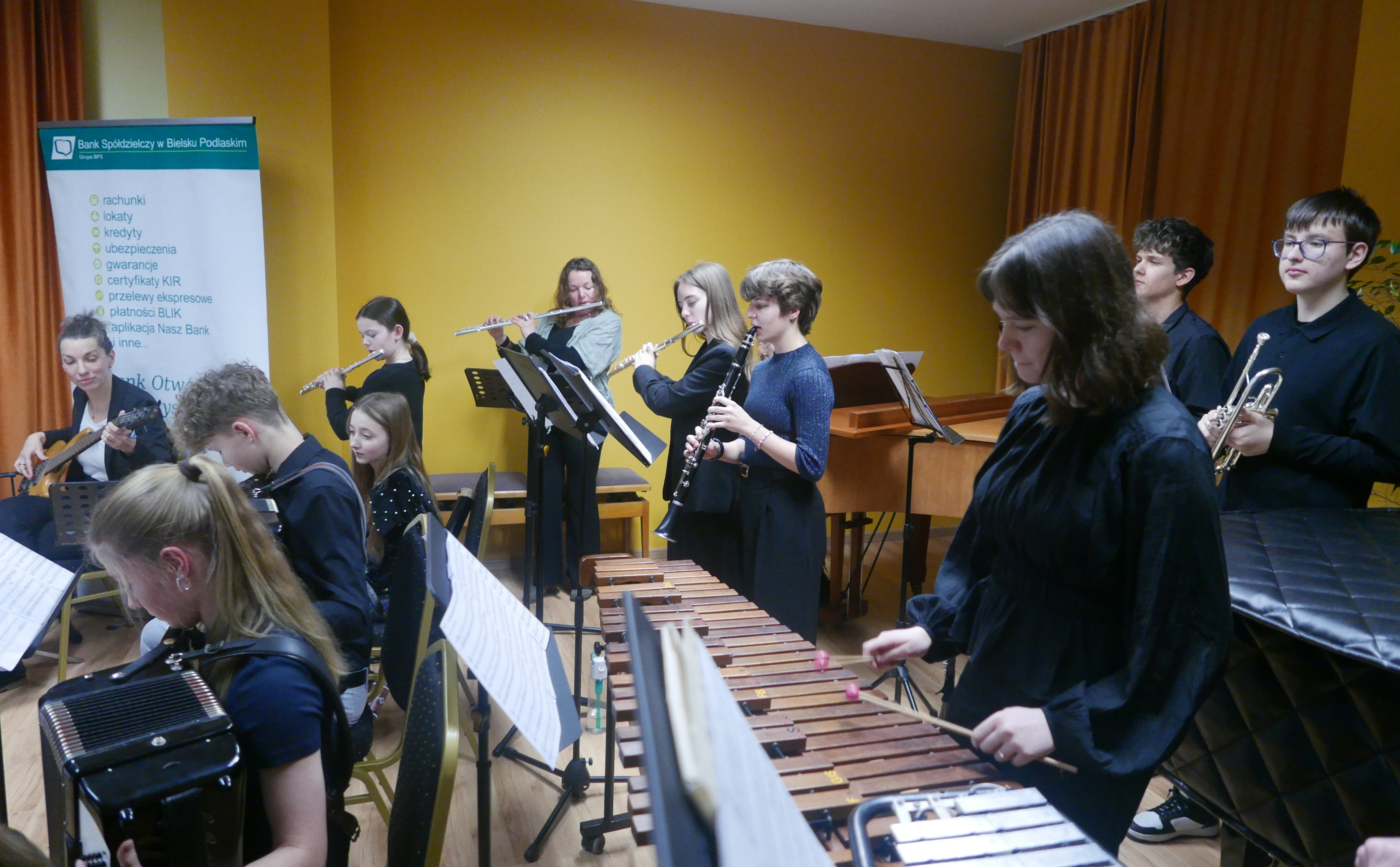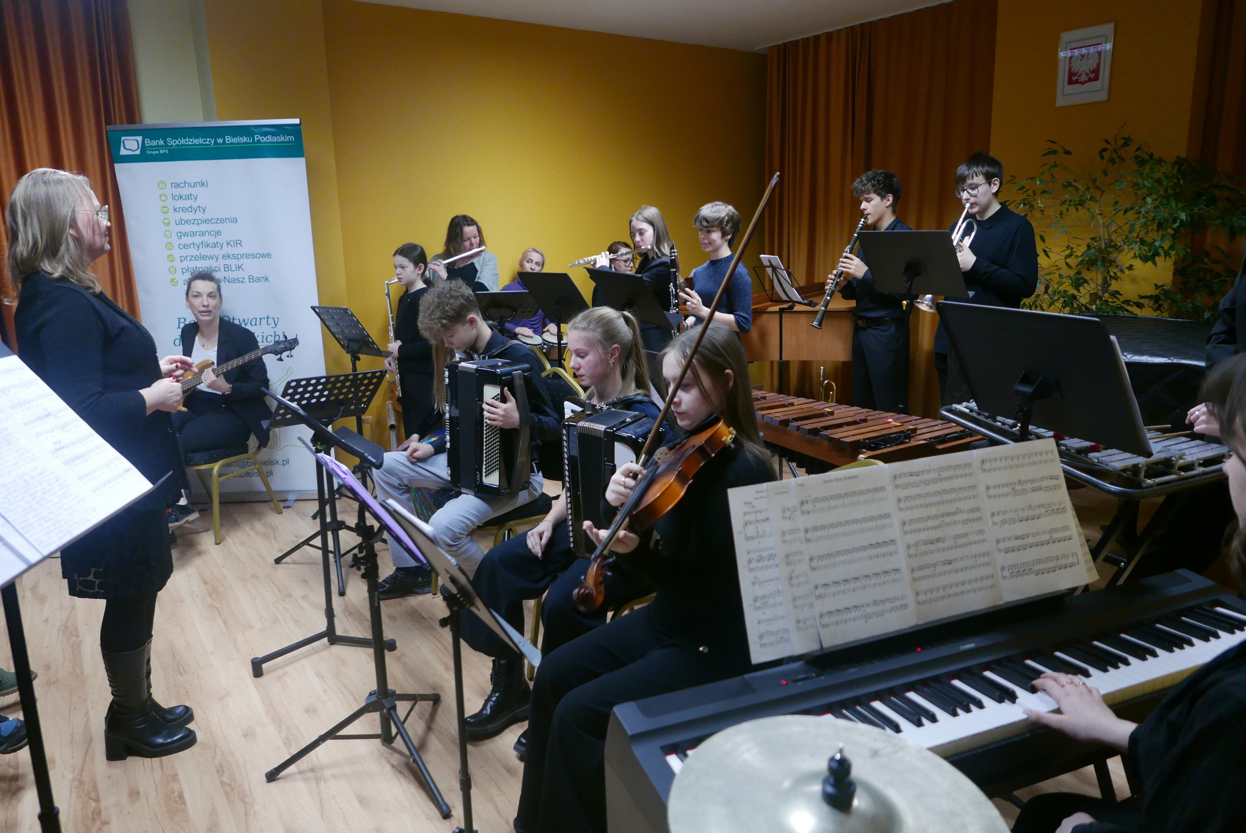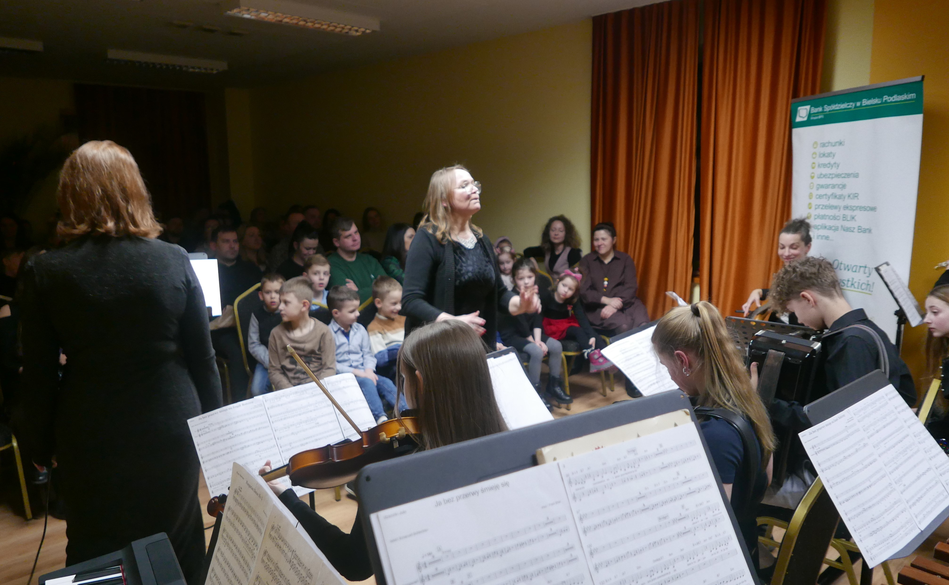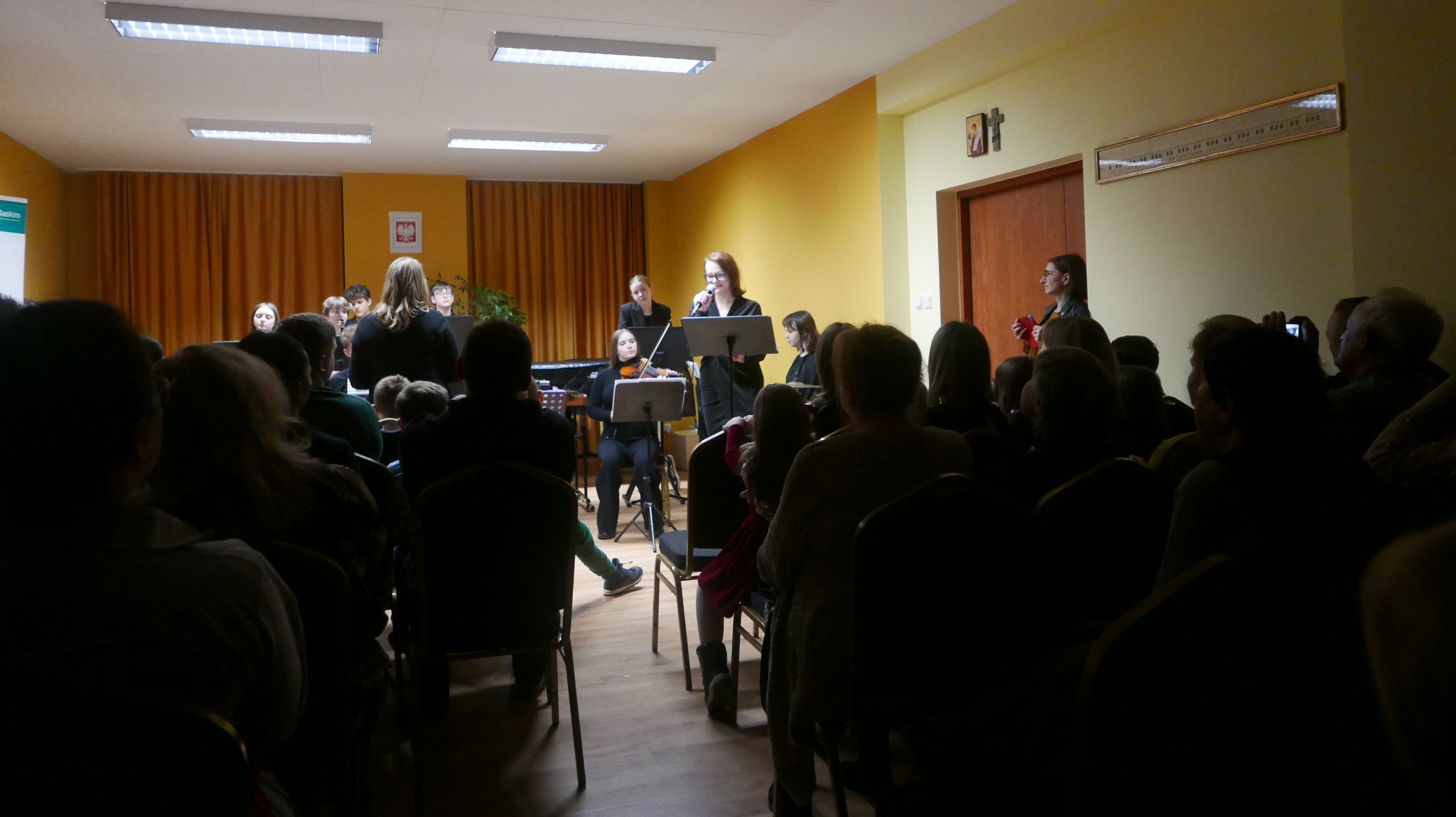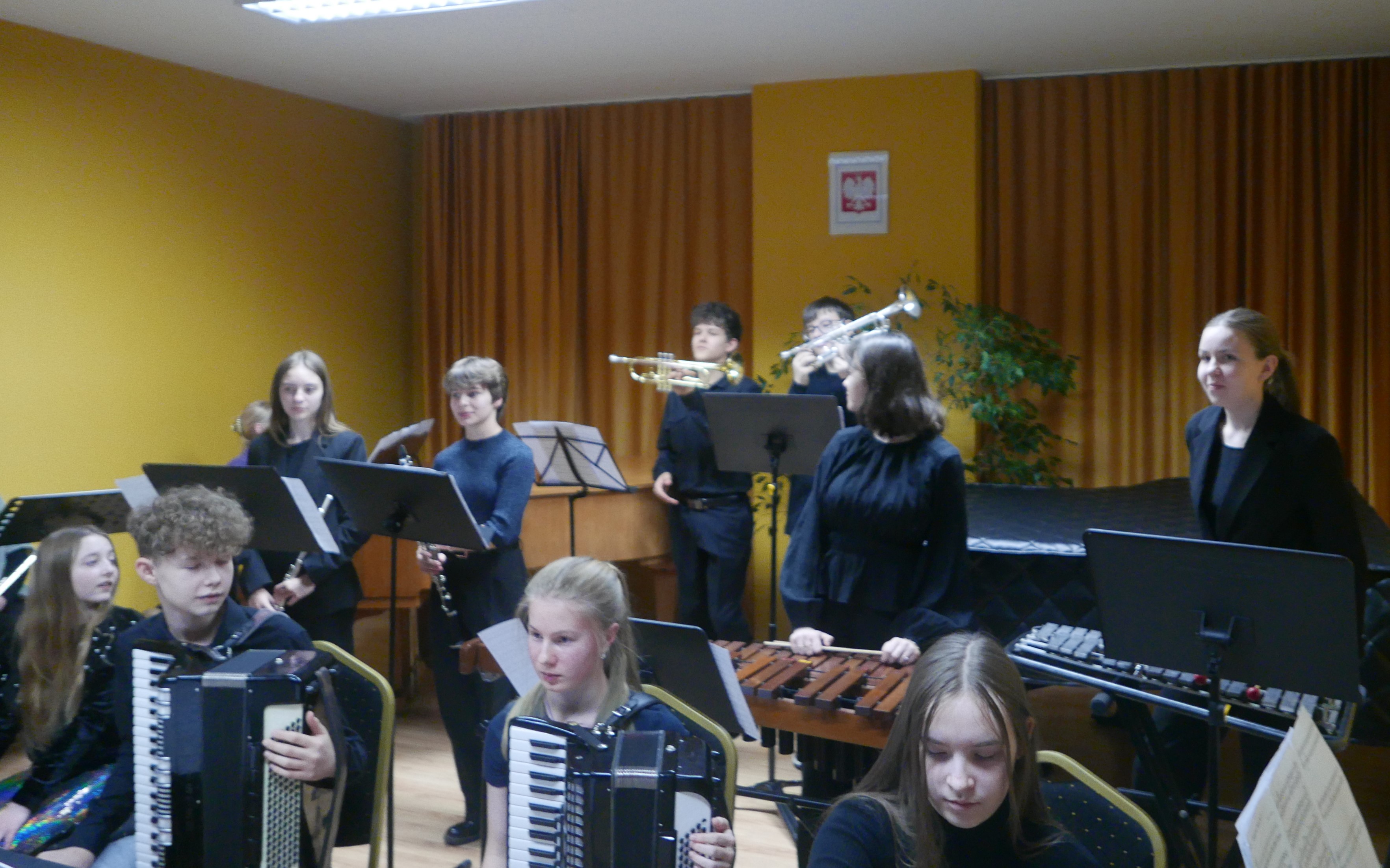 Wieczorem 25 lutego w ostatnim tygodniu karnawału na auli koncertowej naszej szkoły odbył się wyjątkowy koncert "Zespołu rodzinnego" pod dyrekcją pani Agnieszki Glińskiej. Tego wieczoru do szkoły przybyła publiczność przedszkolna - dzieci z najstarszej grupy z Przedszkola Niepublicznego Nr 1 im. św. Młodzieńca Gabriela wraz z rodzicami. Obecna była też pani dyrektor Walentyna Mielnik-Nikołajuk oraz pracownicy przedszkola. Koncert był okazją do promocji szkoły i zapoznania z ofertą edukacyjną placówki. Zabrzmiały największe hity zespołu m.in. "Taniec Eleny", piosenka francuska "Pod niebem Paryża" czy "Taniec węgierski" Brahmsa. Koncert odbył się w miłej, rodzinnej atmosferze. Publiczność poznała nowe instrumenty, a na koniec wzięła udział w zabawie rytmicznej przy muzyce jazzowej granej przez zespół. Przedszkolaki po koncercie zostały zaproszone na słodki poczęstunek. Publiczność wyraziła ogromne zadowolenie z koncertu. Wielu z przedszkolaków zadeklarowało chęć nauki w naszej szkole.