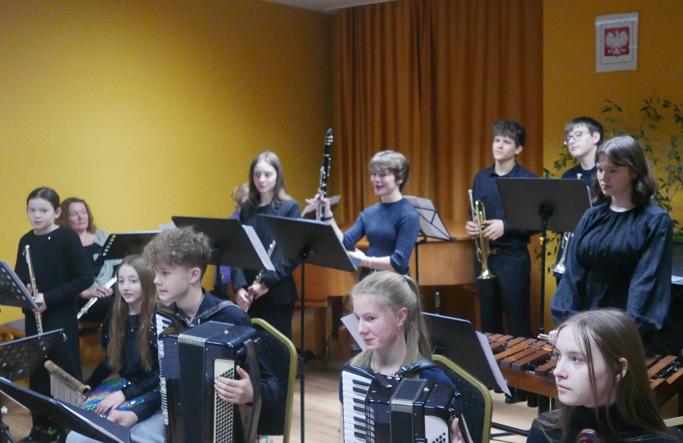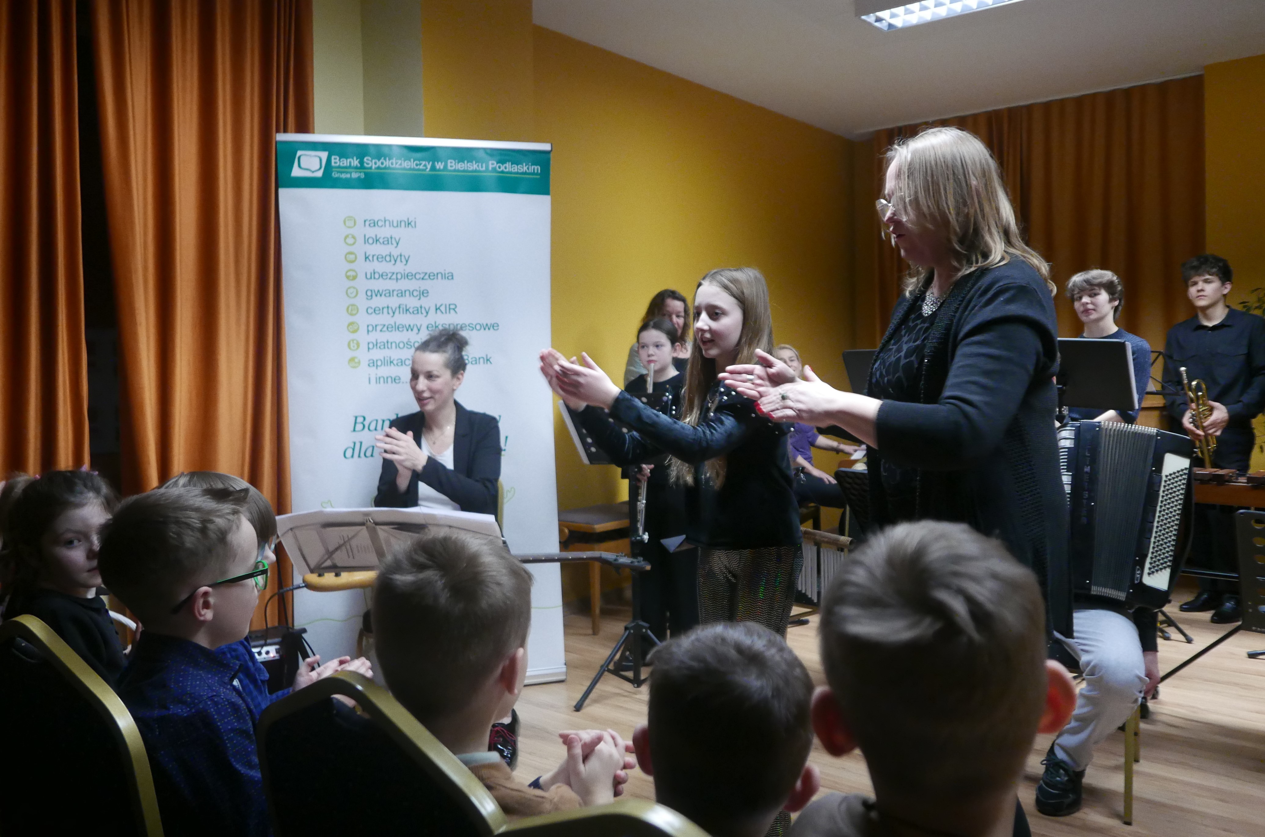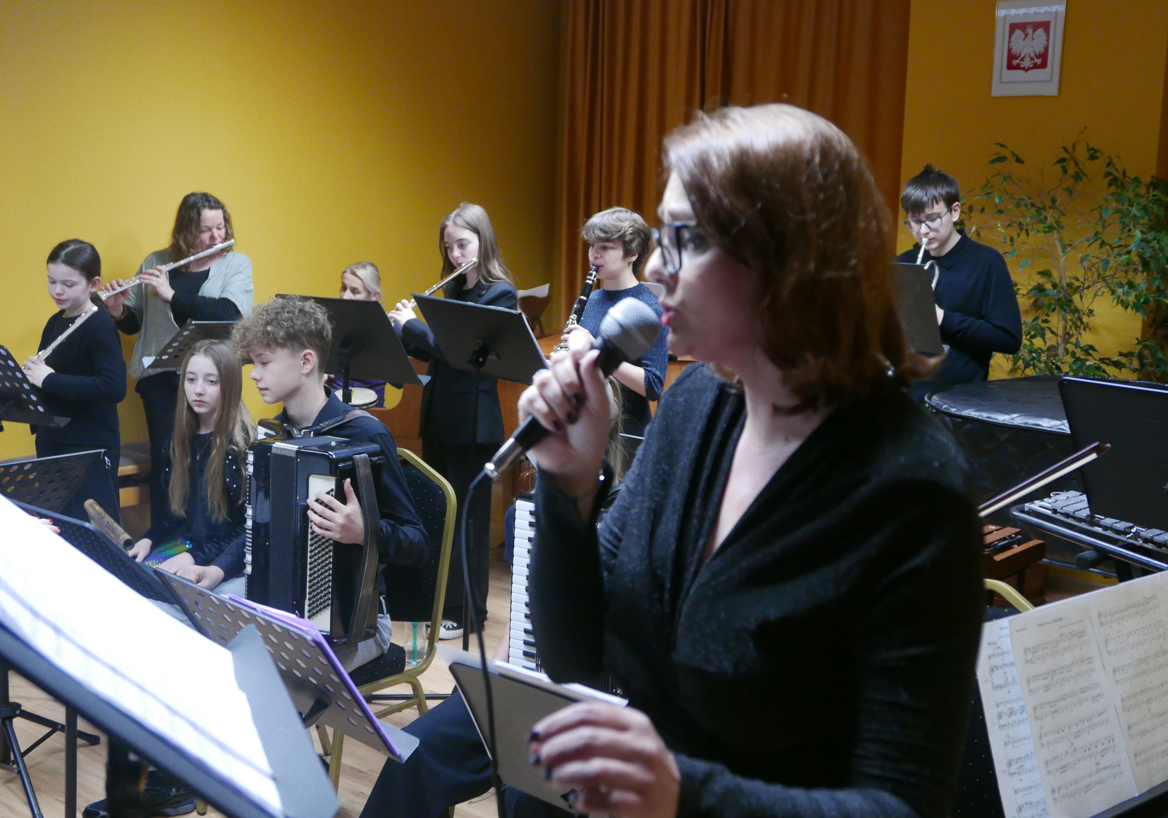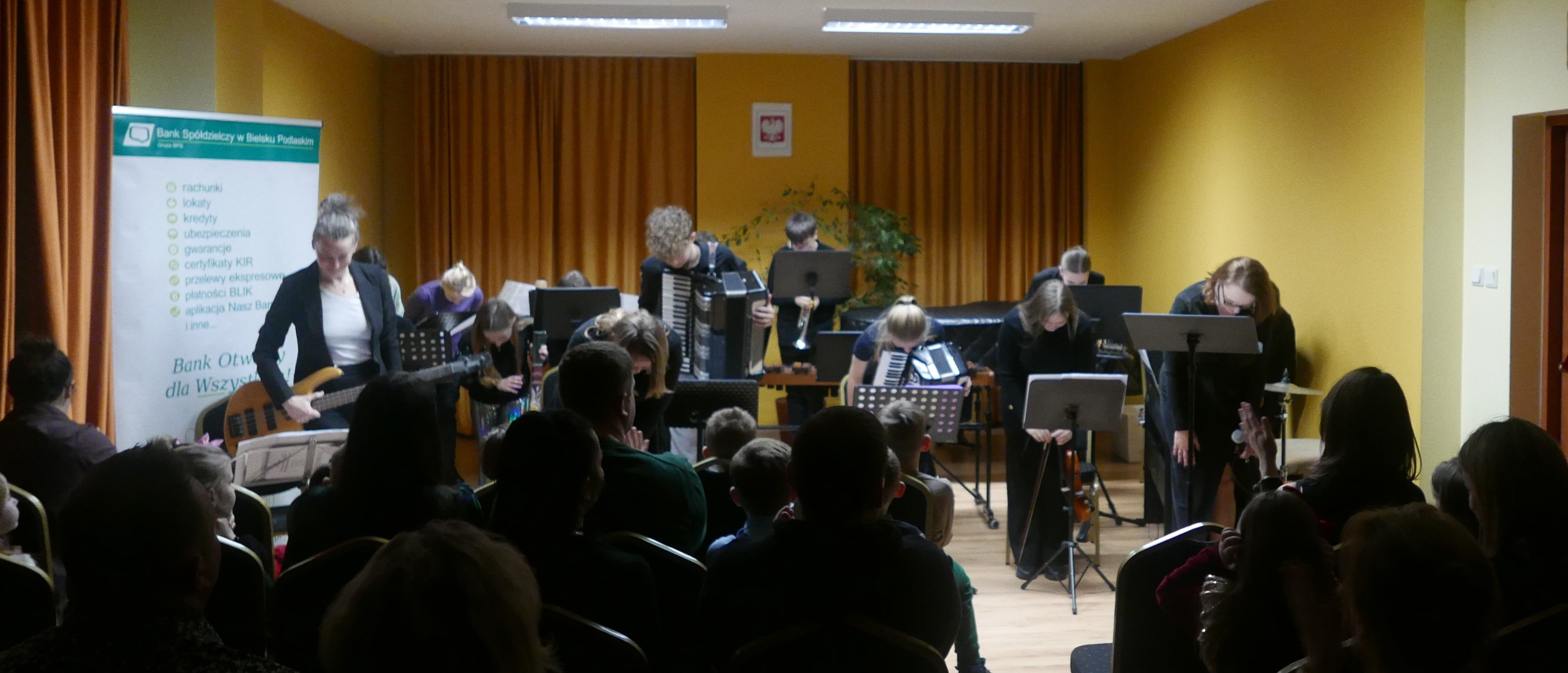 Wieczorem 25 lutego w ostatnim tygodniu karnawału na auli koncertowej naszej szkoły odbył się wyjątkowy koncert "Zespołu rodzinnego" pod dyrekcją pani Agnieszki Glińskiej. Tego wieczoru do szkoły przybyła publiczność przedszkolna - dzieci z najstarszej grupy z Przedszkola Niepublicznego Nr 1 im. św. Młodzieńca Gabriela wraz z rodzicami. Obecna była też pani dyrektor Walentyna Mielnik-Nikołajuk oraz pracownicy przedszkola. Koncert był okazją do promocji szkoły i zapoznania z ofertą edukacyjną placówki. Zabrzmiały największe hity zespołu m.in. "Taniec Eleny", piosenka francuska "Pod niebem Paryża" czy "Taniec węgierski" Brahmsa. Koncert odbył się w miłej, rodzinnej atmosferze. Publiczność poznała nowe instrumenty, a na koniec wzięła udział w zabawie rytmicznej przy muzyce jazzowej granej przez zespół. Przedszkolaki po koncercie zostały zaproszone na słodki poczęstunek. Publiczność wyraziła ogromne zadowolenie z koncertu. Wielu z przedszkolaków zadeklarowało chęć nauki w naszej szkole.