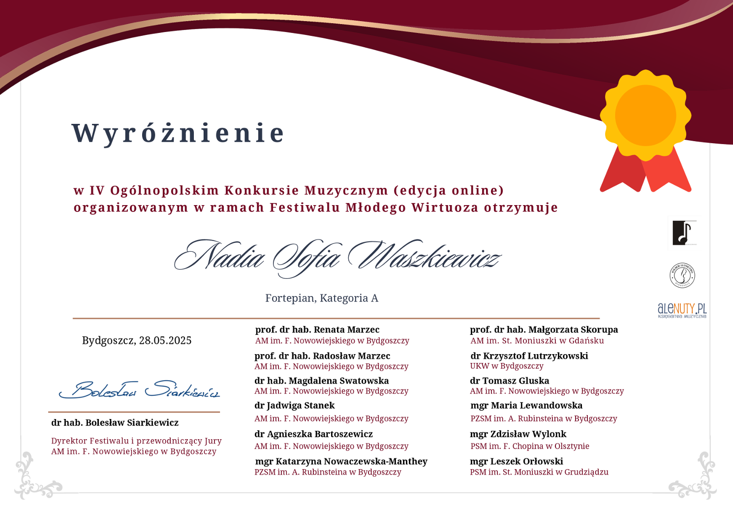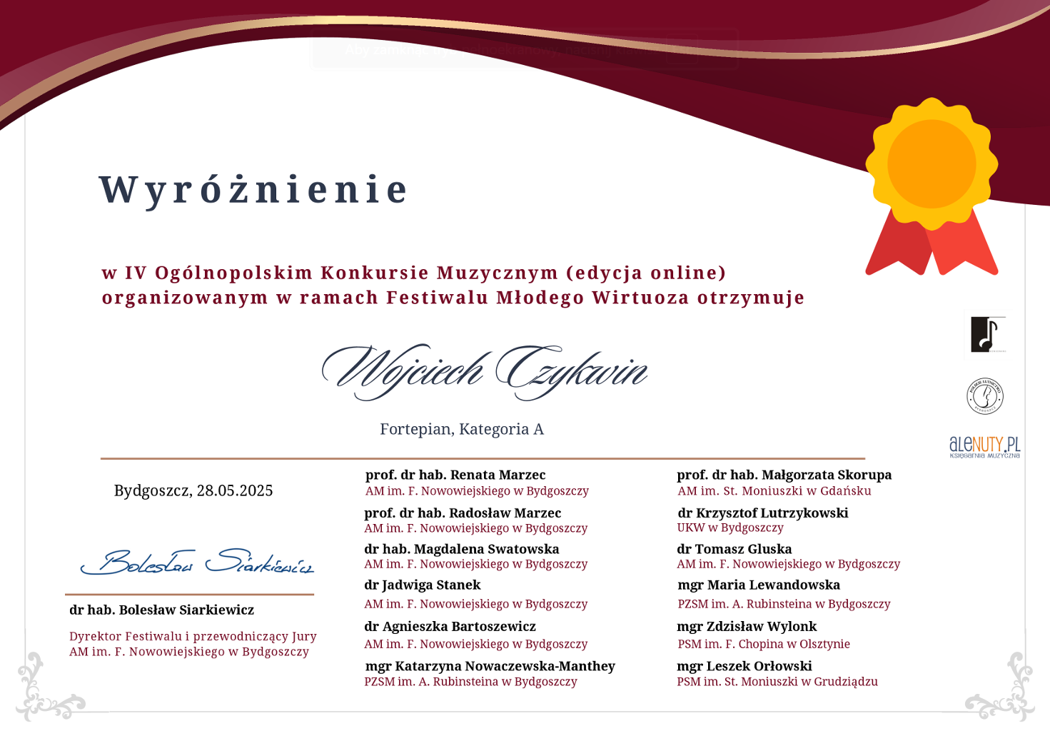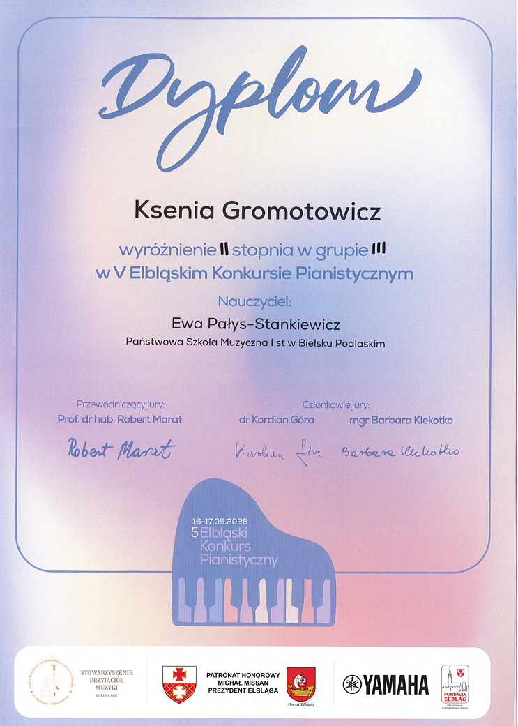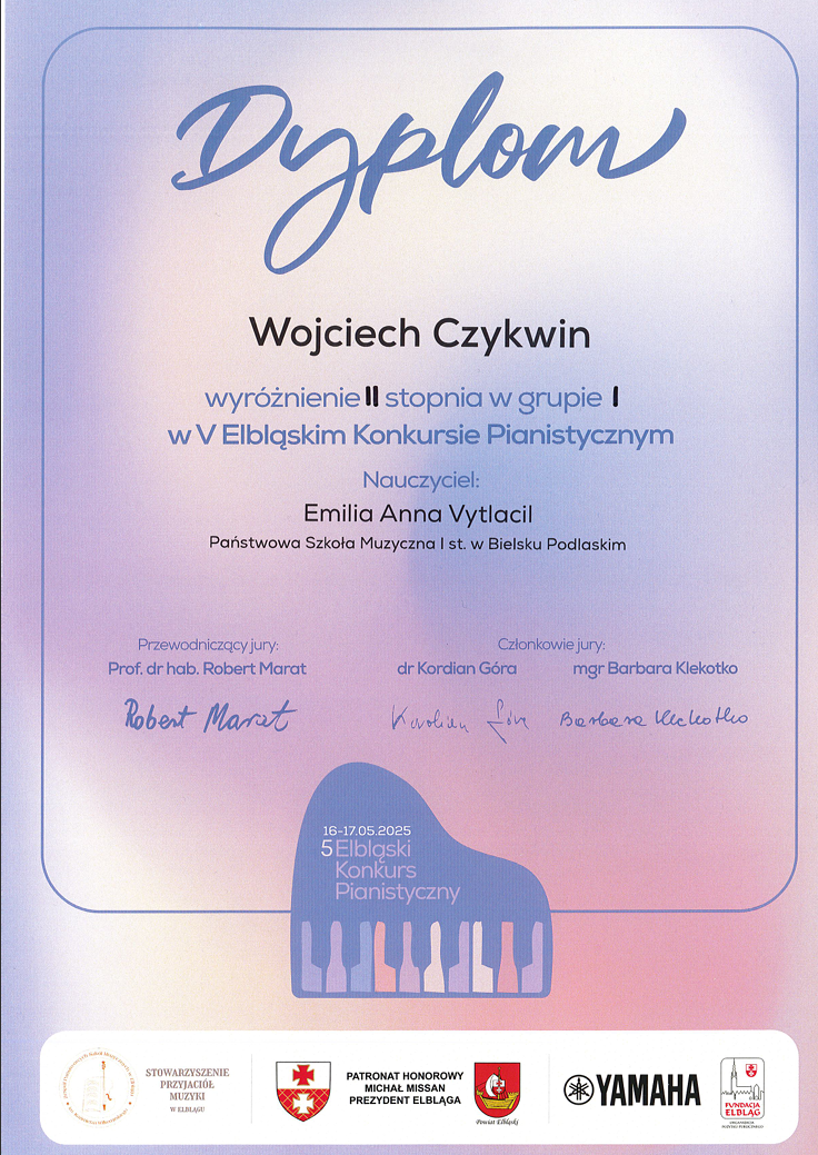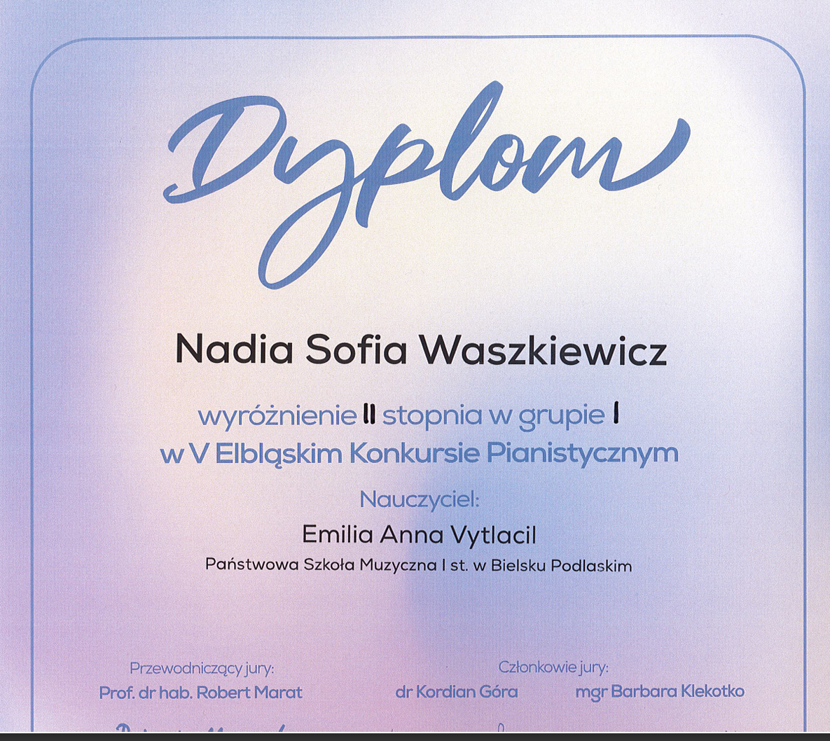 Uczniowie z klas fortepianu naszej szkoły wzięli udział w dwóch konkursach pianistycznych. W „V Elbląskim Konkursie Pianistycznym” Nadia Sofia Waszkiewicz z klasy fortepianu p.Emilii Anny Vytlacil zdobyła wyróżnienie II stopnia w grupie I, Wojciech Czykwin z klasy fortepianu p.Emilii Anny Vytlacil zdobył wyróżnienie II w grupie I oraz Ksenia Gromotowicz z klasy fortepianu p.Ewy Pałys-Stankiewicz zdobyła wyróżnienie II stopnia w grupie III. W „IV Ogólnopolskim Konkursie Muzycznym (edycja oneline) organizowanym w ramach Festiwalu Młodego Wirtuoza uczniowie z klasy fortepianu p.Emilii Vytlacil: Nadia Sofia Waszkiewicz i Wojciech Czykwin otrzymali wyróżnienia w kategorii A.