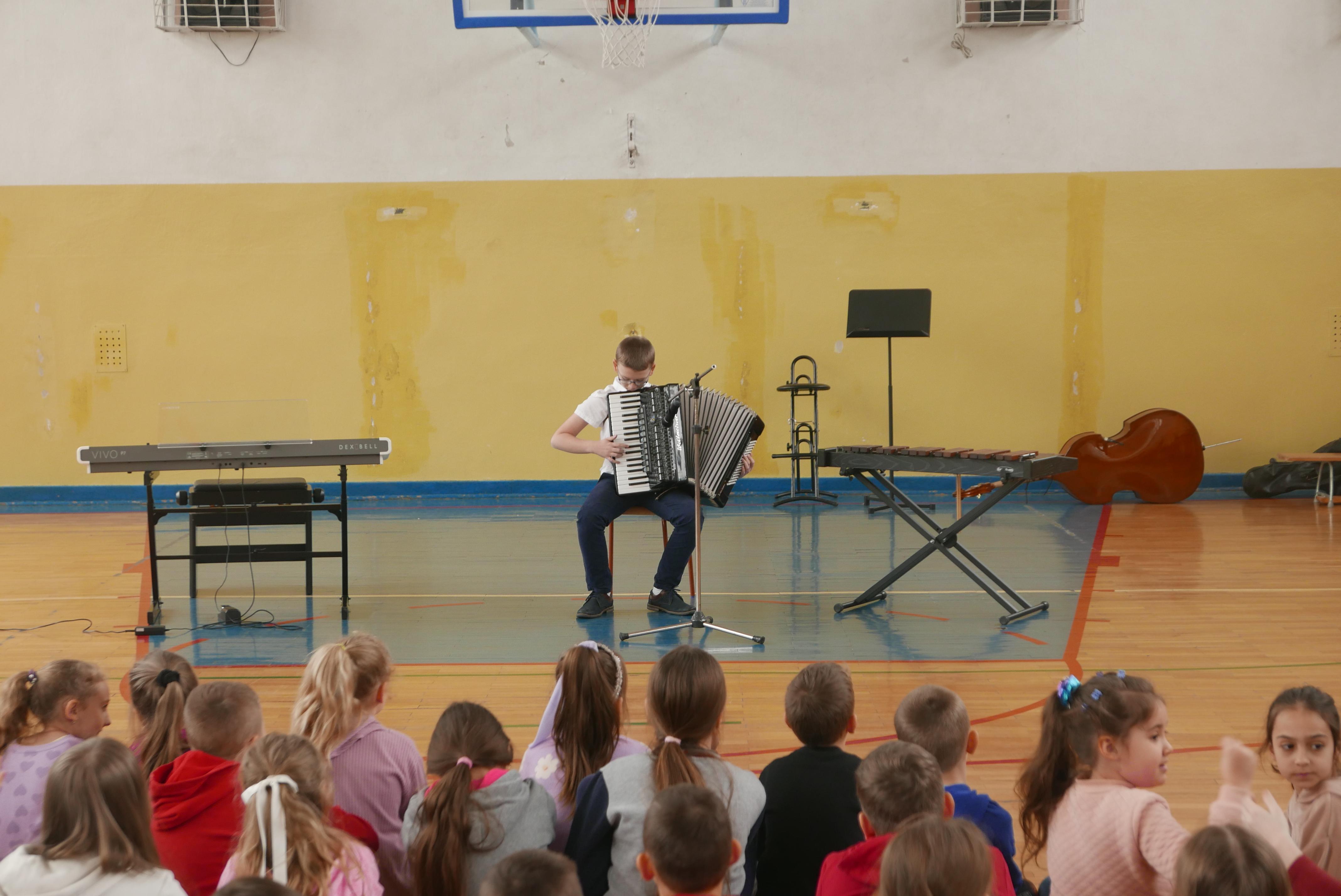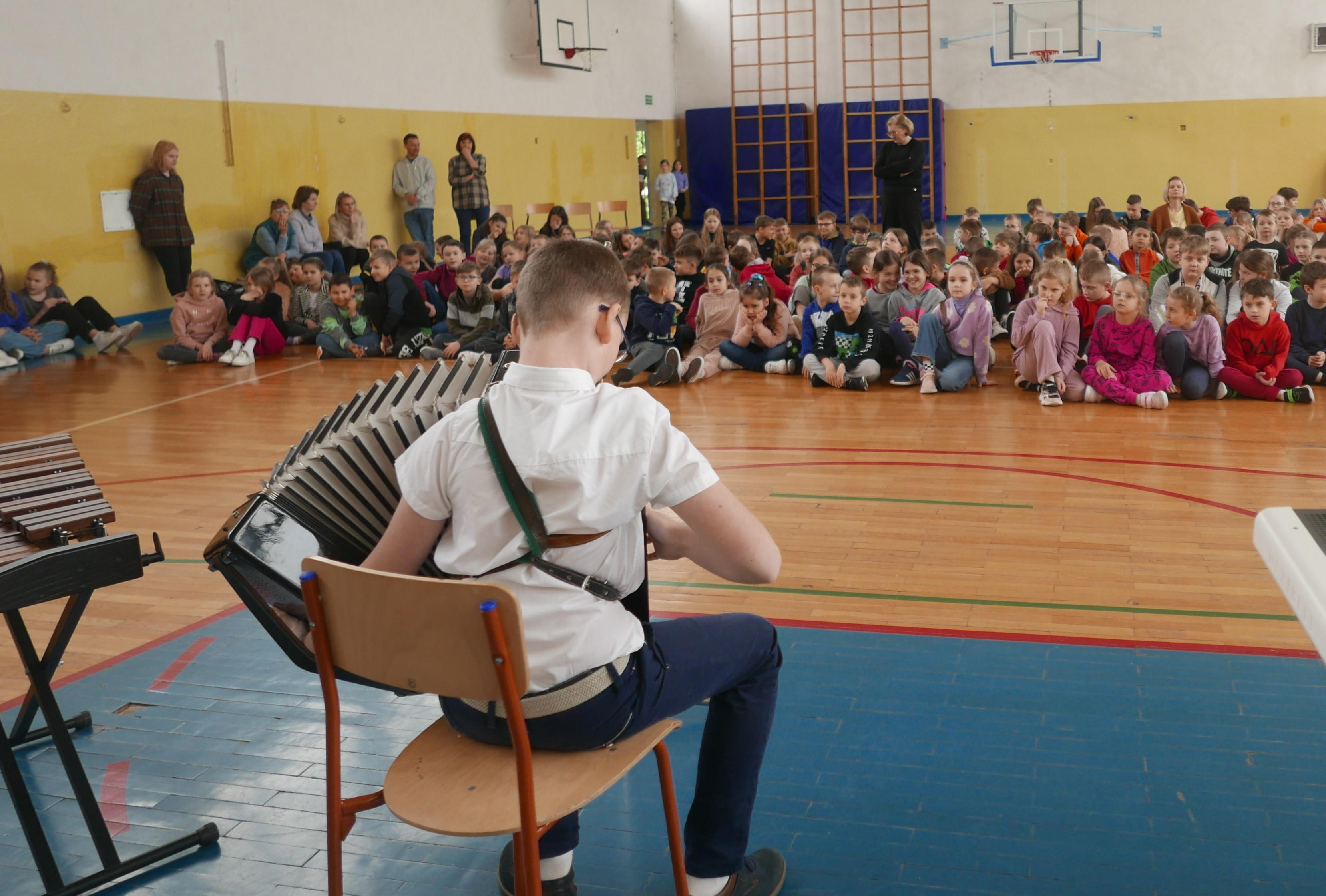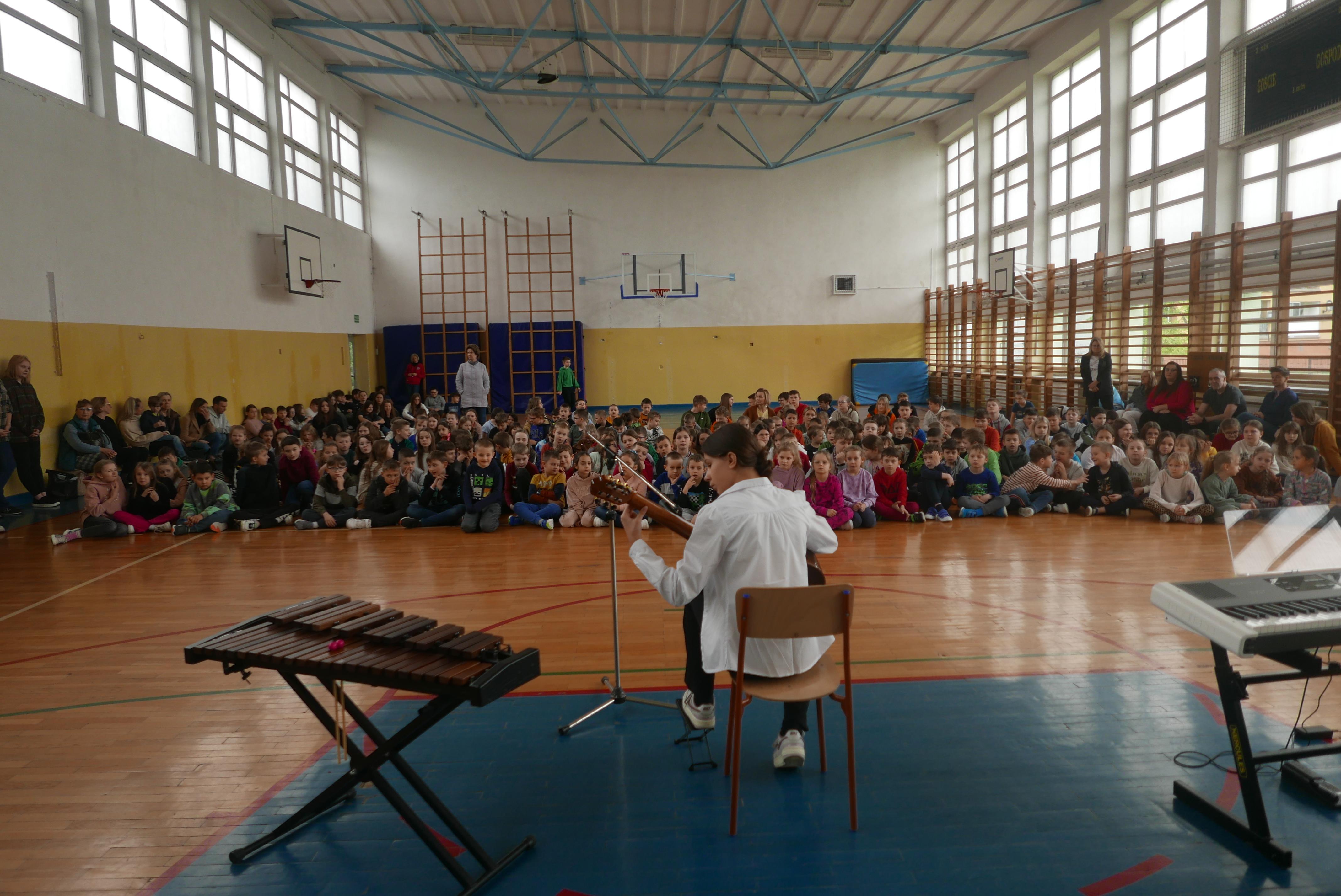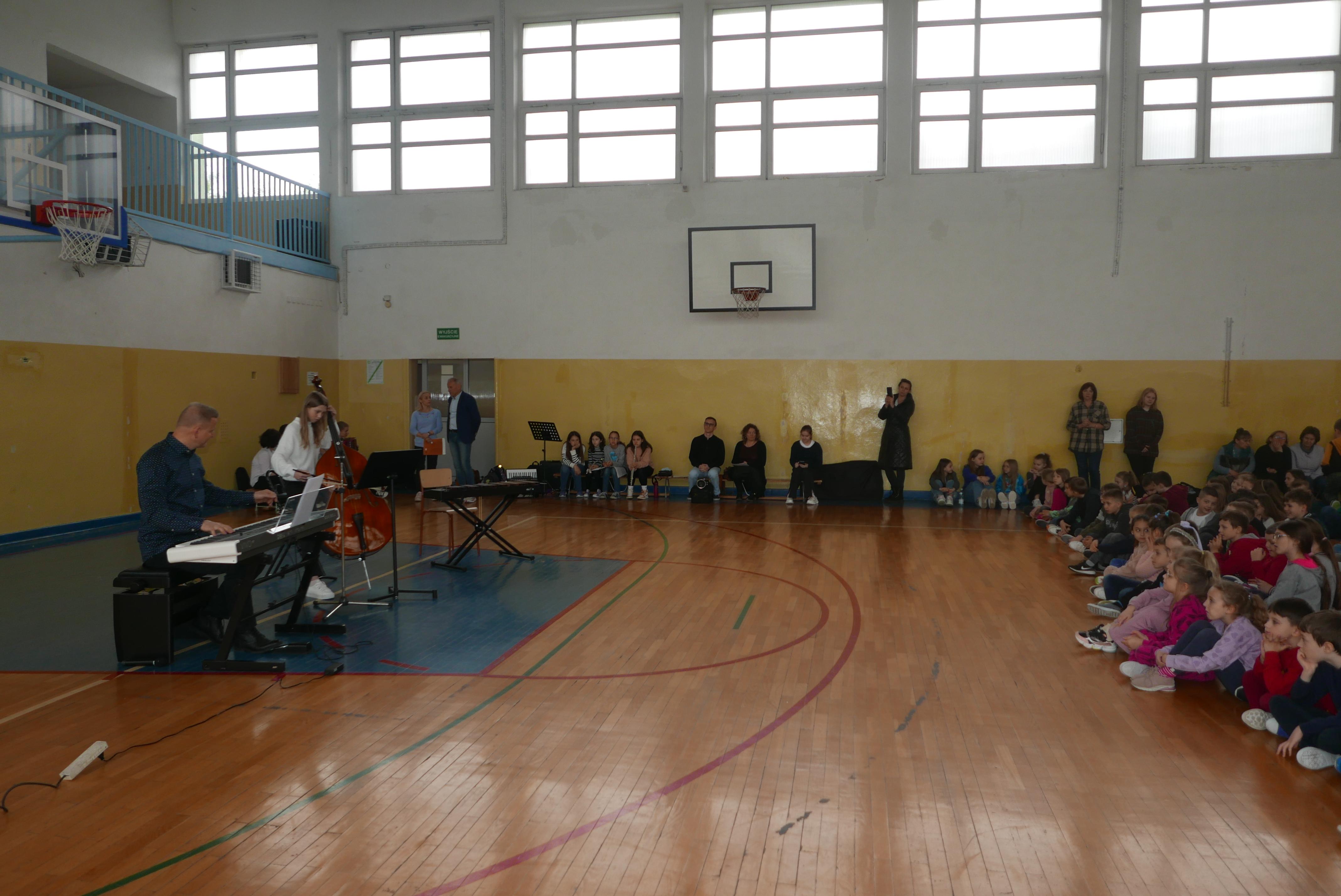 Na czwartej godzinie lekcyjnej sala gimnastyczna „Piątki” wypełniła się uczniami z większości klas, którzy przyszli posłuchać swoich koleżanek i kolegów uczących się gry na instrumentach w „bielskim muzyku”. Podczas ponad godzinnego koncertu nasi uczniowie i nauczyciele zagrali na wszystkich instrumentach z oferty naszej placówki- czyli ksylofonie, skrzypcach, fortepianie, akordeonie, kontrabasie, flecie, trąbce, klarnecie, wiolonczeli. Koncert bardzo się podobał sądząc po gromkich brawach słuchaczy.