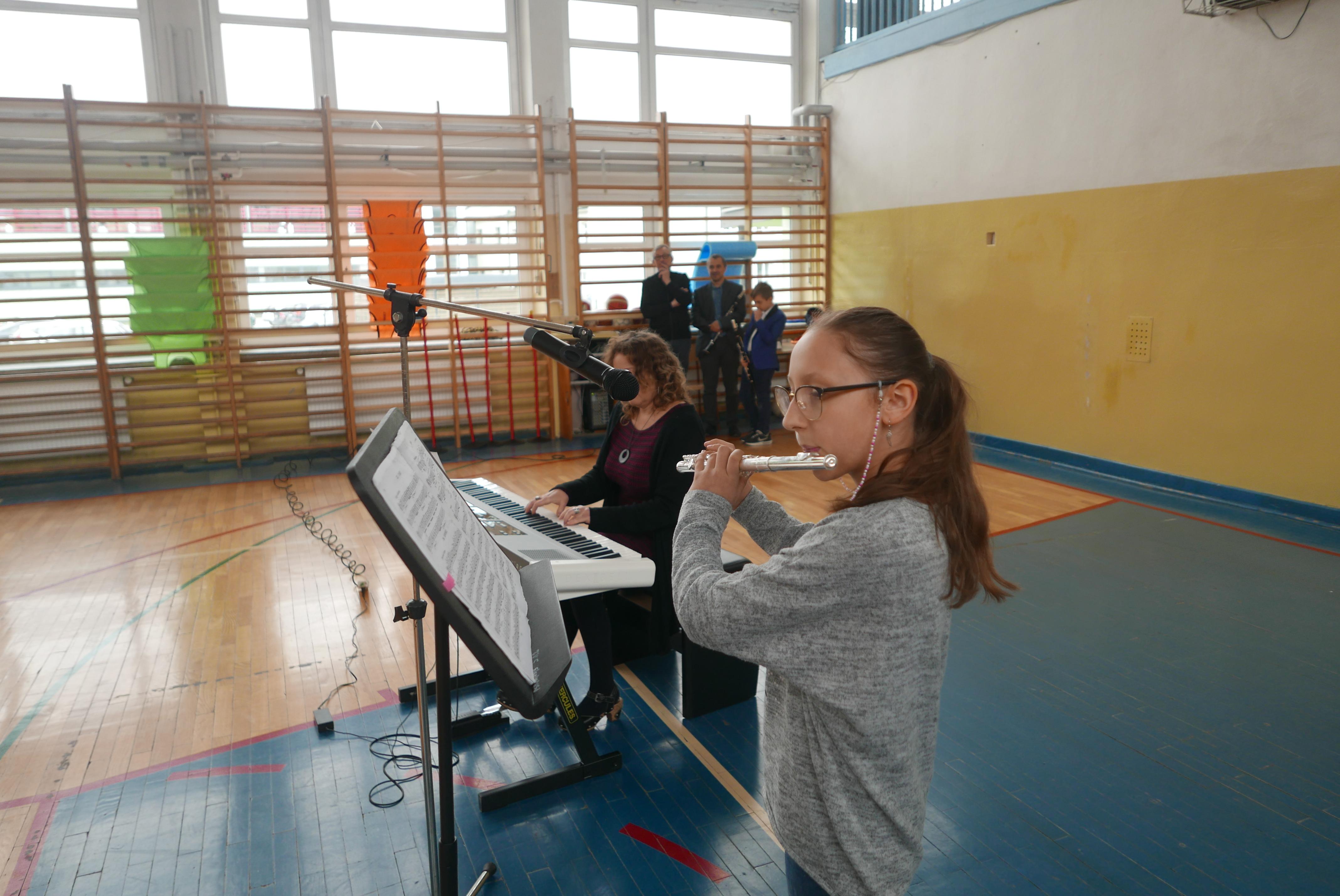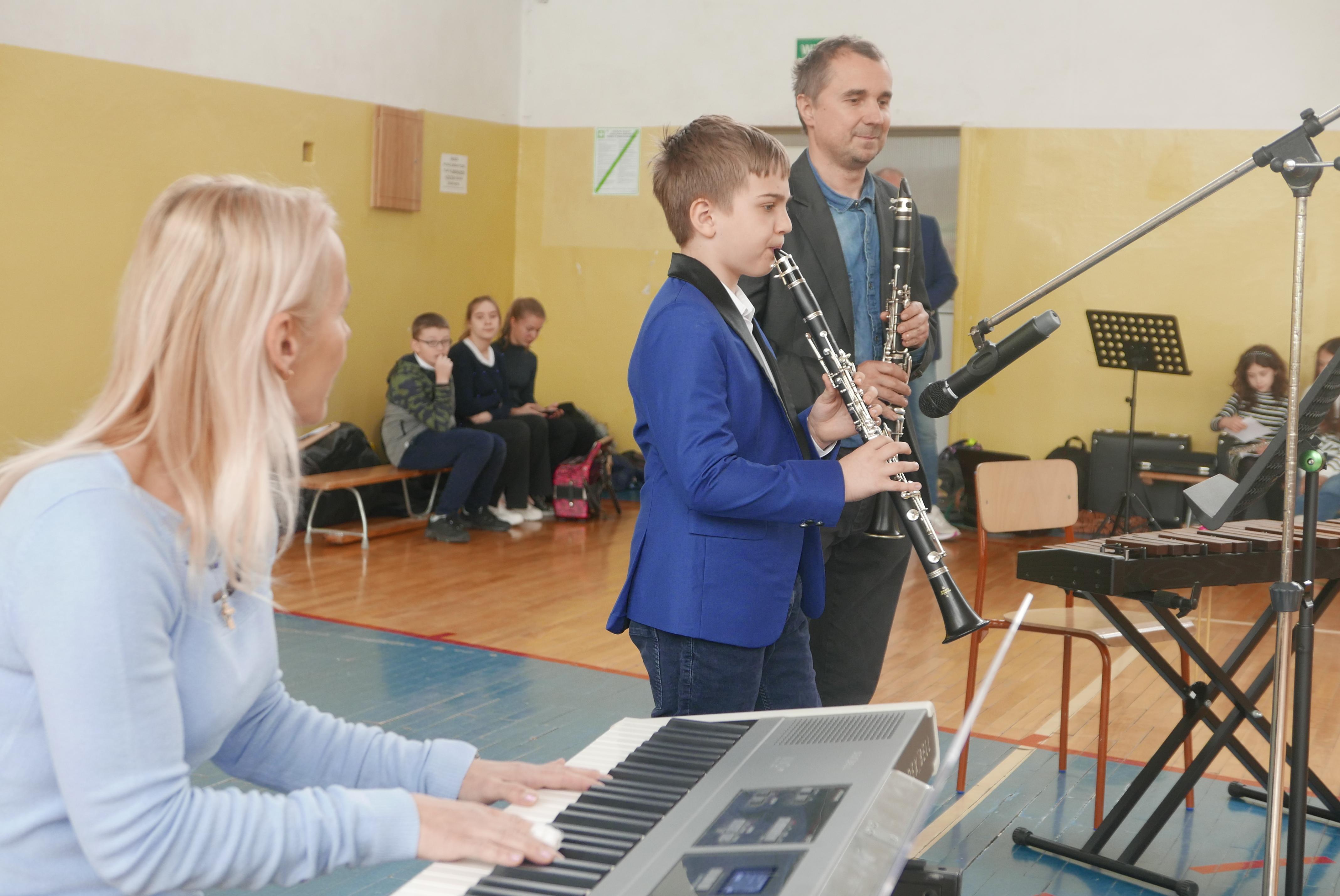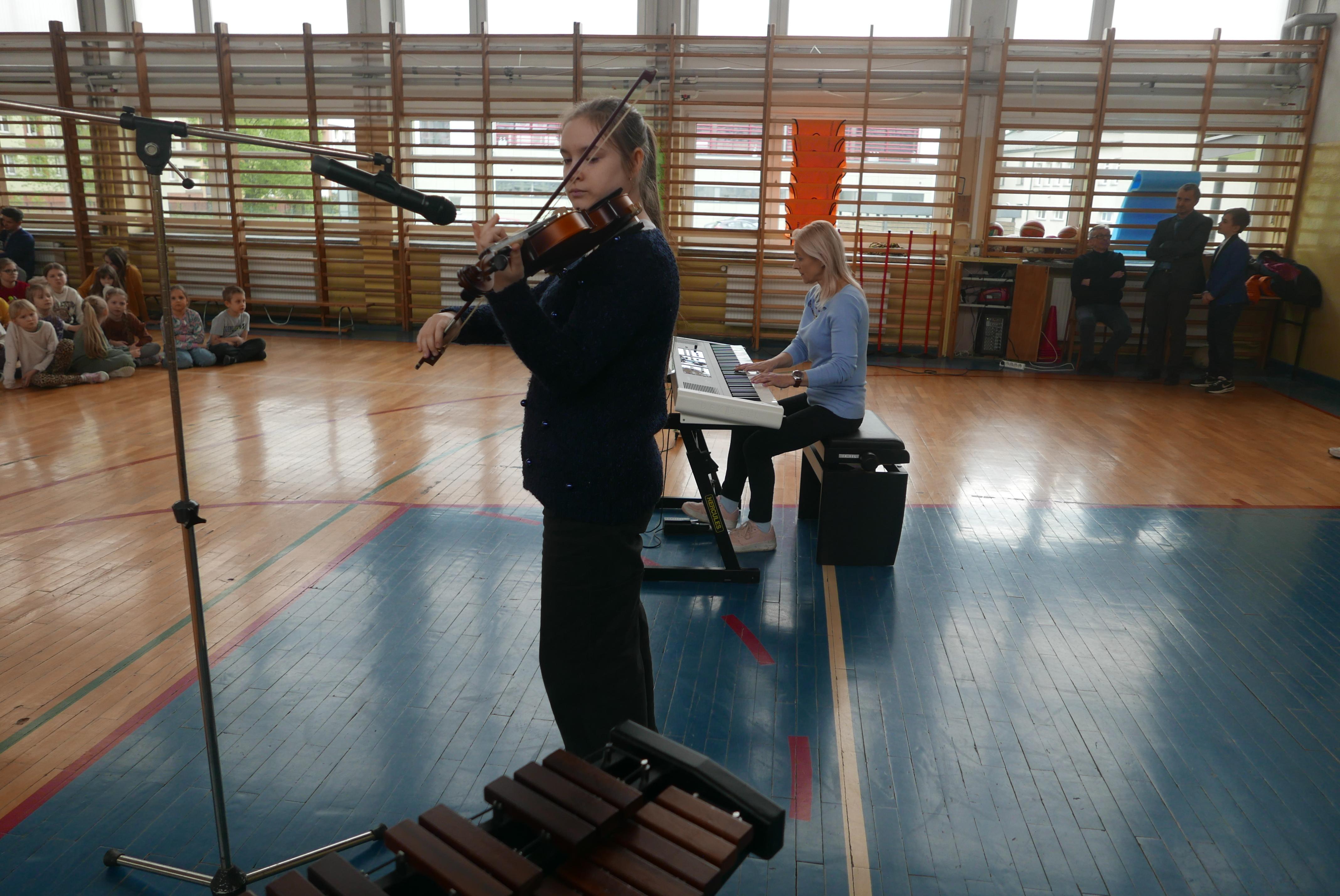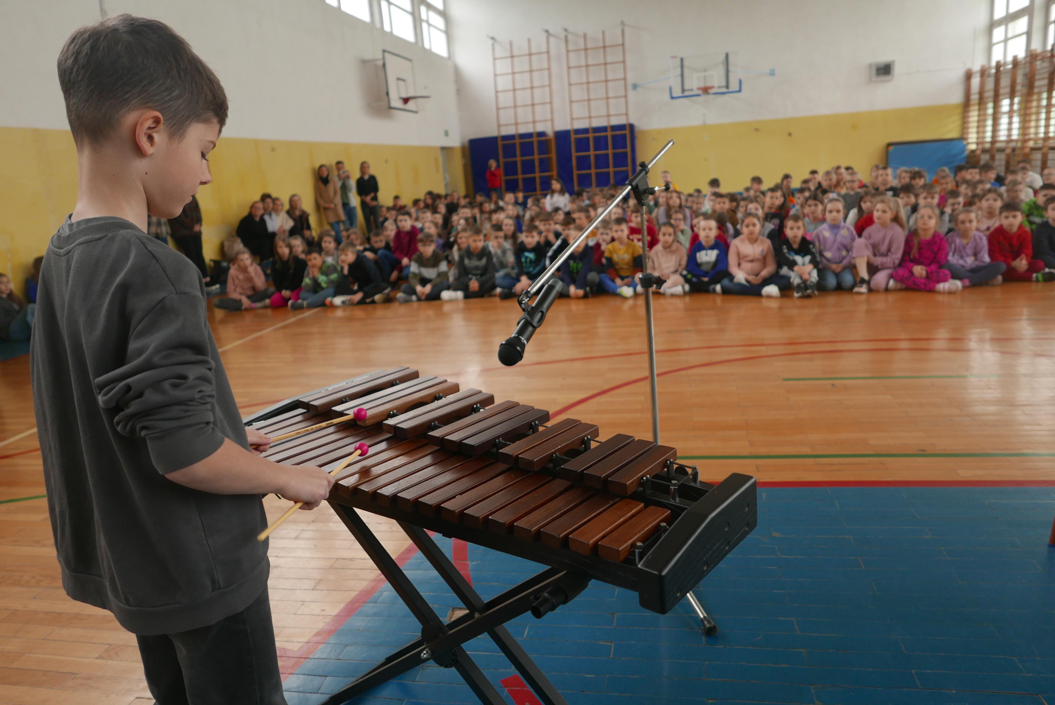 Na czwartej godzinie lekcyjnej sala gimnastyczna „Piątki” wypełniła się uczniami z większości klas, którzy przyszli posłuchać swoich koleżanek i kolegów uczących się gry na instrumentach w „bielskim muzyku”. Podczas ponad godzinnego koncertu nasi uczniowie i nauczyciele zagrali na wszystkich instrumentach z oferty naszej placówki- czyli ksylofonie, skrzypcach, fortepianie, akordeonie, kontrabasie, flecie, trąbce, klarnecie, wiolonczeli. Koncert bardzo się podobał sądząc po gromkich brawach słuchaczy.