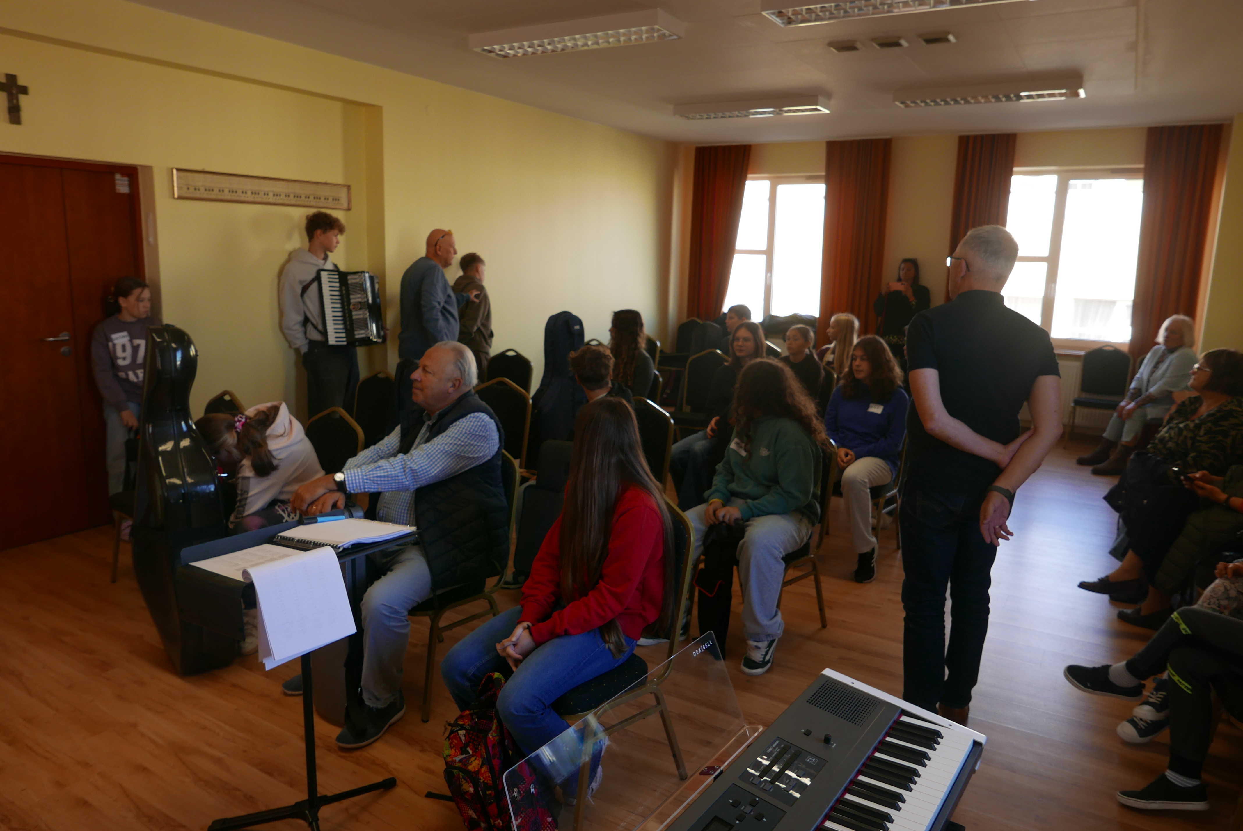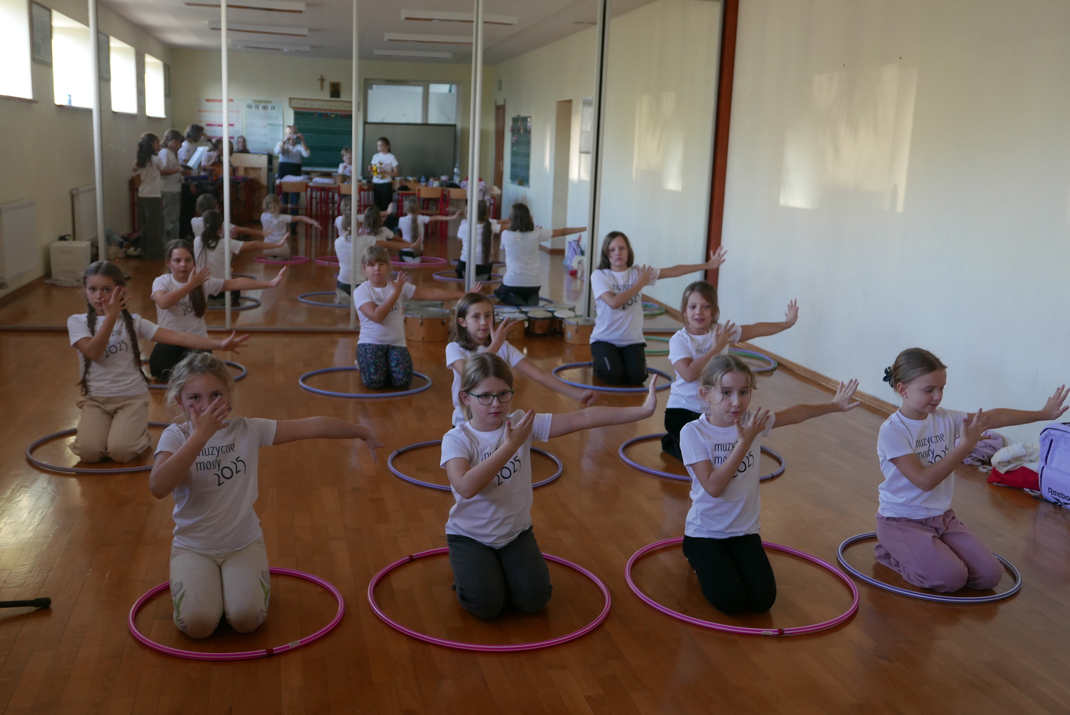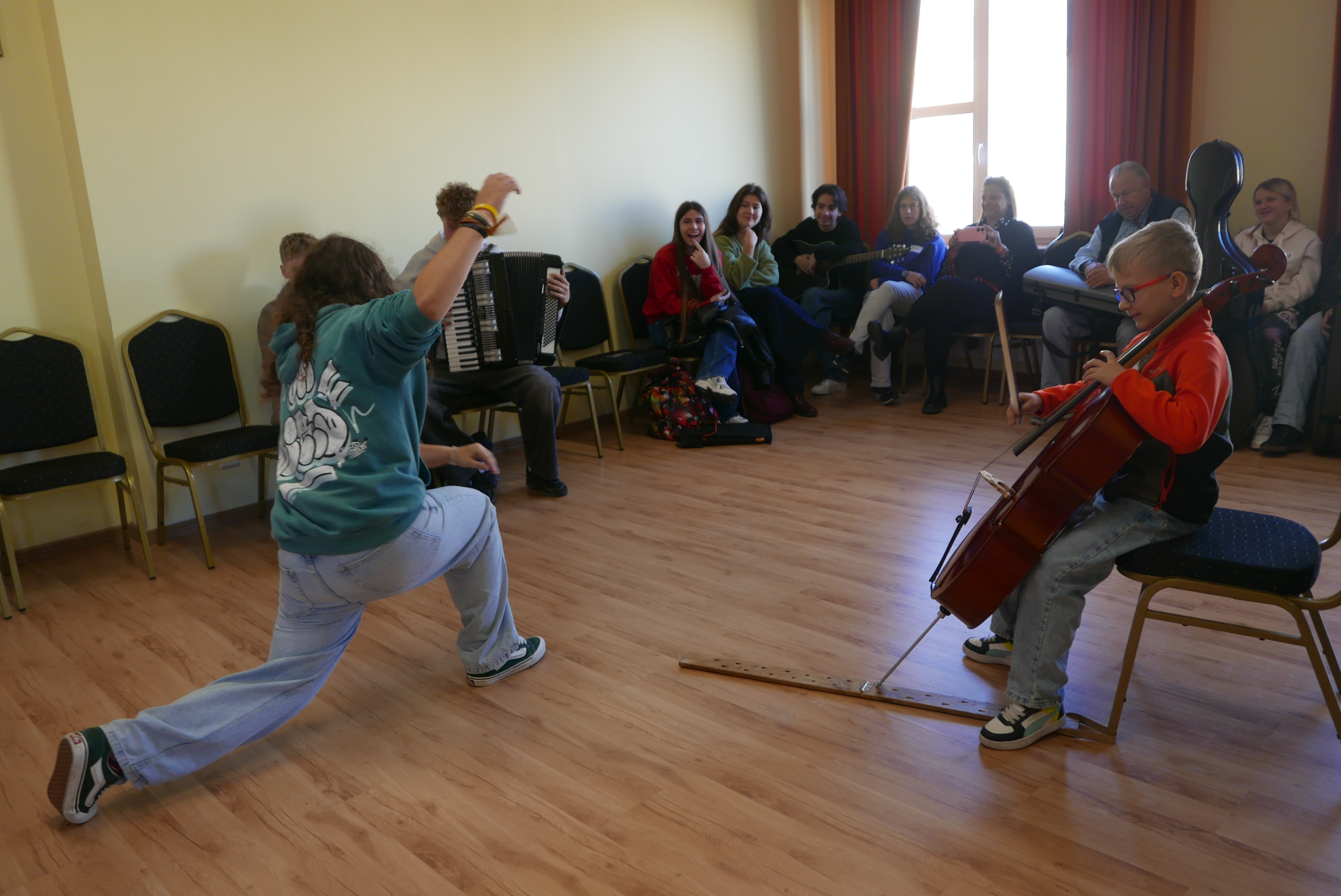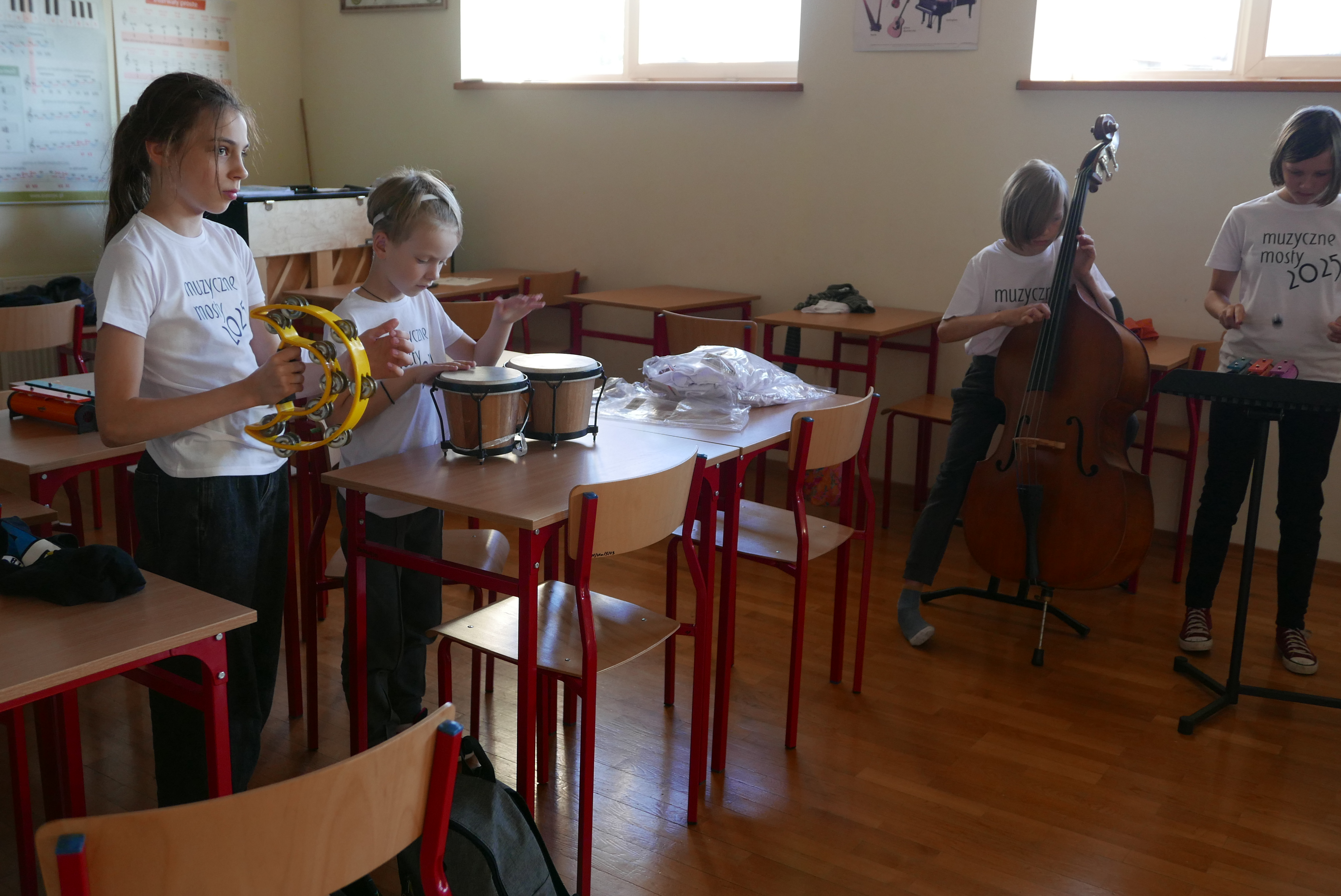 "MUZYCZNE MOSTY"z inicjatywy Pani Dyrektor Edyty Lebieżyńskiej drugi raz zagościły w murach naszej szkoły. Całe przedsięwzięcie rozpoczęło się wyjazdem do parku linowego. Po emocjonujących i relaksujących zajęciach w Doktorcach, które zintegrowały uczestników-wszyscy byli gotowi do właściwych warsztatów muzycznych. Od rana wszyscy uczestnicy ze szkół muzycznych z Łotwy, Grecji i naszej szkoły z niecierpliwością oczekiwali na wspólne zajęcia, które rozpoczęły się zebraniem wszystkich w auli szkolnej. Pan Krzysztof Baka wprowadził młodych muzyków w tematykę warsztatów. Następnie podzieleni na kilkuosobowe grupy rozpoczęliśmy pracę nad muzyką do „Bajki o żelaznym jeżu” Jana Brzechwy. Równolegle w Sali rytmiki odbywały się zajęcia z grupą rytmiczną prowadzoną przez Panią Gabrielę Podleską. Pod koniec dnia w sali perkusyjnej odbyła się próba generalna z udziałem narratorów. Teraz czas na koncert.