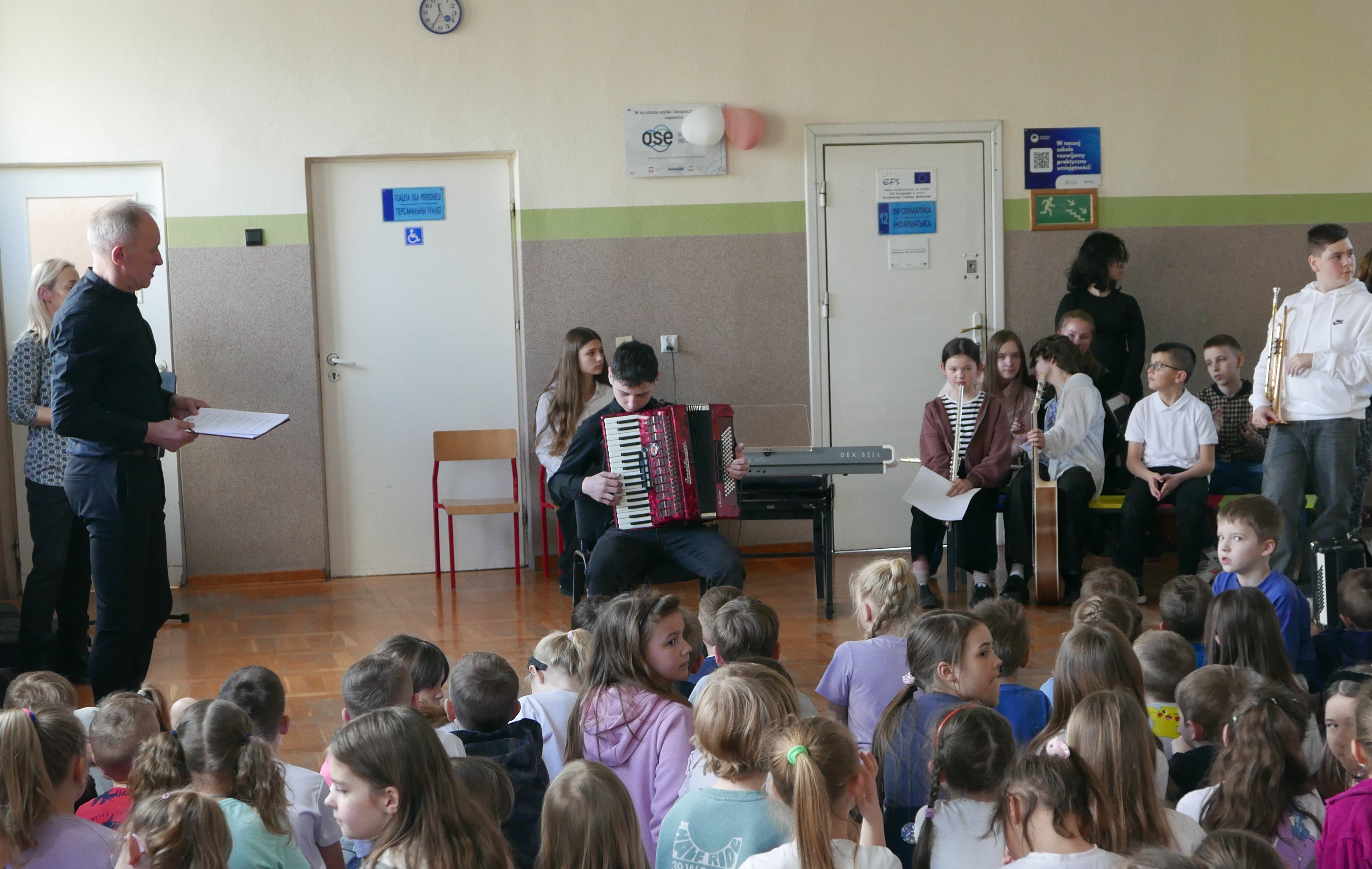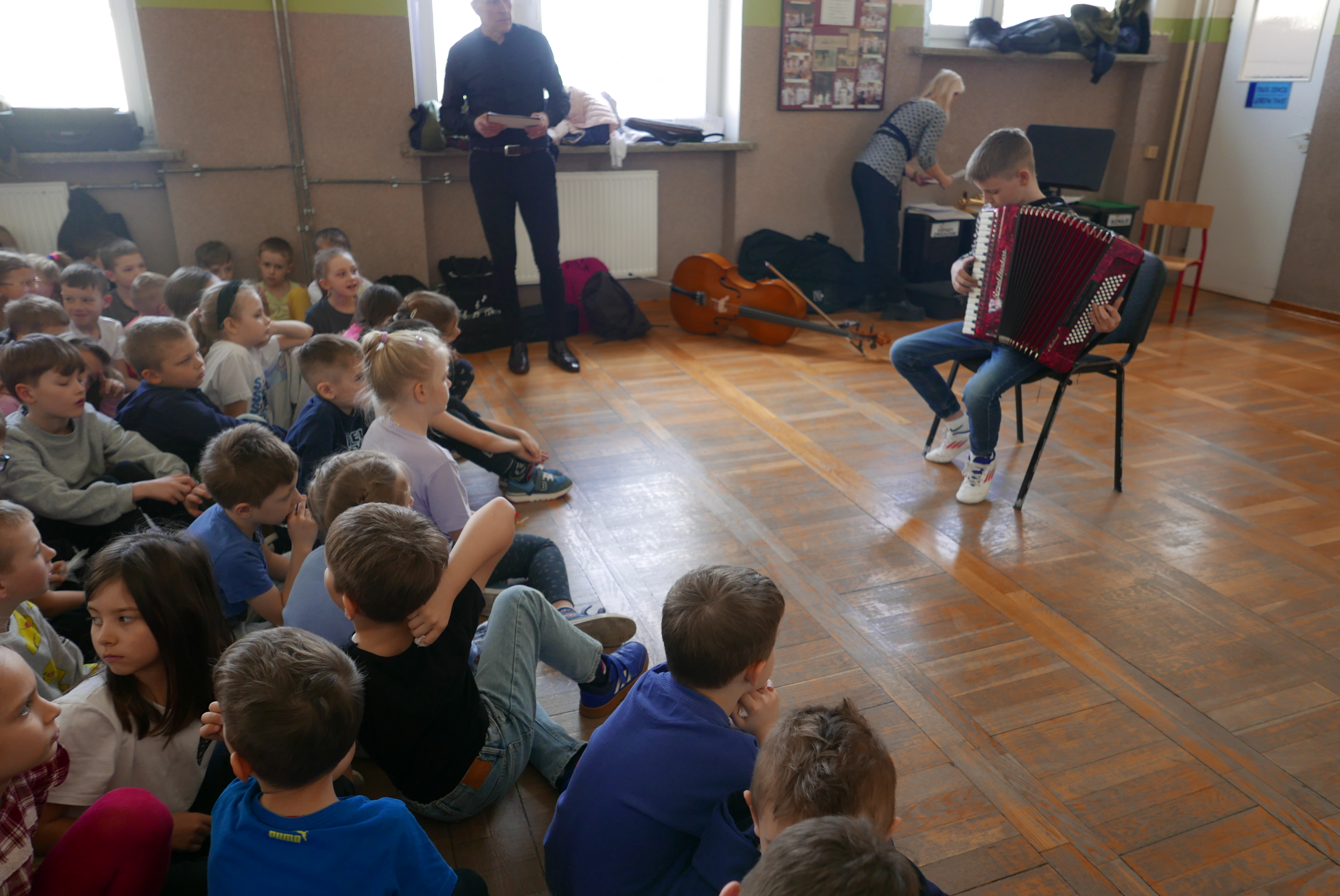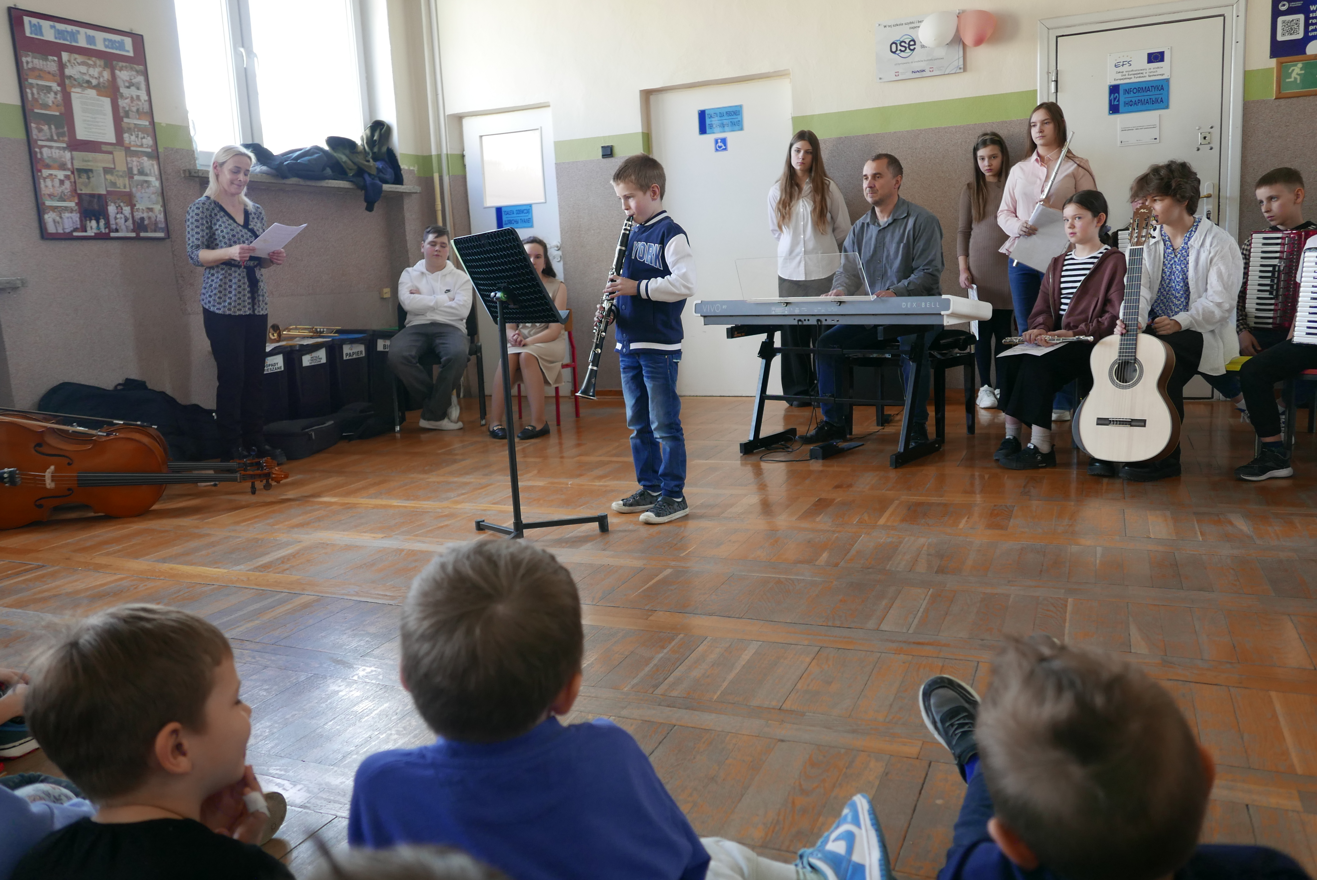 Właśnie rozpoczęliśmy cykl koncertów w bielskich podstawówkach, by zachęcić dzieci i młodzież do nauki w szkole muzycznej. I tak, 8 kwietnia 2025r uczniowie PSM I stopnia mieli bardzo pracowite przedpołudnie. Już o godz. 8.55, w Szkole Podstawowej nr 5 im. "Szarych Szeregów" prezentowali swoje instrumenty oraz ich możliwości brzmieniowe swoim kolegom i koleżankom ze szkoły. Następnie, o 10.45 rozpoczęliśmy koncert w Szkole Podstawowej nr 3 im. Jarosława Kostycewicza, gdzie uczniowie byli podziwiani przez swoich kolegów i koleżanki oraz nauczycieli. Ostatni koncert odbył się w Szkole Podstawowej nr 2 im. Kpt. Wł. Wysockiego. W tejże Szkole również uczniowie z zachwytem wysłuchali prezentacji uczniów szkoły muzycznej. Wszystkie koncerty poprowadził p. Wiesław Doliński, który w bajeczny sposób opowiadał o szkole muzycznej, instrumentach a nawet o samej muzyce. „Smyczkowcom oraz dęciakom” akompaniowała p. Magdalena Włodarczyk i p.Jan Mlejnek. O wizerunek w postaci fotografii zadbał p. Bogdan Drozdowski.