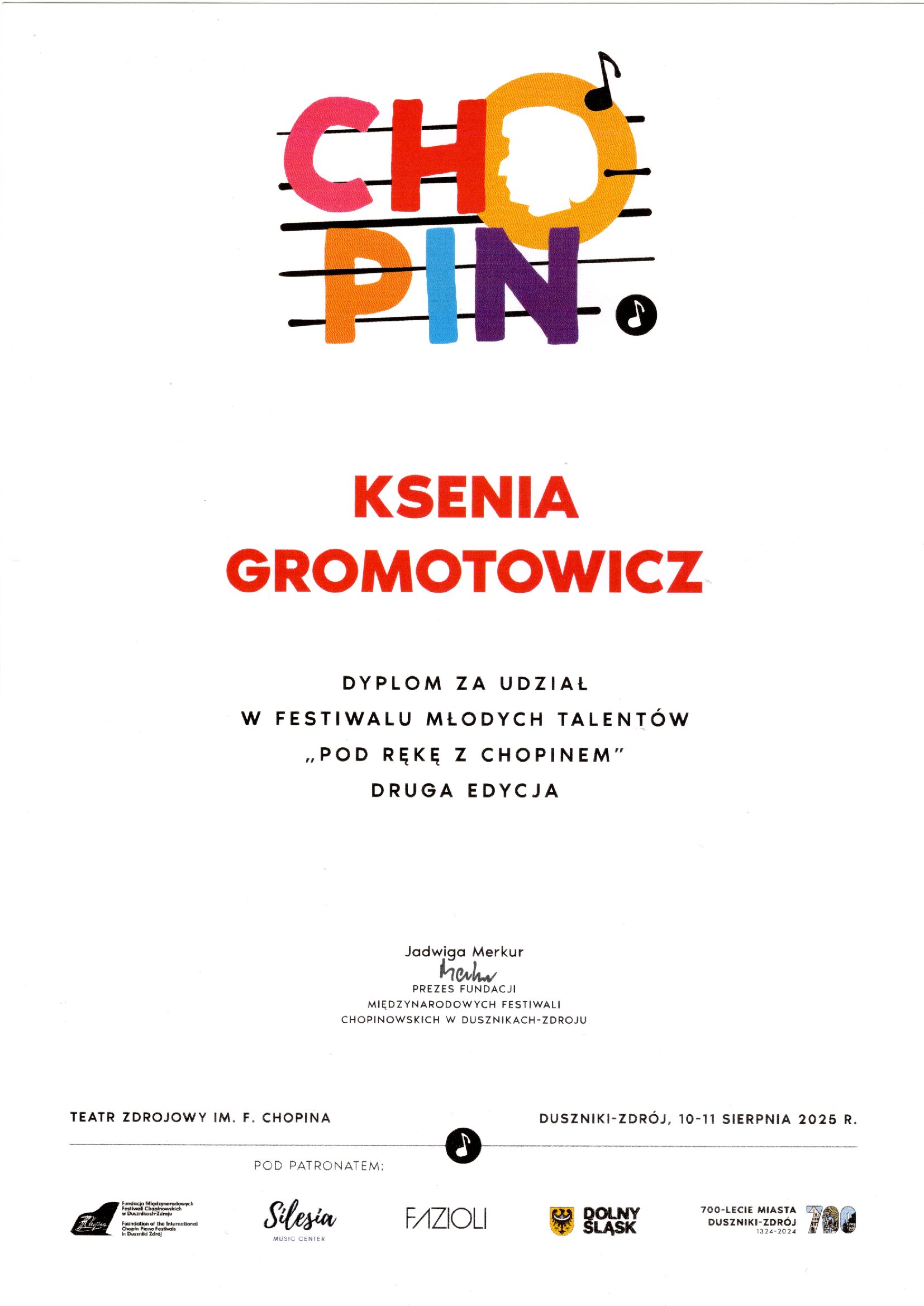 To już druga edycja festiwalu i kolejna uczennica reprezentująca naszą szkołę. Tym razem Ksenia Gromotowicz miała zaszczyt uczestniczyć w tym wydarzeniu i zaprezentować dwa utwory: Johanna Friedricha Franza Burgmüllera -„Burzę” op.109 i Fryderyka Chopina Mazurek g-moll op.67