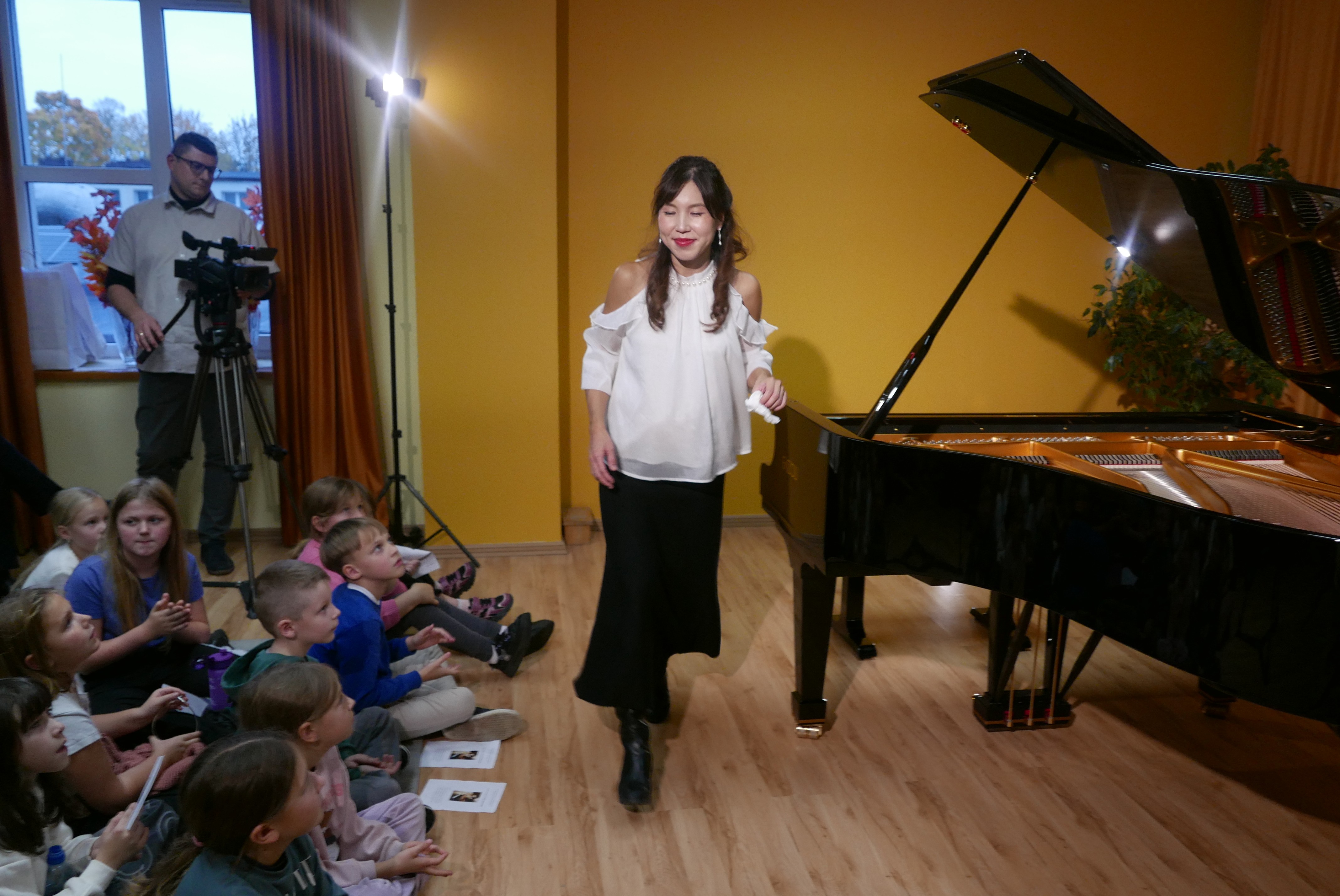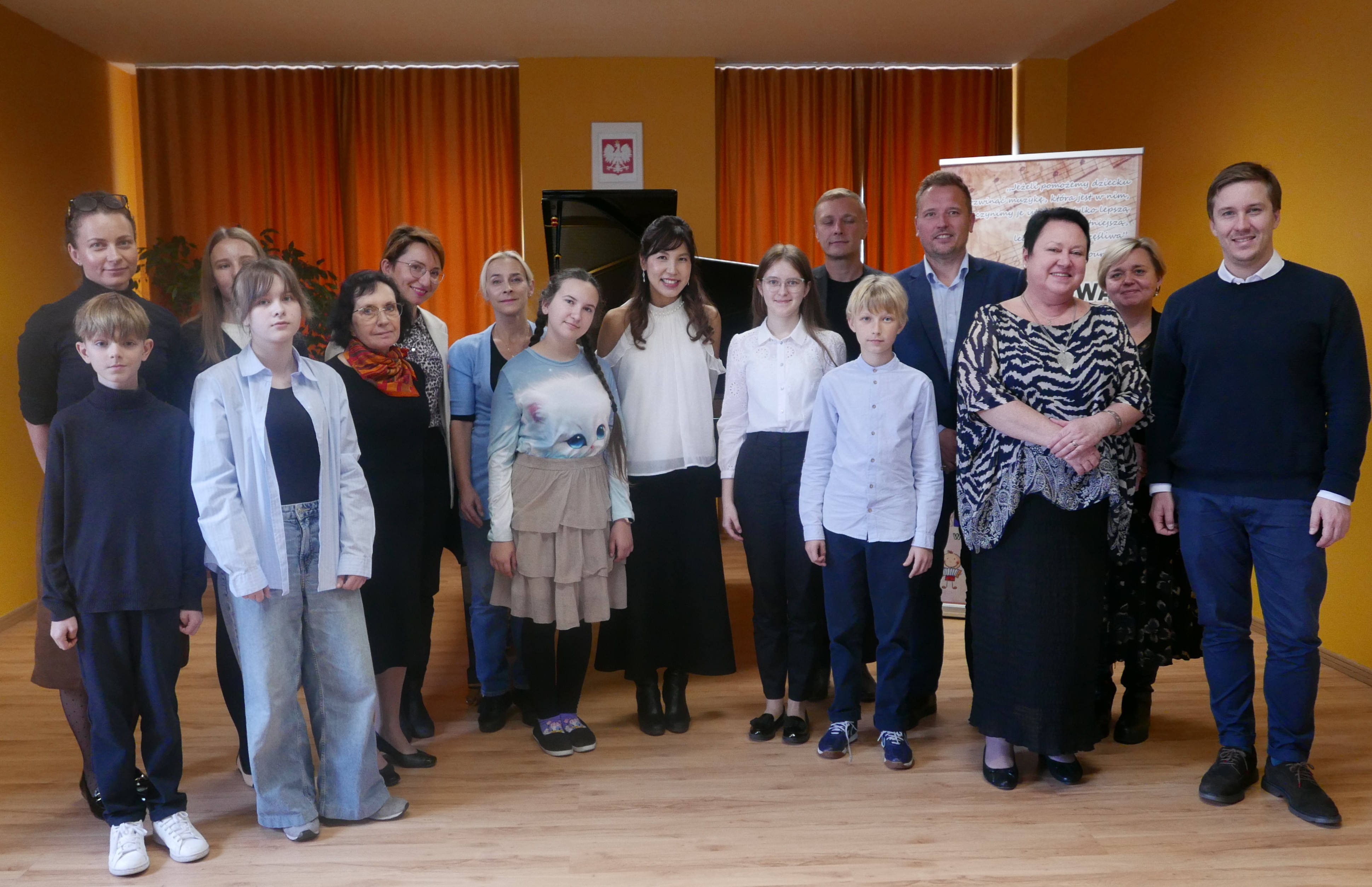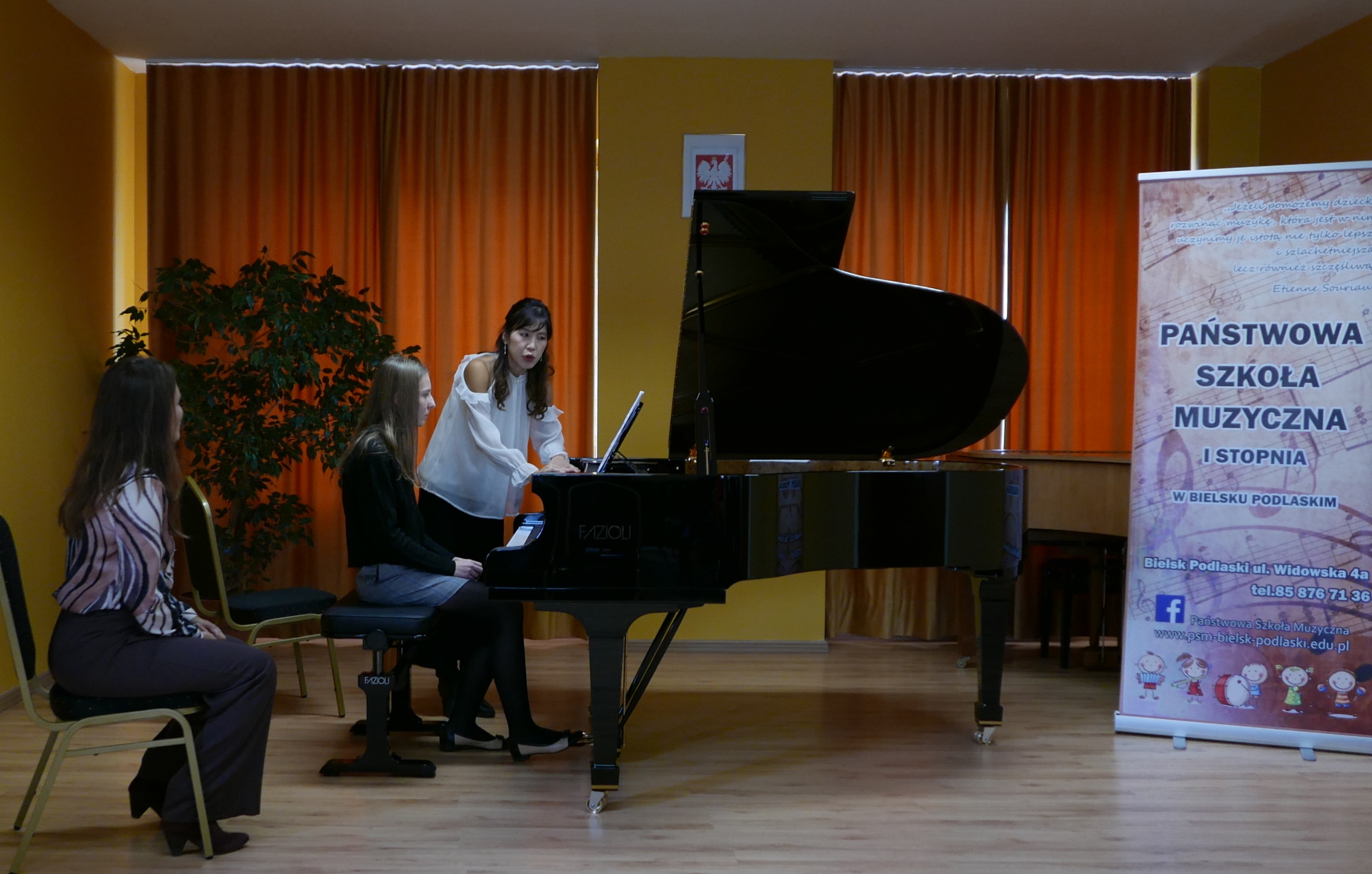 17 października 2025r. przeżyliśmy wielkie wydarzenie w ponad pięćdziesięcioletniej historii naszej szkoły. Tego dnia zawitał do nas wybitny gość, światowej sławy pianistka - Pani Rachel Naomi Kudo, która poprowadziła trzygodzinne warsztaty fortepianowe dla uczniów i nauczycieli szkół muzycznych. W warsztatach wzięli udział uczniowie: PSM I st. w Bielsku Podlaskim, PSM I st. im. Wojciecha Kilara w Siemiatyczach, Samorządowej Szkoły Muzycznej I st. w Wysokiem Mazowieckiem, a także uczestniczka I-go roku DIMK. Pani Rachel Naomi Kudo pracowała z uczniami nad utworami takich kompozytorów jak: J.S.Bach, P. Dylewski, B. Martinu, W. Lutosławski, J. Haydn oraz F. Chopin. Wszyscy uczestnicy mieli możliwość zagrania utworów w swojej interpretacji, nastepnie pod okiem wybitnej pianistki rozwinąć indywidualne zdolności, pogłębić technikę gry oraz aktywnie zaangażować się w ćwiczenia, wymianę wiedzy i doświadczeń między pianistami o różnym poziomie zaawansowania. Pracowano również nad wydobyciem pełnego i czystego dźwięku w interpretacji utworów. Zarówno uczniowie jak i nauczyciele byli pod ogromnym wrażeniem zaangażowania Pani Rachel Naomi Kudo, która z wielką precyzją pokazała, jak zdobyte umiejętności można wykorzystać w praktyce, a nad jakimi aspektami warto jeszcze popracować.
