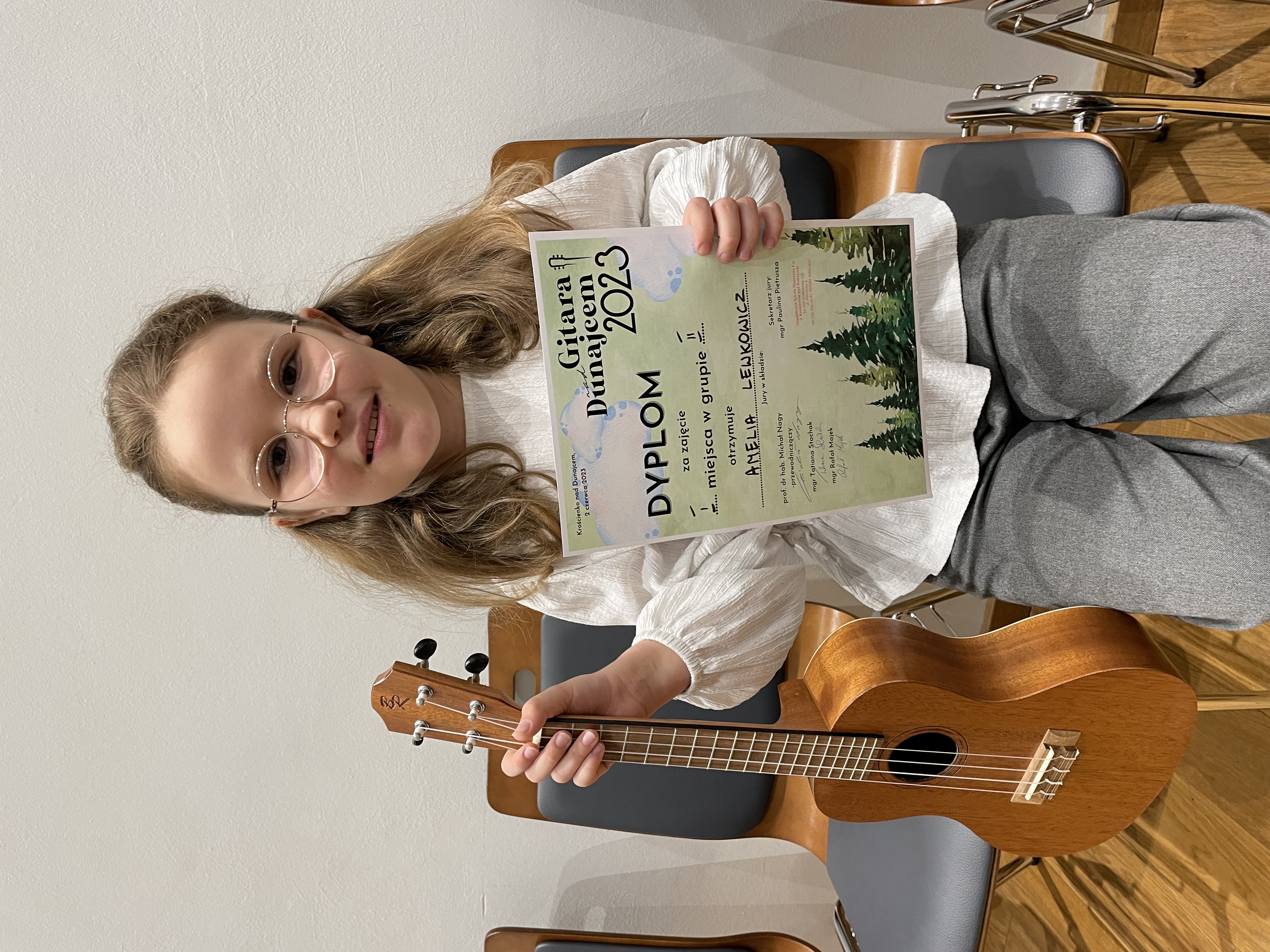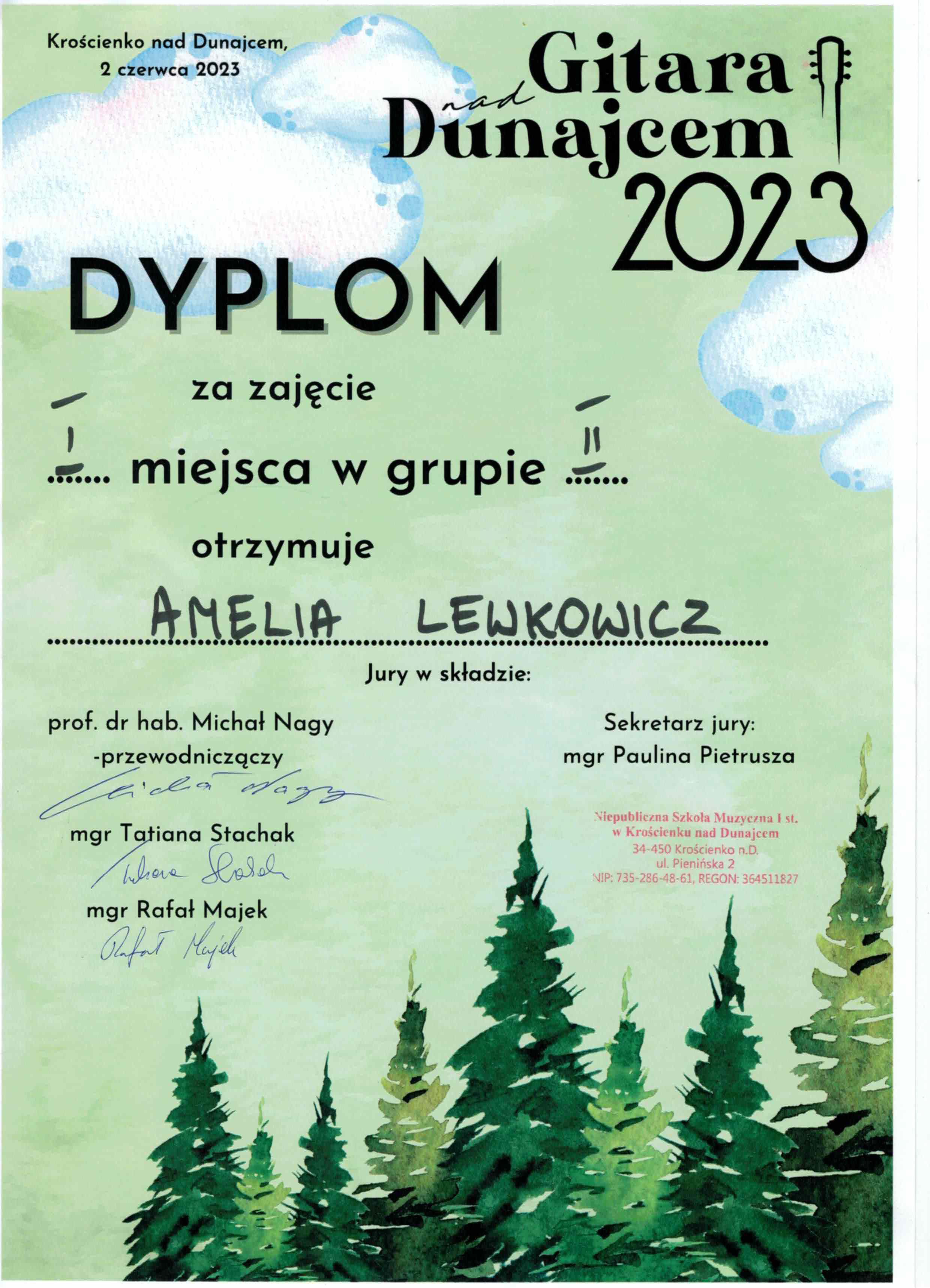Gitara nad Dunajcem 2023. Dyplom za zajęcie I miejsca w grupie II otrzymuje Amelia Lewkowicz
