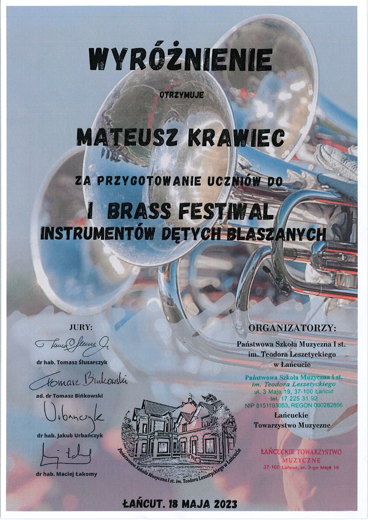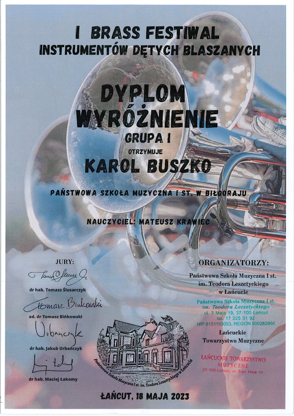 Karol Buszko - wyróżnienie - I Ogólnopolski Konkurs Brass Festiwal w Łańcucie - 18 maja 2023 r.