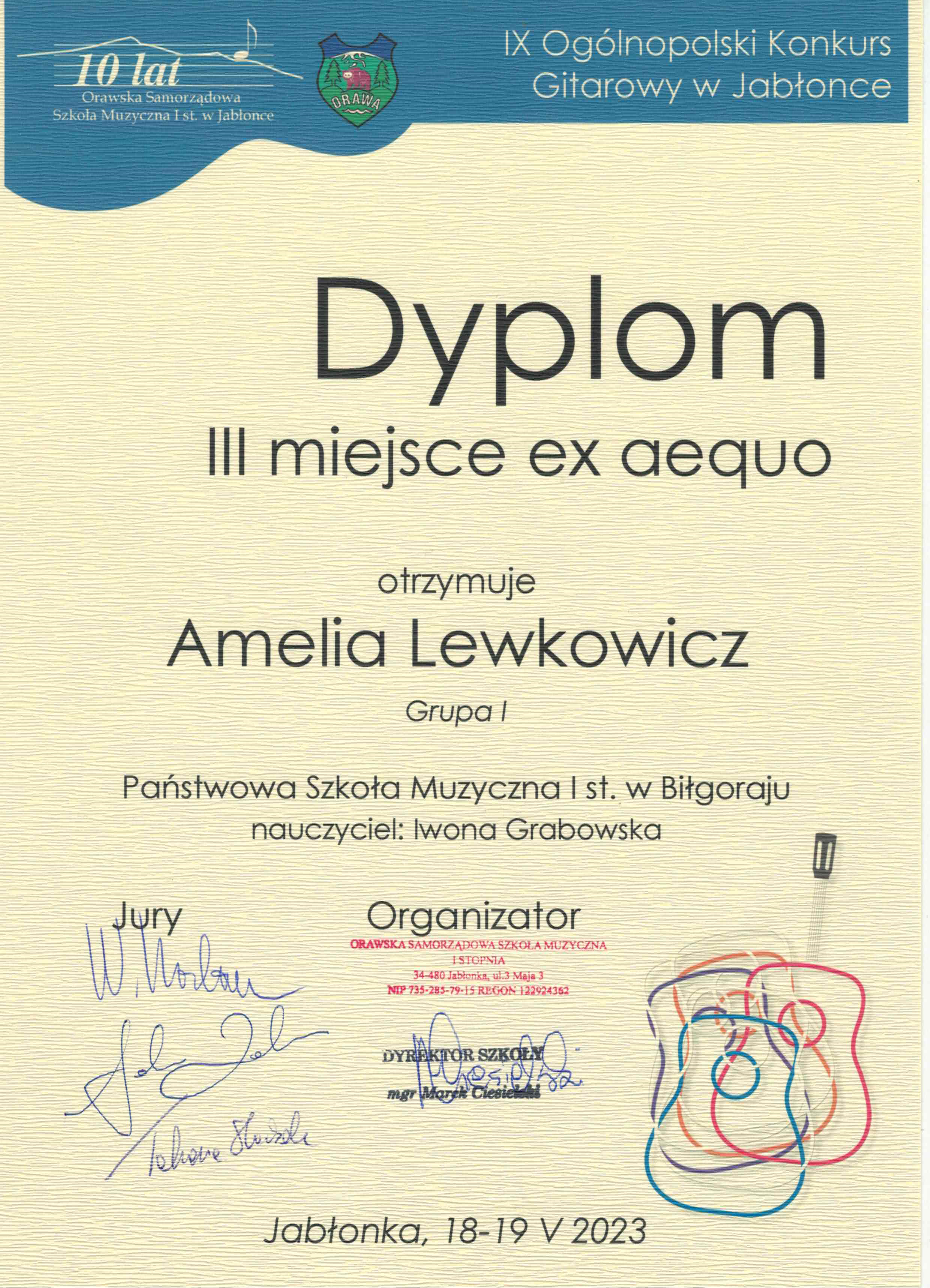 III miejsce zajęła Amelia Lewkowicz w IX Ogólnopolskim Konkursie Gitarowym w Jabłonce w dn. 19 maja 2023 r.