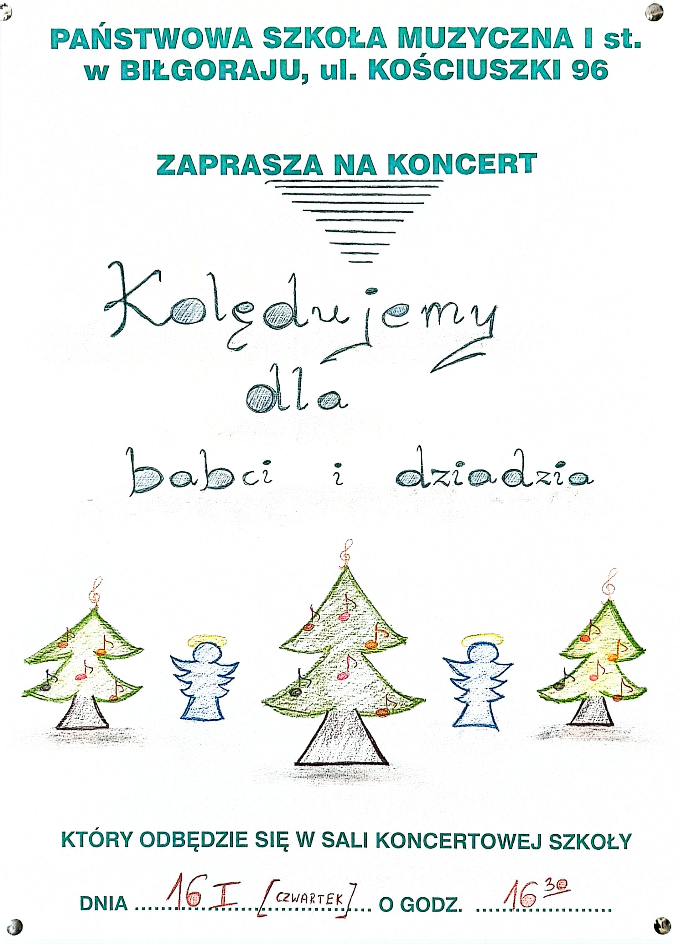 Koncert kolęd z okazji dnia babci i dziadka w PSM I st. w Biłgoraju, odbędzie się 16 stycznia 2025 r. o godzinie 16:30. Serdecznie zapraszamy!
