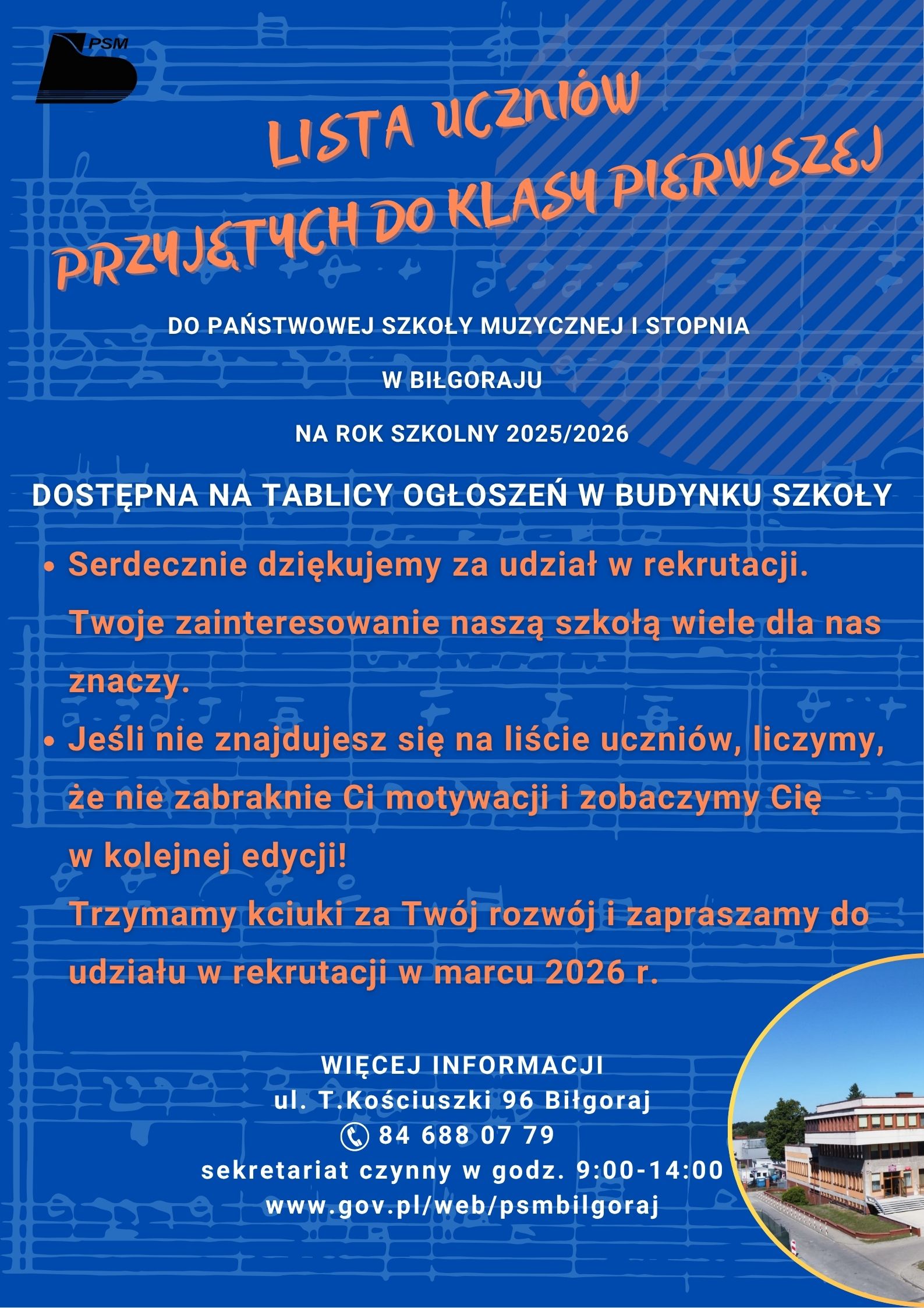 Lista uczniów przyjętych do klas pierwszych PSM I stopnia w Biłgoraju w roku szkolnym 2025/2026 została wywieszona na tablicy ogłoszeń w budynku szkoły w dniu 16 lipca 2025 r.