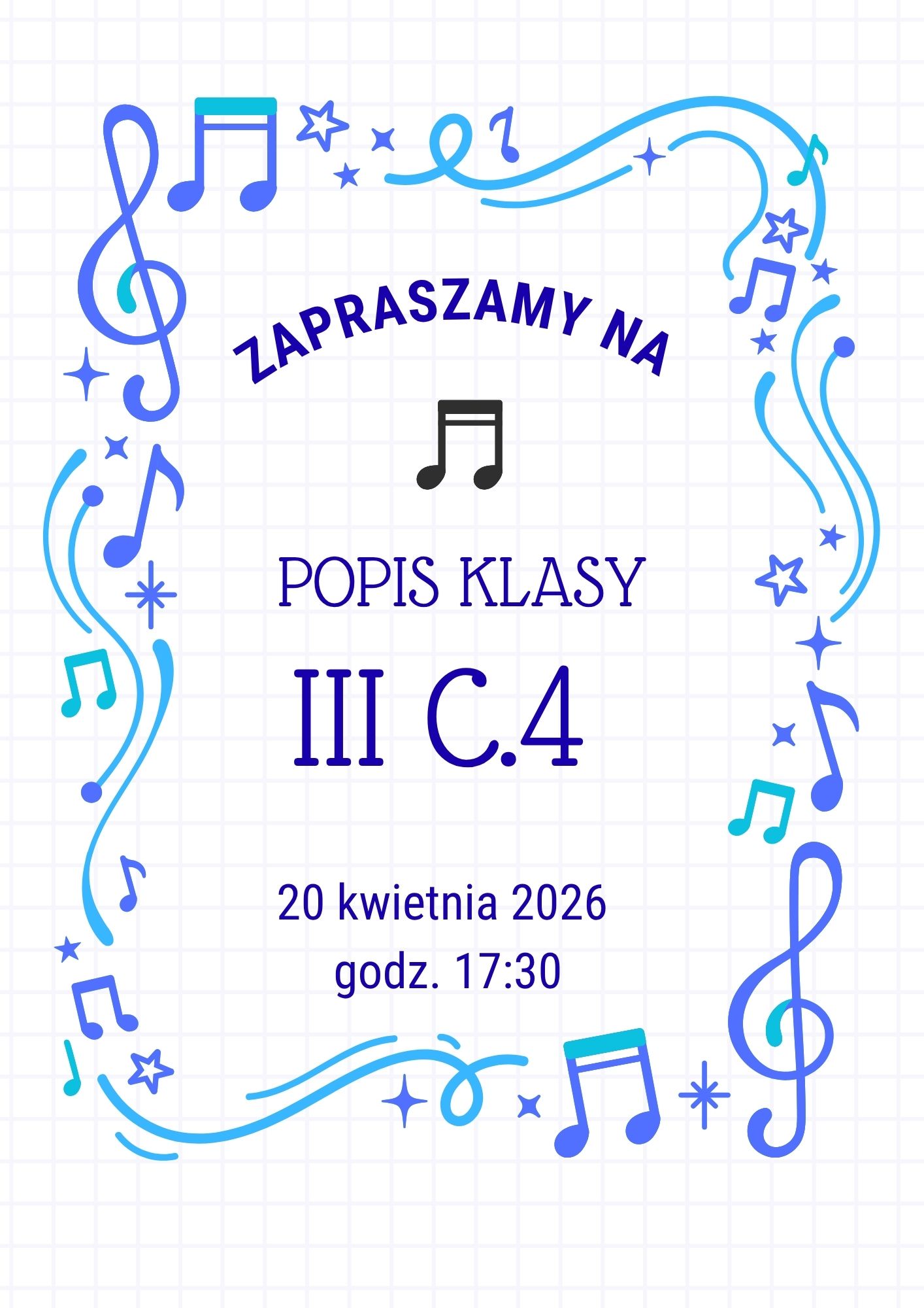 Popis klasy III c. 4 20.04.2026 Zapraszamy na popis klasy III c. 4 - szczegóły na plakacie. Zdjęcia (1) Pokaż zdjęcie 1 z galerii.