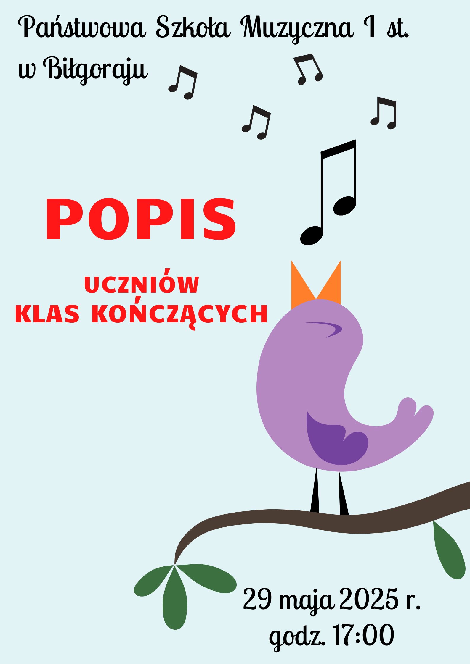 Zapraszamy na popis klas kończących 29 maja 2025 r. o godzinie 17:00.