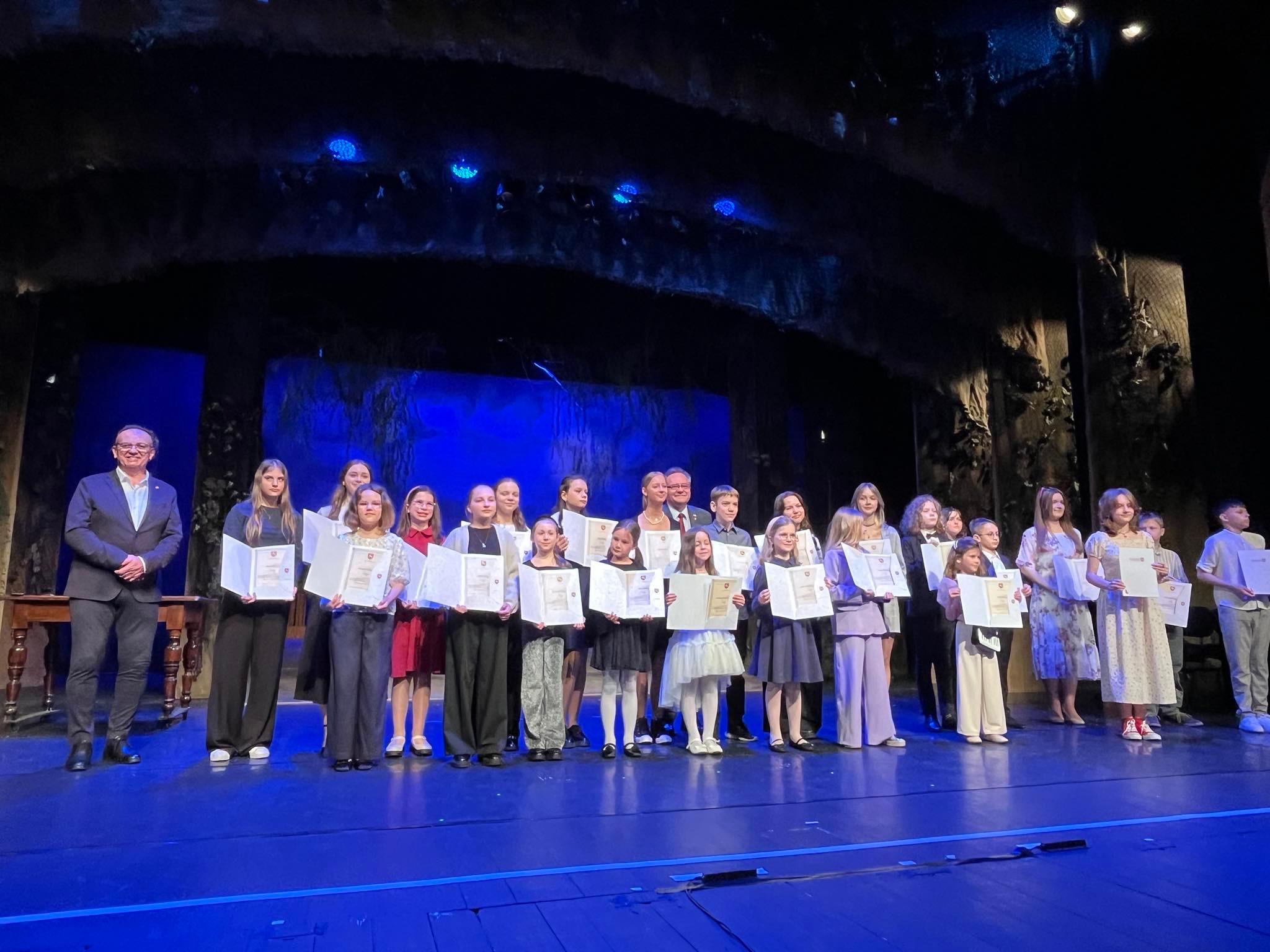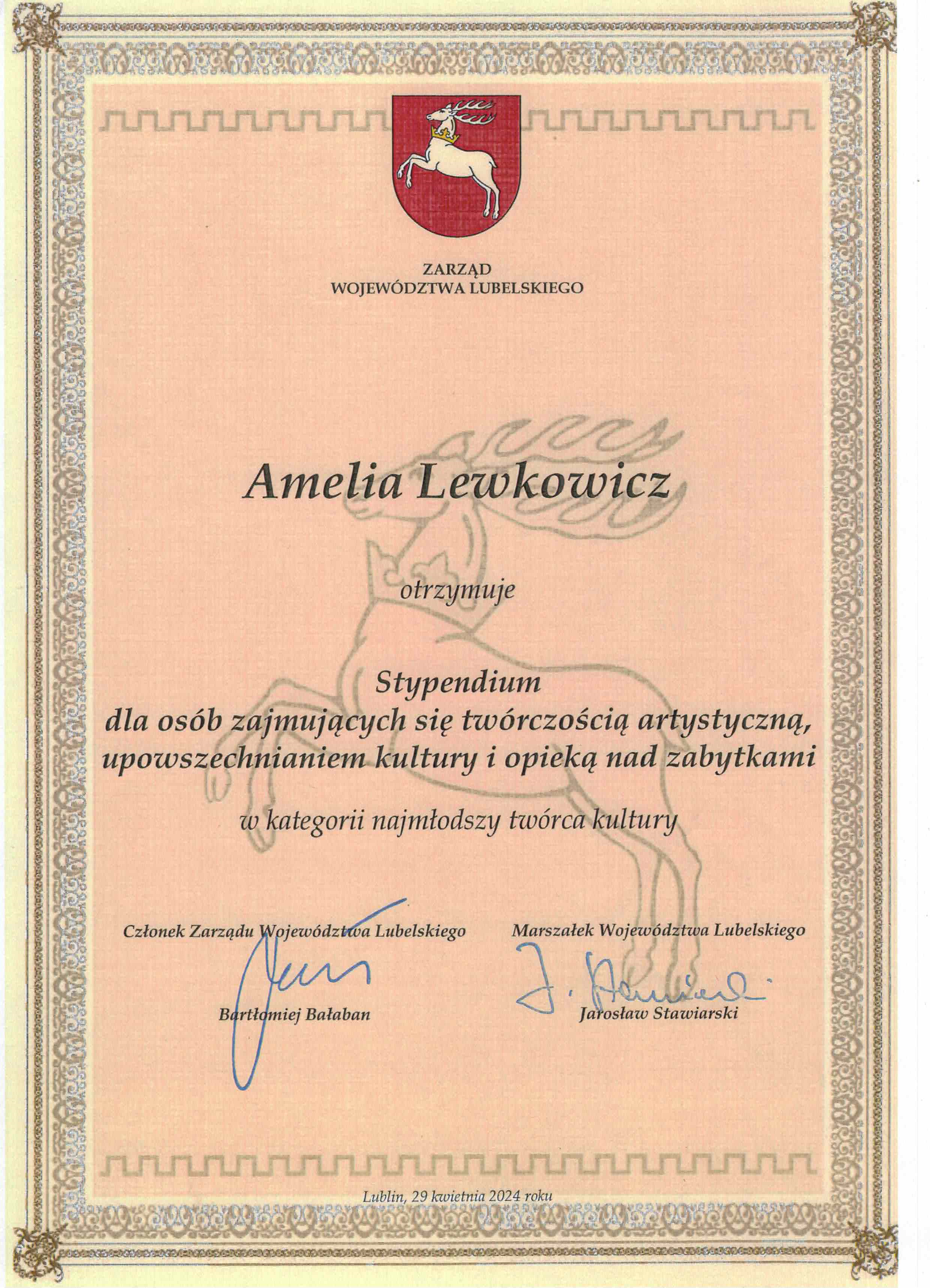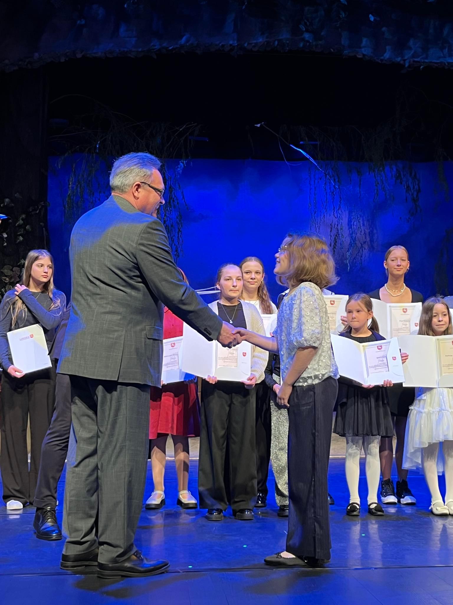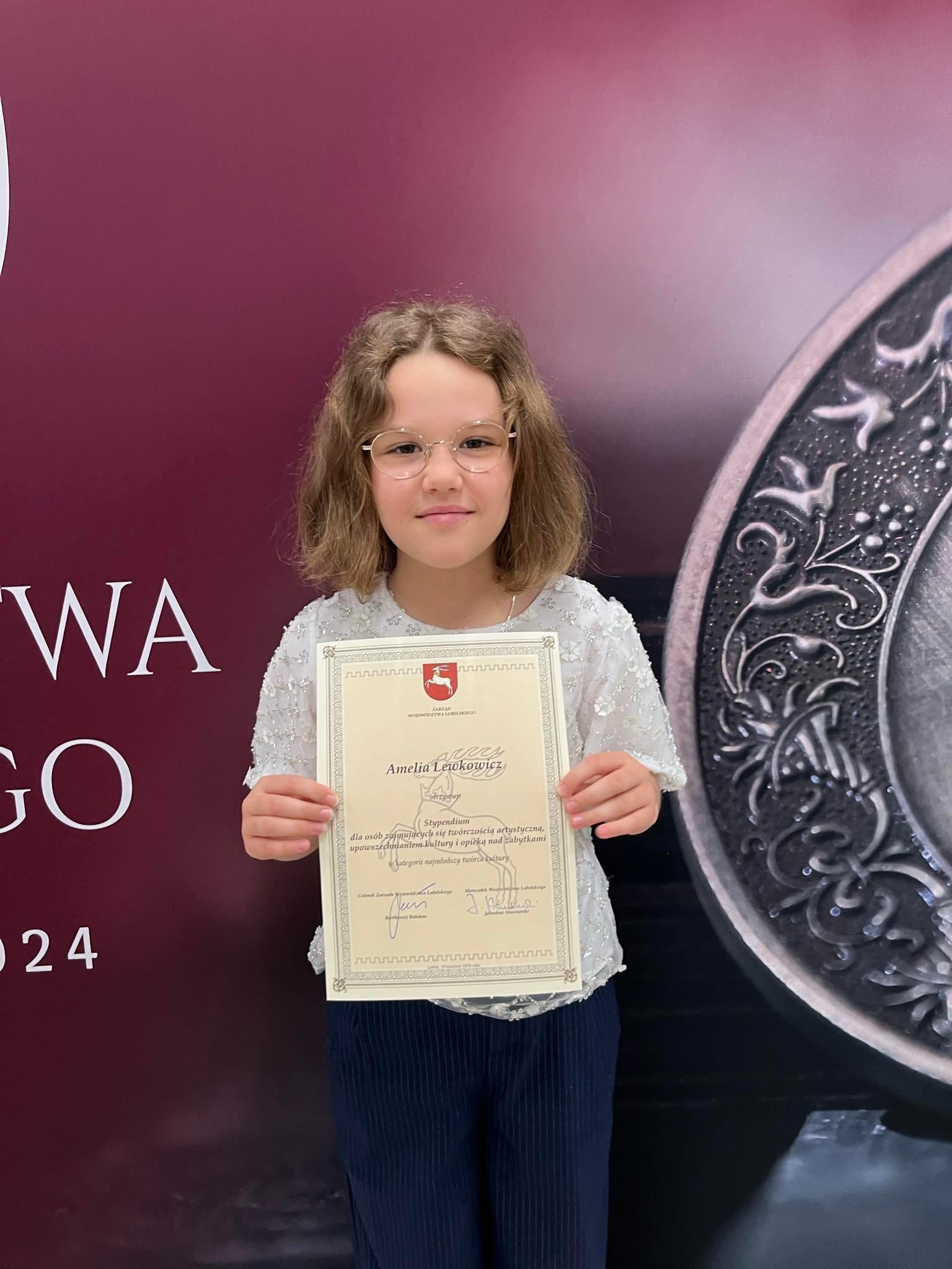 W dniu 29 kwietnia 2024 w sali widowiskowej Opery Lubelskiej odbyło się uroczyste wręczenie stypendiów dla osób zajmujących się twórczością artystyczna, upowszechnianiem kultury i opieką nad zabytkami przez Marszałka Województwa Lubelskiego. Uczennica naszej szkoły Amelia Lewkowicz z klasy IV cyklu 6-letniego gitary pani Iwony Grabowskiej otrzymała stypendium w kategorii "Najmłodszy twórca kultury".