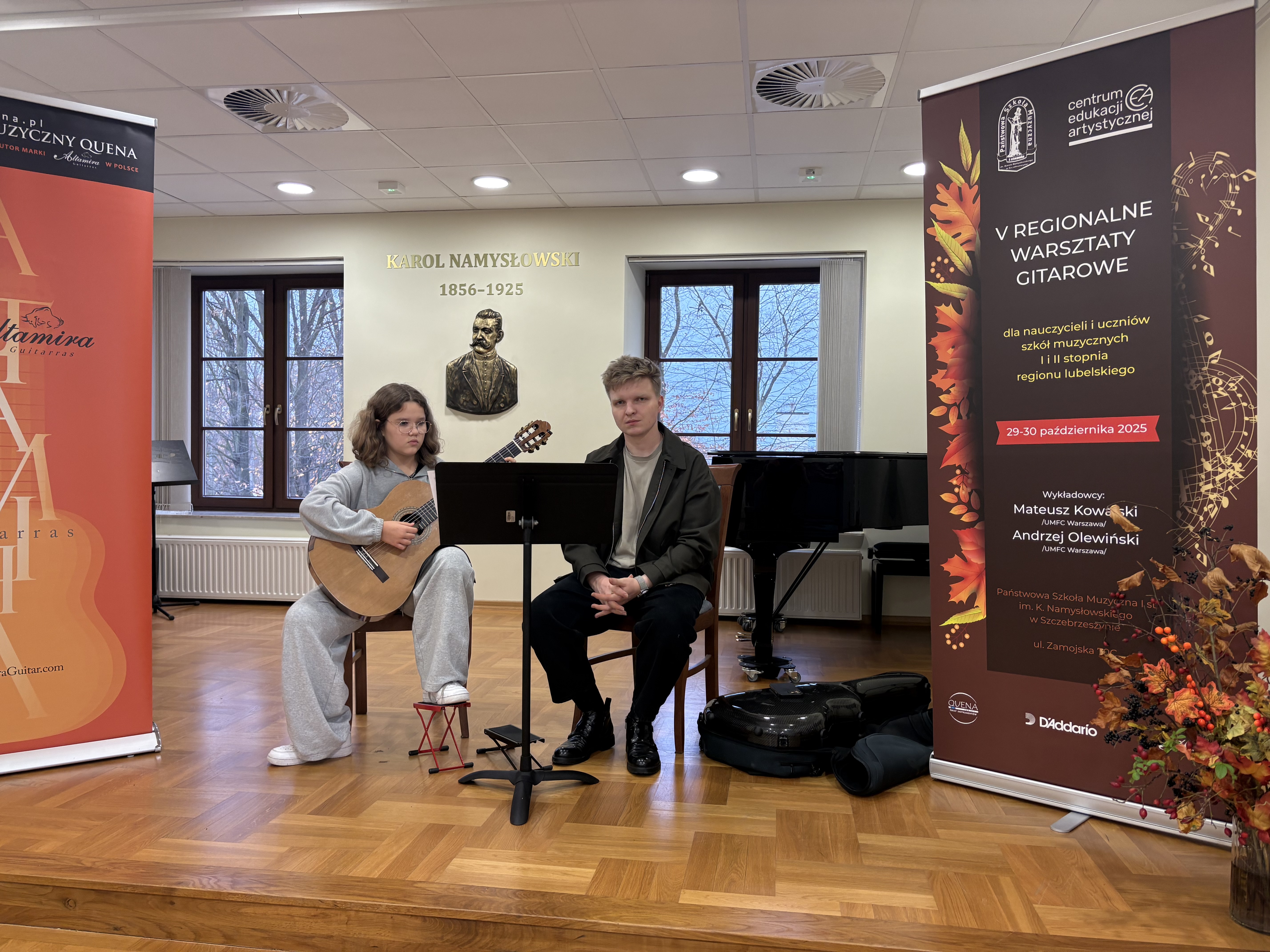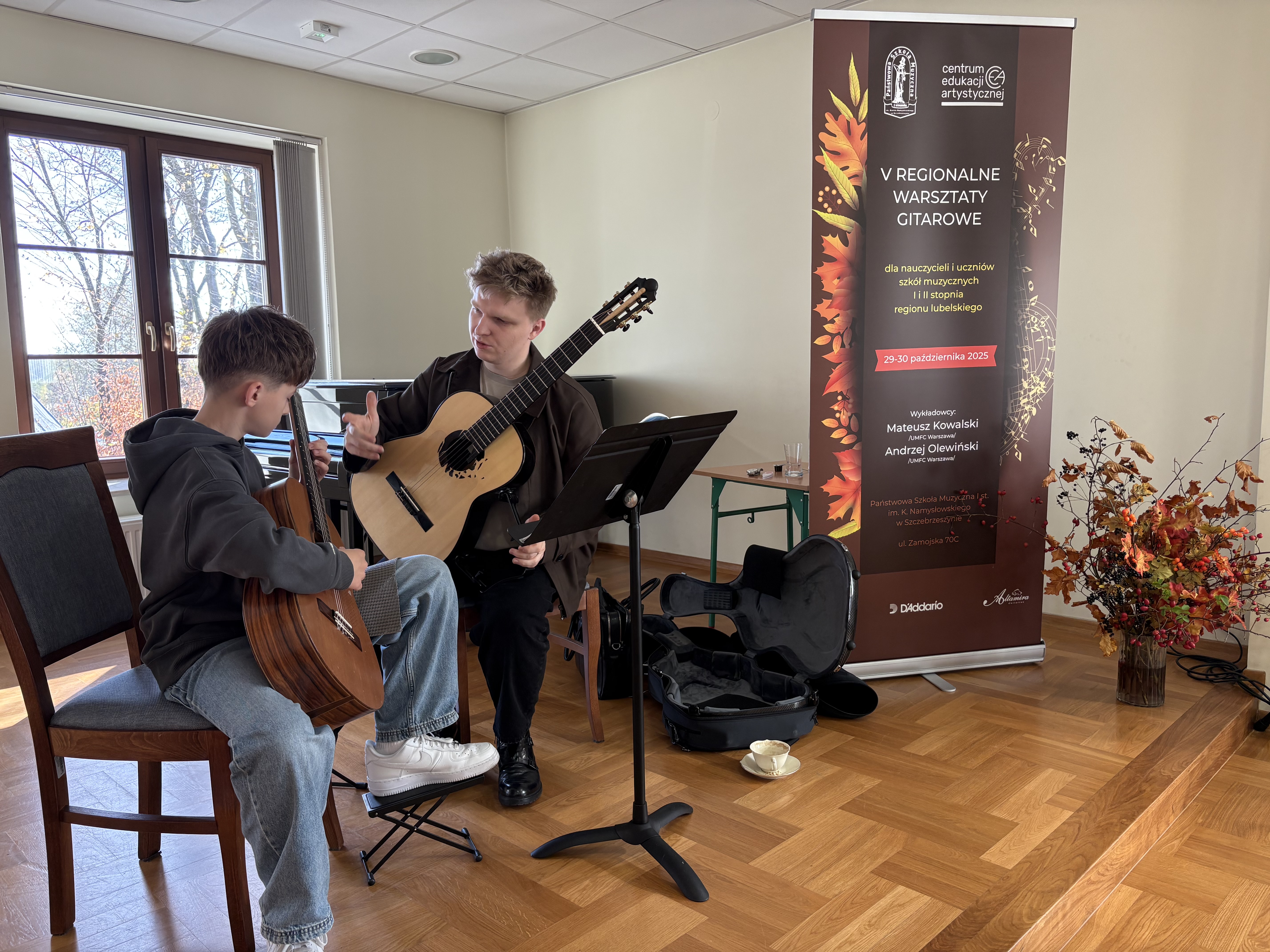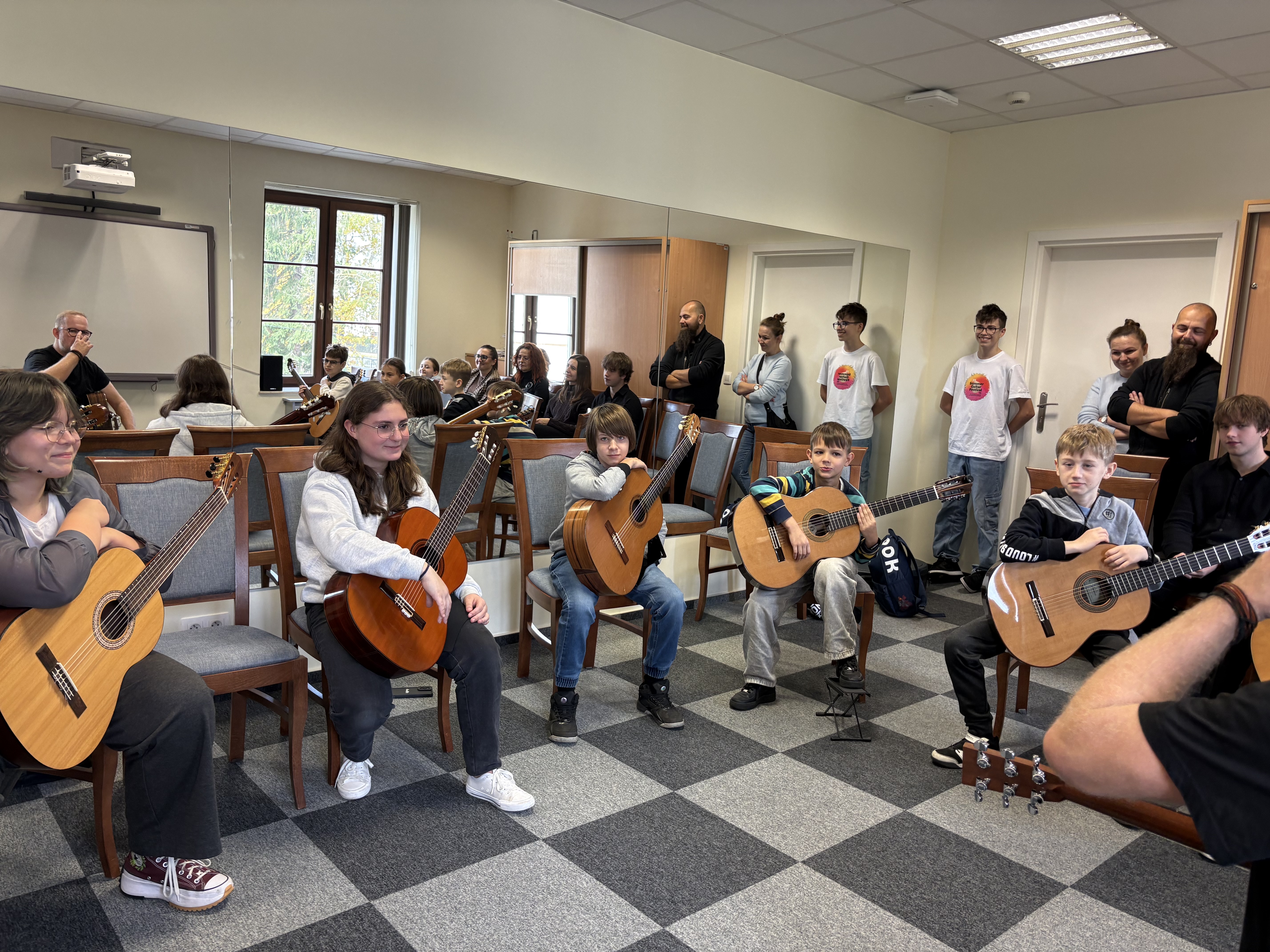 W dniach 29-30 października 2025 uczniowie naszej szkoły - Jan Szabat, Kacper Wysocki, Bartłomiej Szypulski, Maciej Kuśmierczyk oraz Amelia Lewkowicz wraz z nauczycielem panią Iwoną Grabowską wzięli udział w V Regionalnych Warsztatach Gitarowych, które odbyły się w Państwowej Szkole Muzycznej I st. im. K. Namysłowskiego w Szczebrzeszynie. Poprowadzili je wykładowcy UMFC w Warszawie - Mateusz Kowalski oraz Andrzej Olewiński. Oprócz lekcji mistrzowskich, wysłuchali wykładu, wzięli udział w zajęciach z podstaw improwizacji dla gitarzystów klasycznych i wysłuchali pięknego koncertu. Były to dwa dni pełne gitarowych inspiracji.