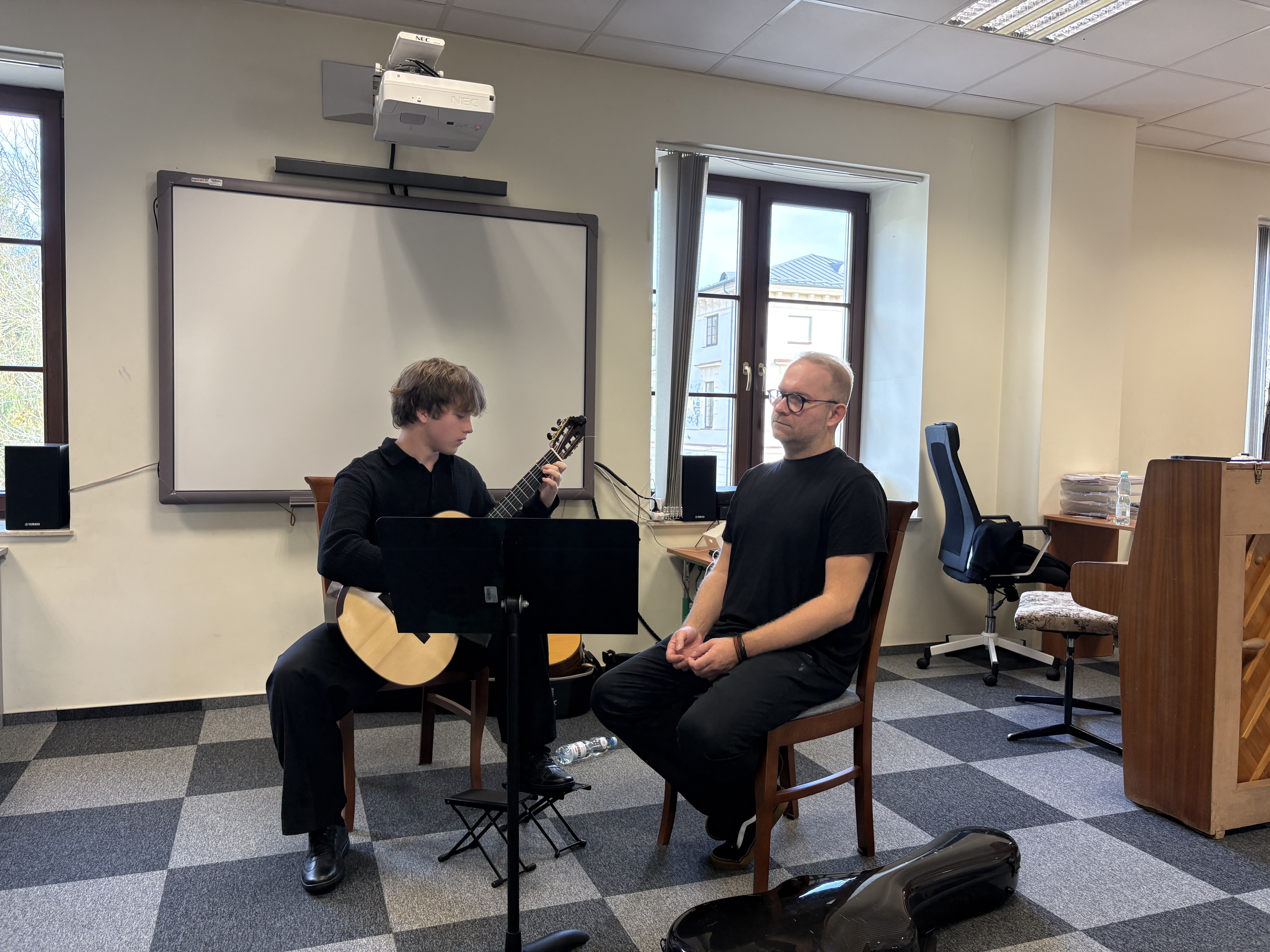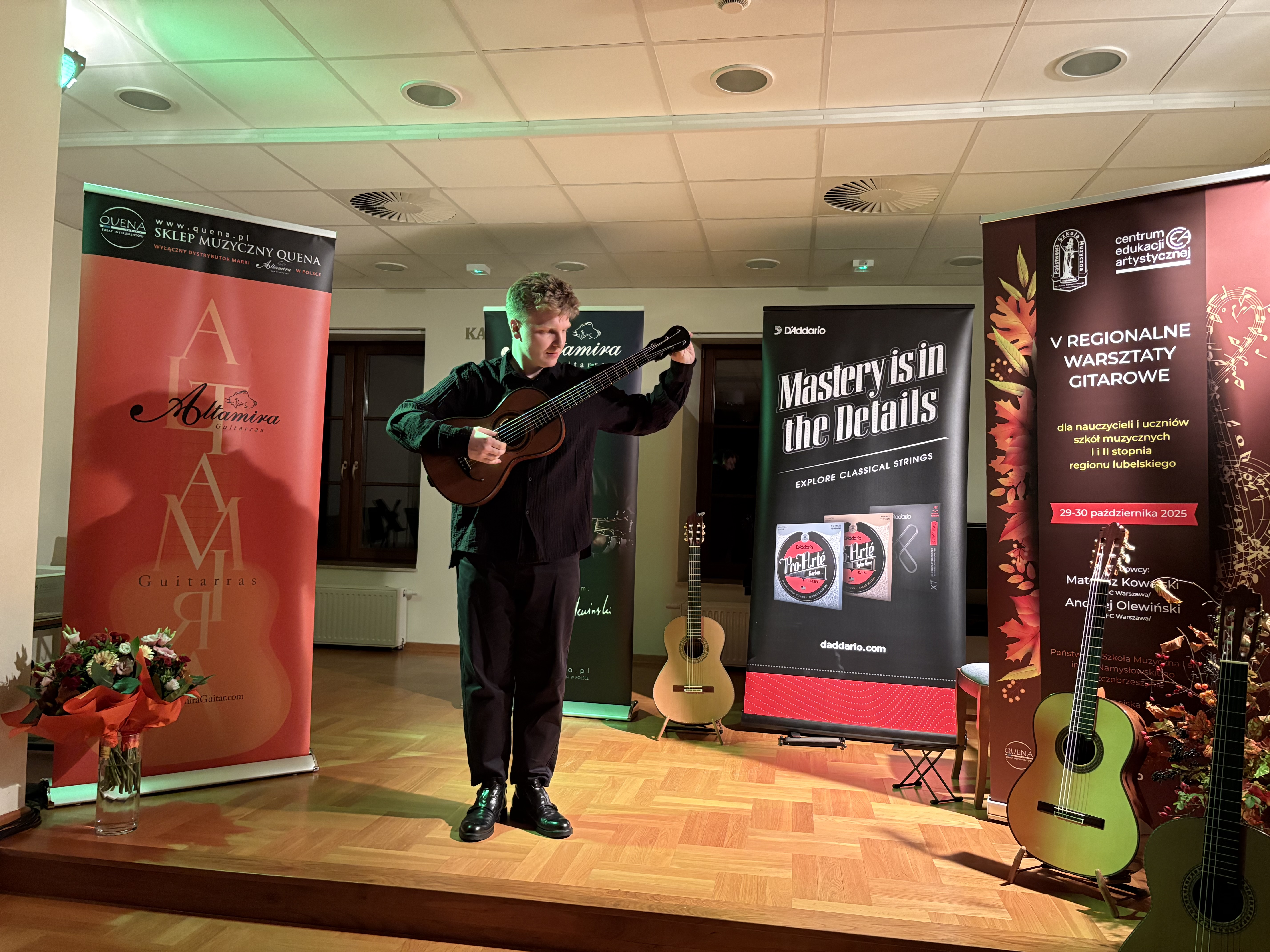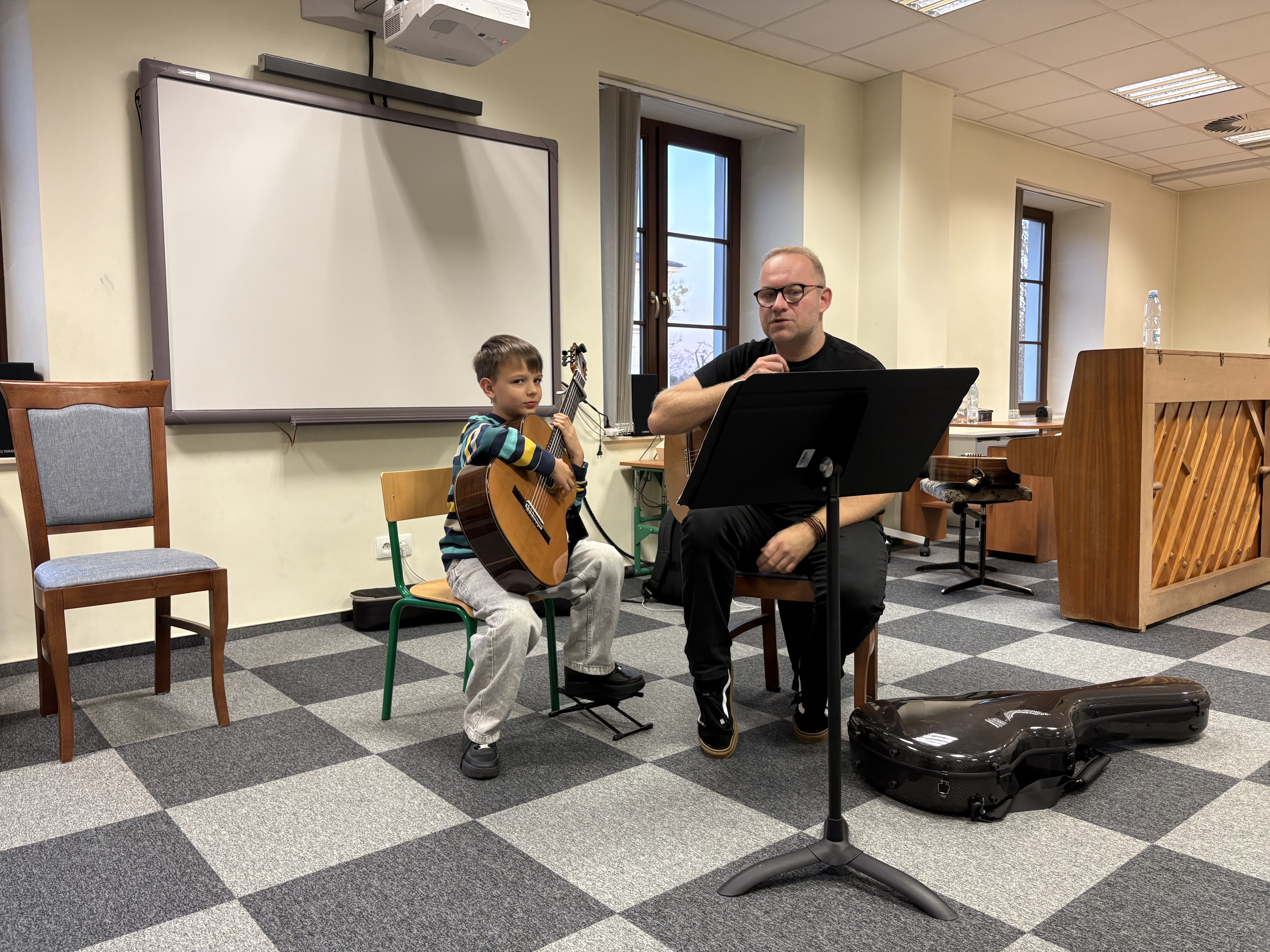 W dniach 29-30 października 2025 uczniowie naszej szkoły - Jan Szabat, Kacper Wysocki, Bartłomiej Szypulski, Maciej Kuśmierczyk oraz Amelia Lewkowicz wraz z nauczycielem panią Iwoną Grabowską wzięli udział w V Regionalnych Warsztatach Gitarowych, które odbyły się w Państwowej Szkole Muzycznej I st. im. K. Namysłowskiego w Szczebrzeszynie. Poprowadzili je wykładowcy UMFC w Warszawie - Mateusz Kowalski oraz Andrzej Olewiński. Oprócz lekcji mistrzowskich, wysłuchali wykładu, wzięli udział w zajęciach z podstaw improwizacji dla gitarzystów klasycznych i wysłuchali pięknego koncertu. Były to dwa dni pełne gitarowych inspiracji.