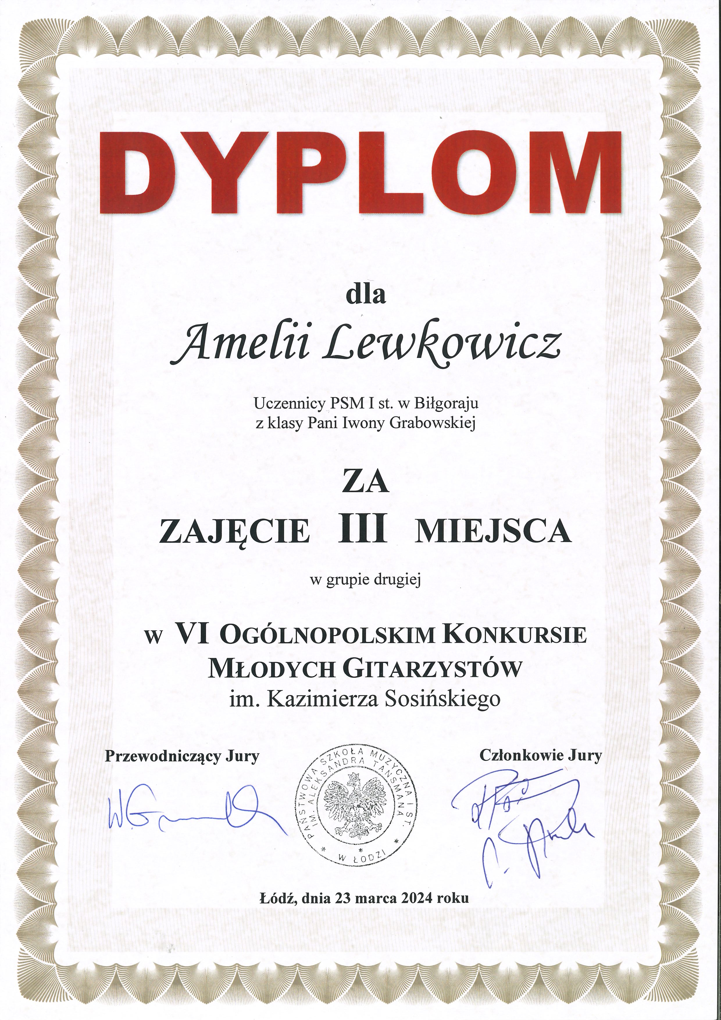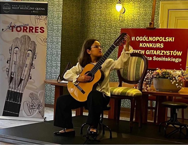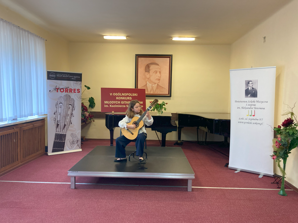 W dniach 22-23 marca 2024 w Łodzi odbył się VI Ogólnopolski Konkurs Młodych Gitarzystów im. Kazimierza Sosińskiego. Uczennica naszej szkoły Amelia Lewkowicz z klasy pani Iwony Grabowskiej została laureatką III miejsca. Konkurs miał dwa etapy, zarówno w pierwszym jaki i drugim Amelia została wysoko oceniona. Prezentacje konkursowe oceniało jury w składzie: przewodniczący - dr hab. Waldemar Gromolak, oraz dr Leszek Potasiński i mgr Mirosław Drożdżowski.