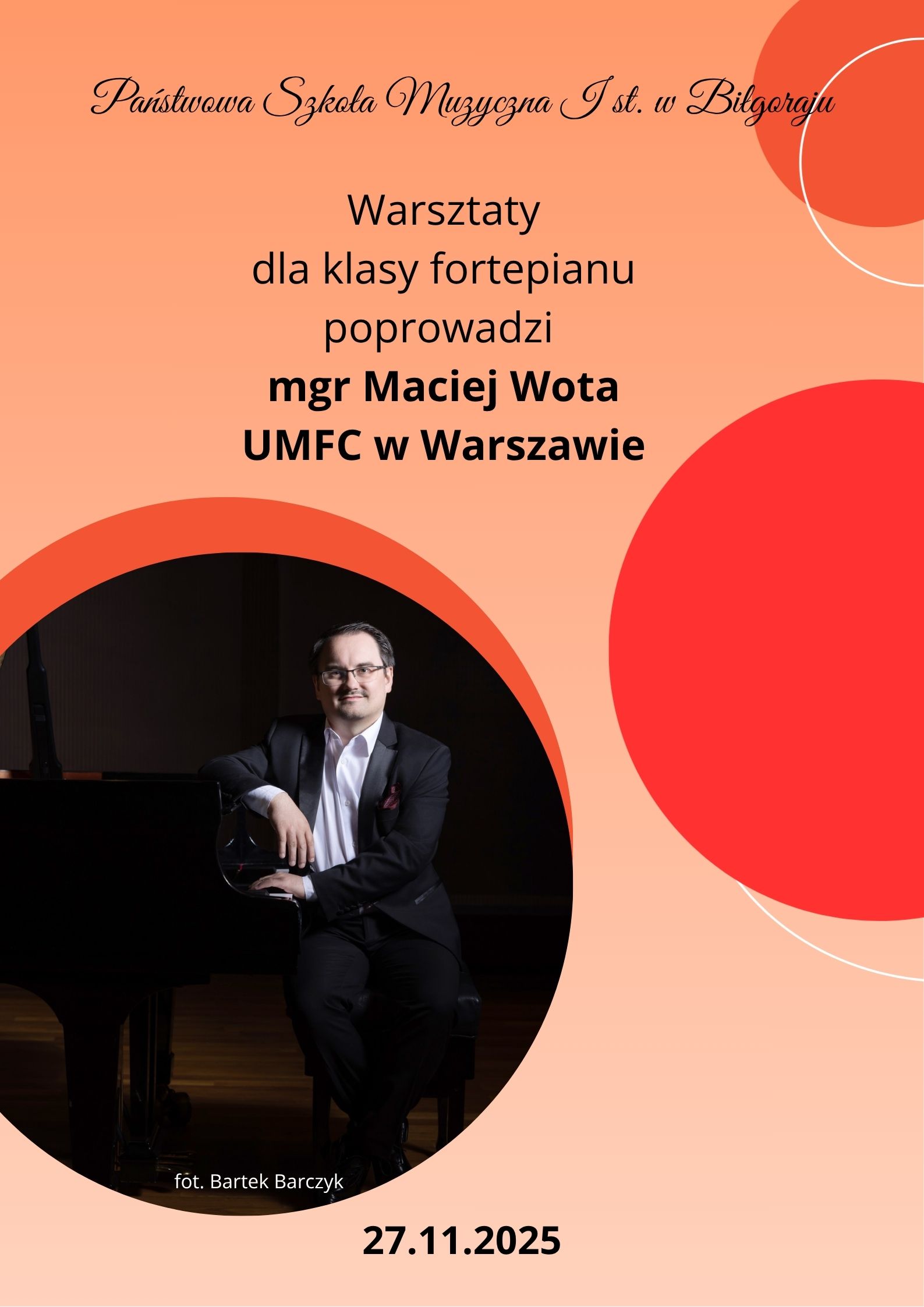 27 listopada 2025 r. odbędą się warsztaty dla klasy fortepianu prowadzone przez pana Macieja Wotę z Uniwersytetu Muzycznego Fryderyka Chopina w Warszawie.