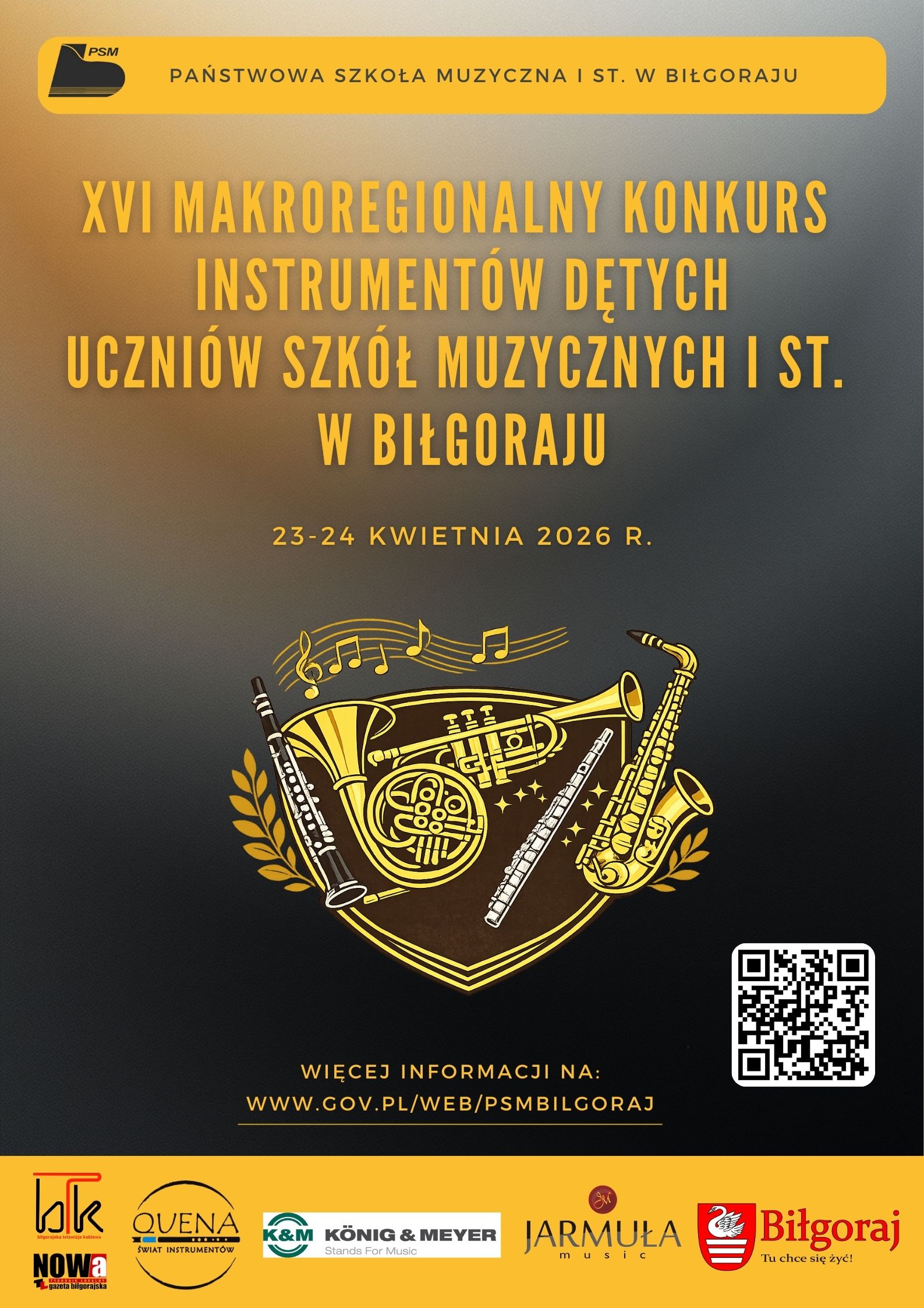 Serdecznie zapraszamy do wzięcia udziału w XVI MAKROREGIONALNYM KONKURSIE INSTRUMENTÓW DĘTYCH UCZNIÓW SZKÓŁ MUZYCZNYCH I ST. W BIŁGORAJU który odbędzie się w dniach 23 – 24 kwietnia 2026 r. w Państwowej Szkole Muzycznej I stopnia w Biłgoraju.