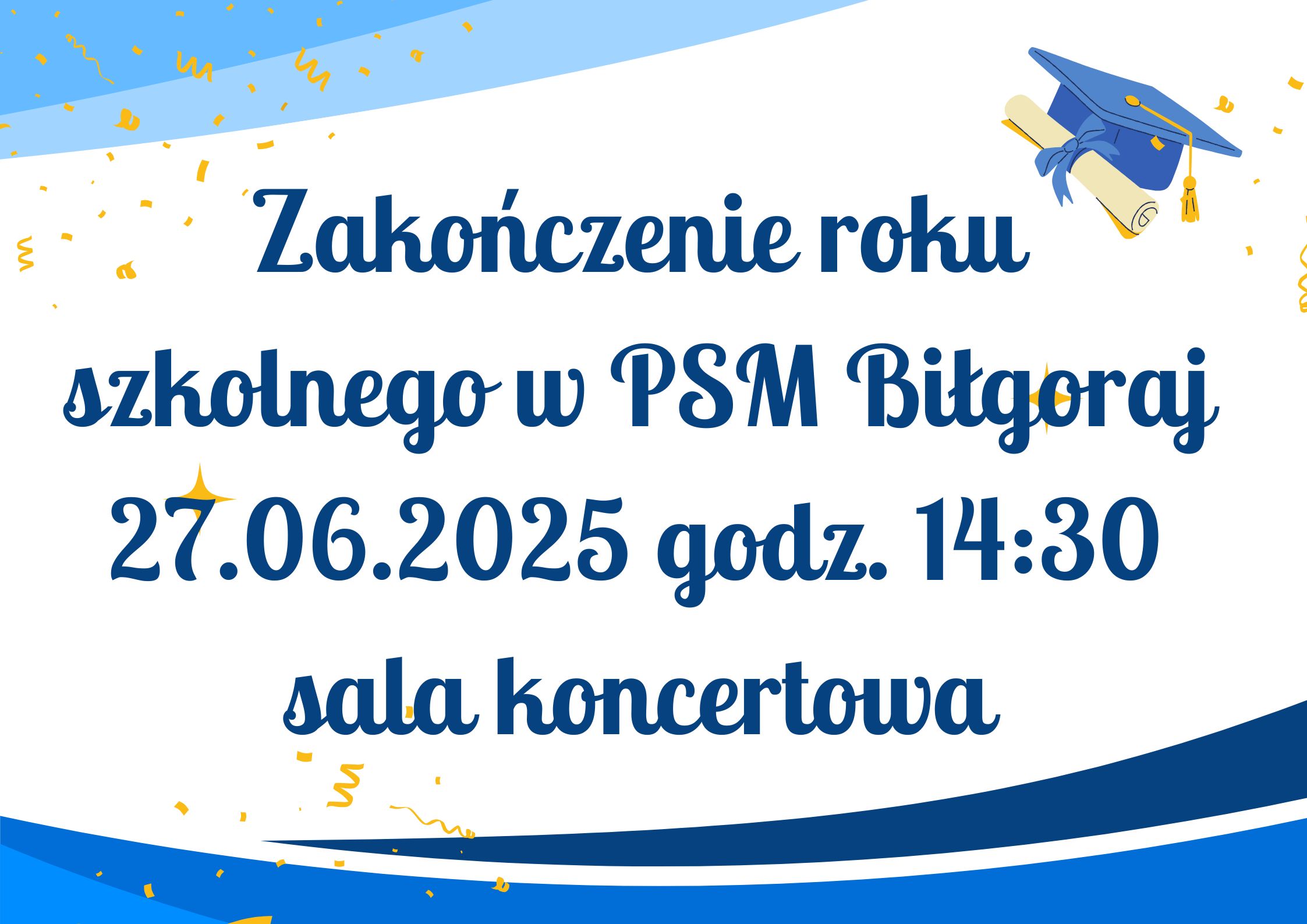 Zakończenie roku szkolnego 2024/2025 odbędzie się 27 czerwca 2025 r. o godzinie 14:30 w klimatyzowanej sali koncertowej naszej szkoły.