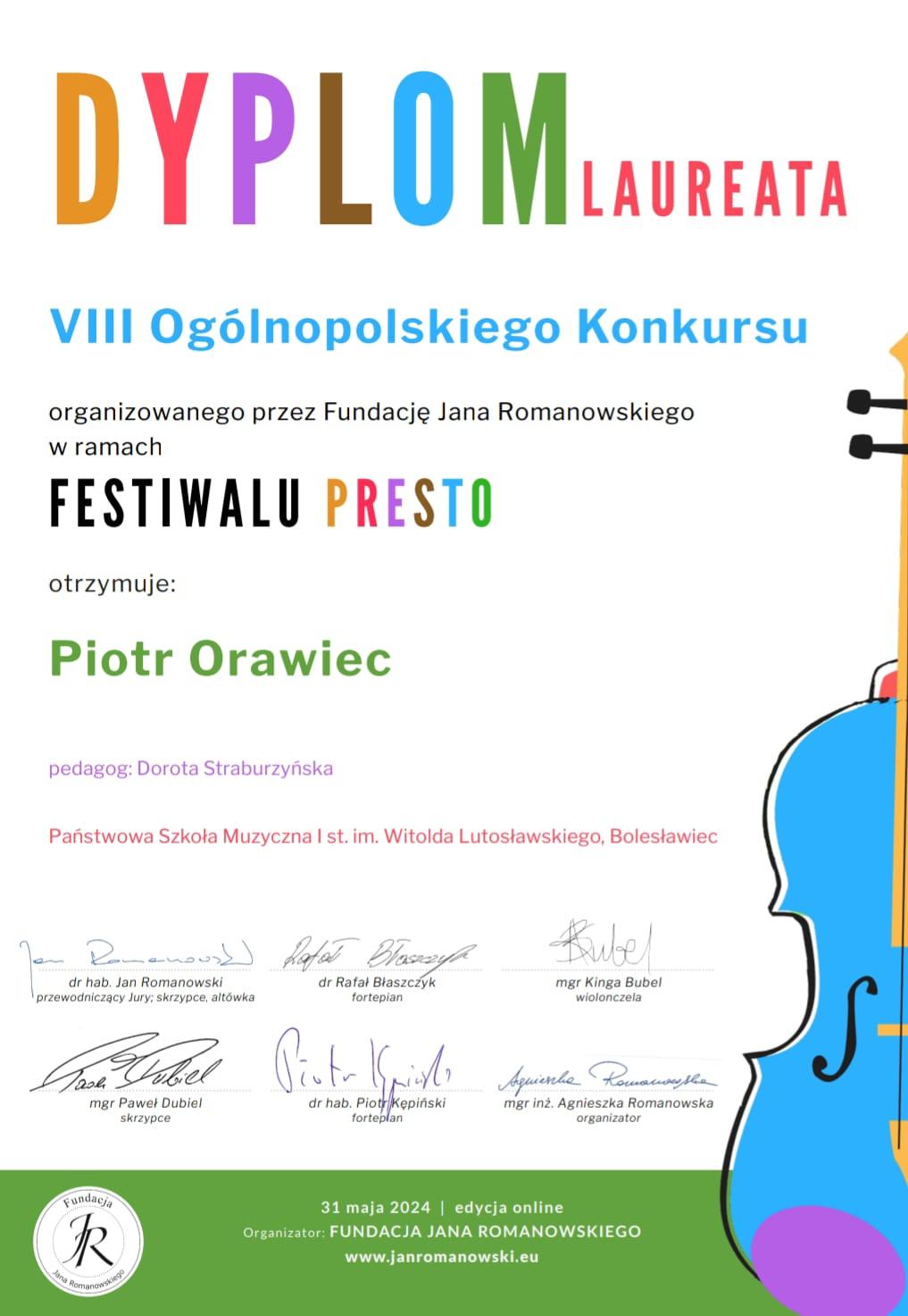 w VIII Ogólnopolskim Konkursie organizowanym przez Fundacj臋 Jana Romanowskiego w ramach FESTIWALU PRESTO. Wraz z dyplomem uczniowie otrzymali od organizatorów konkursu list z wyrazami uznania
