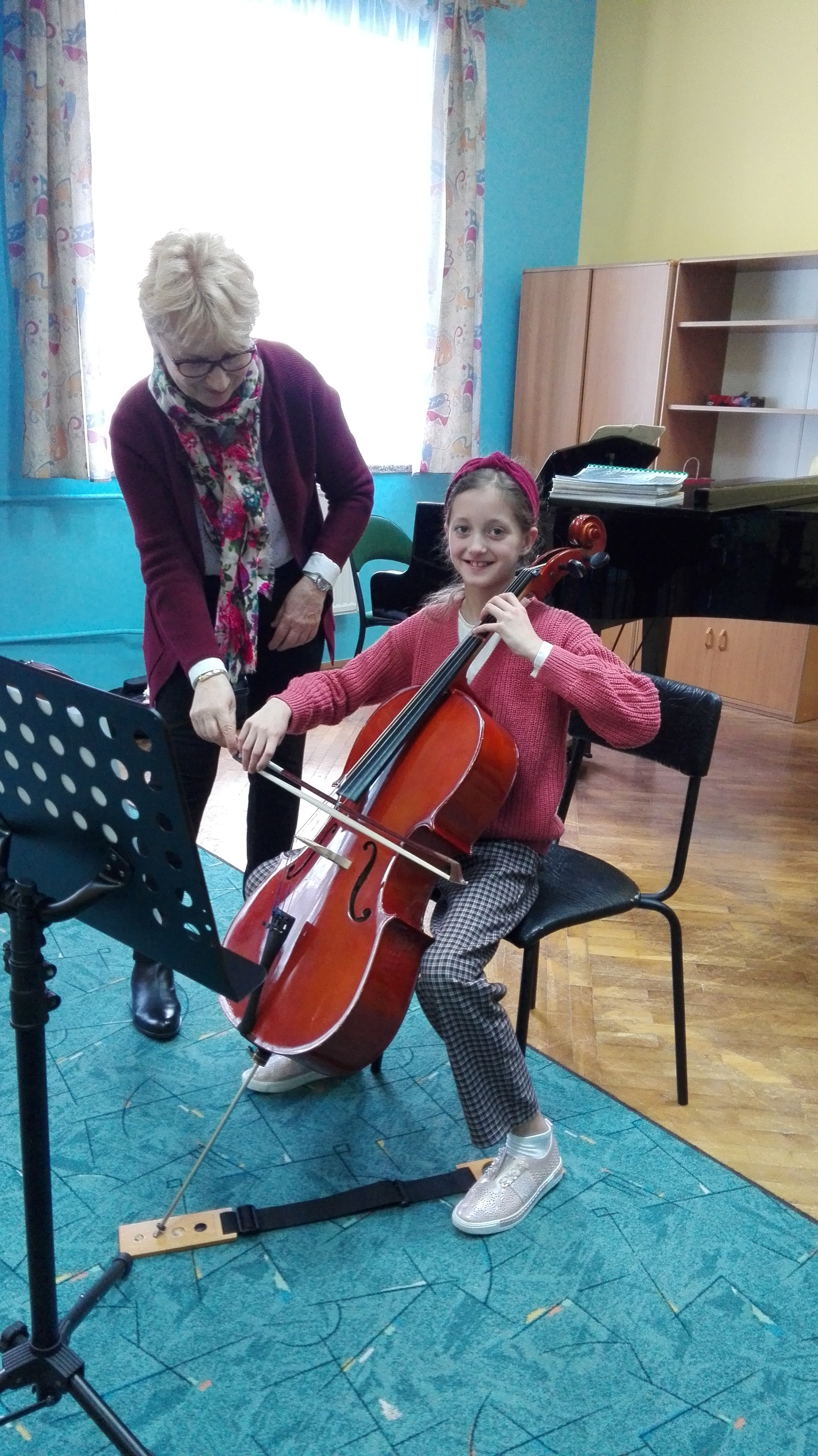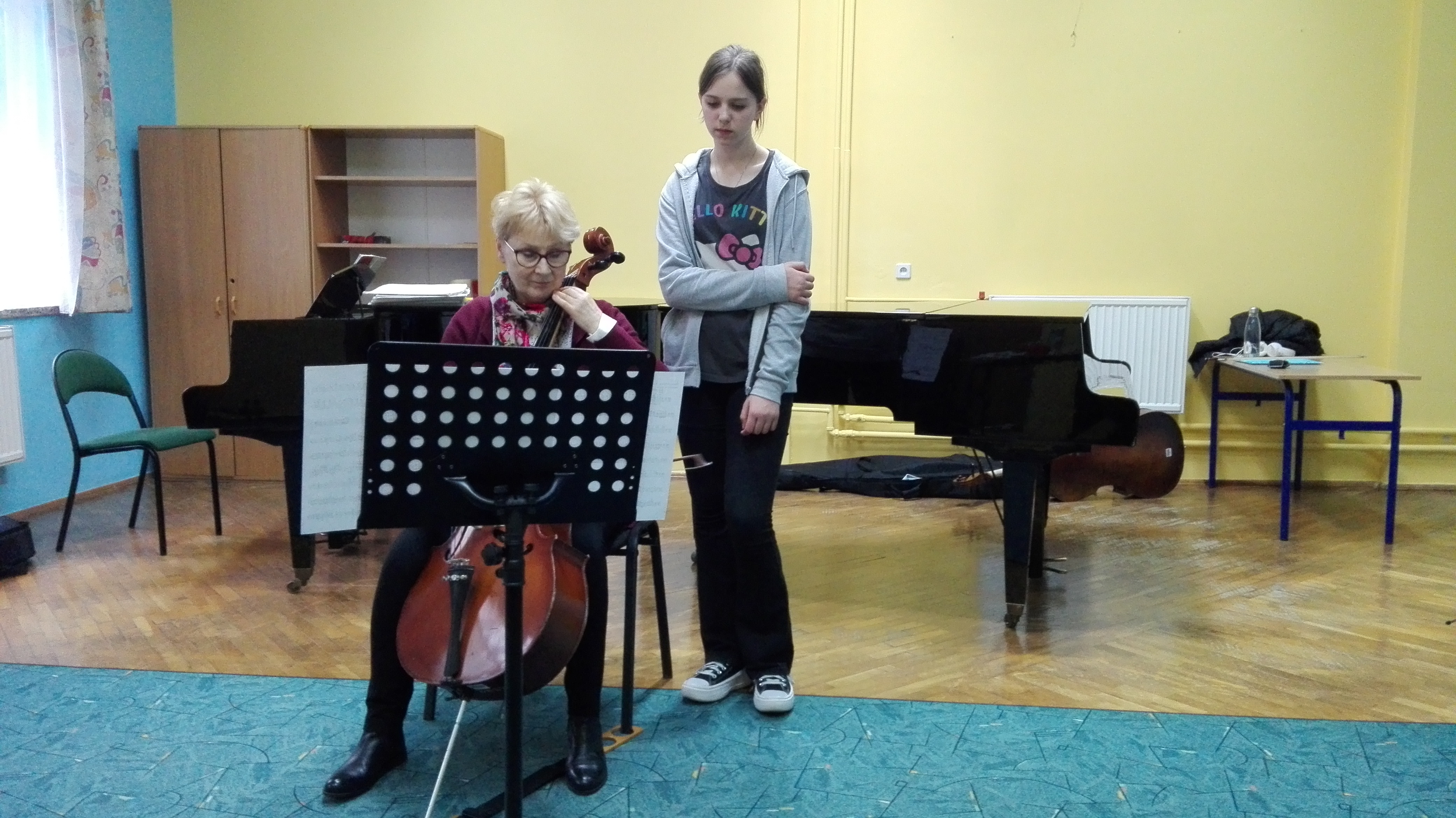 Od godziny 13.30 w sali nr 12 w nowym budynku odbywały się lekcje indywidualne, podczas których Pani Profesor udzielała wskazówek z zakresu techniki gry oraz interpretacji. Niezwykle ciekawie przebiegły zajęcia z zespołem kameralnym, który przygotowuje się do zbliżającego się szkolnego Konkursu Muzyki Rozrywkowej. Podczas warsztatów uczennice z klasy wiolonczeli mogły się także zapoznać z metodami ćwiczenia podczas wykładu pt. "Jak efektywnie ćwiczyć".