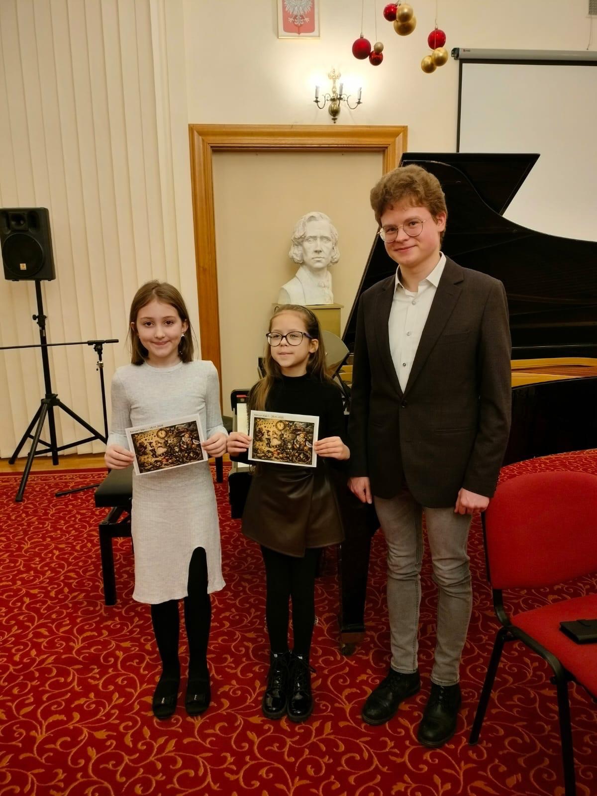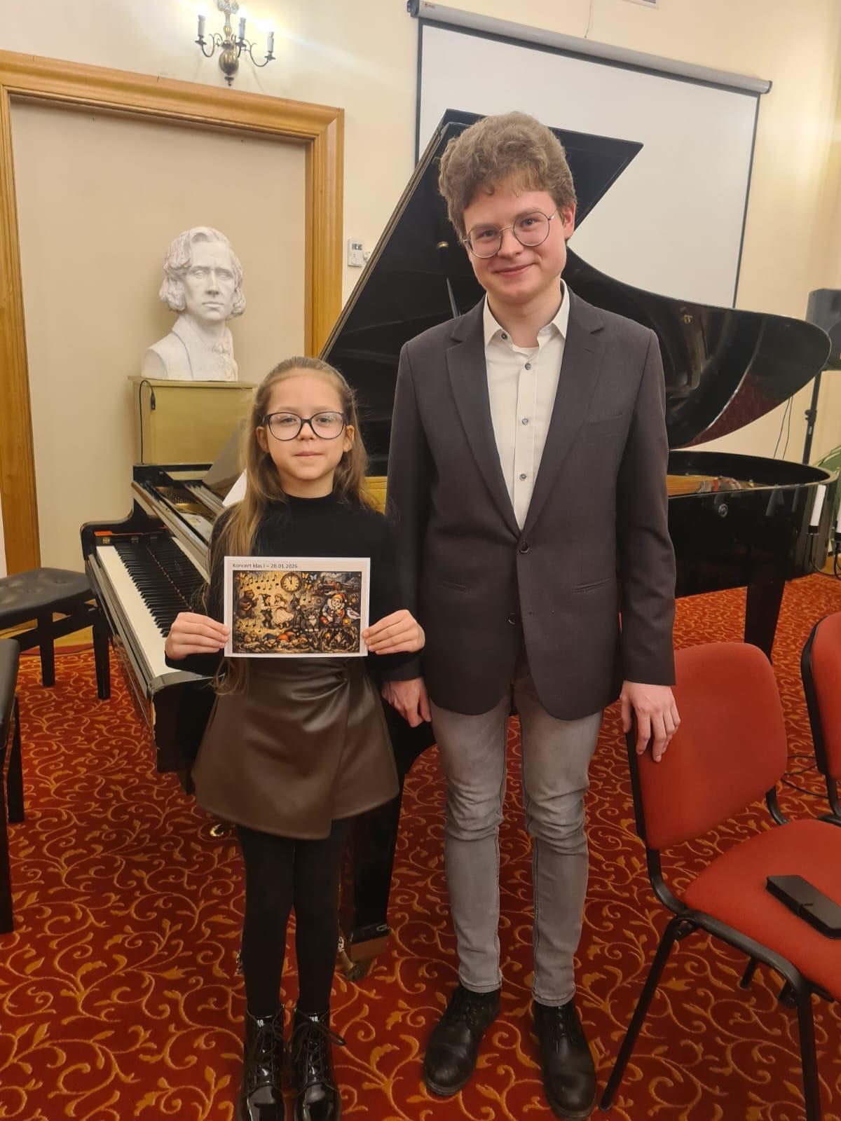 Z kolei dziś (28.01) również uczennice pana Mikołaja – Zofia Tambur i Julia Buchowska – wystąpiły w Legnicy, tym razem w Zespole Szkół Muzycznych im. Fryderyka Chopina. Dziewczęta zagrały podczas koncertu zorganizowanego w ramach pianistycznych prezentacji talentów klas pierwszych, pięknie prezentując swoje umiejętności.