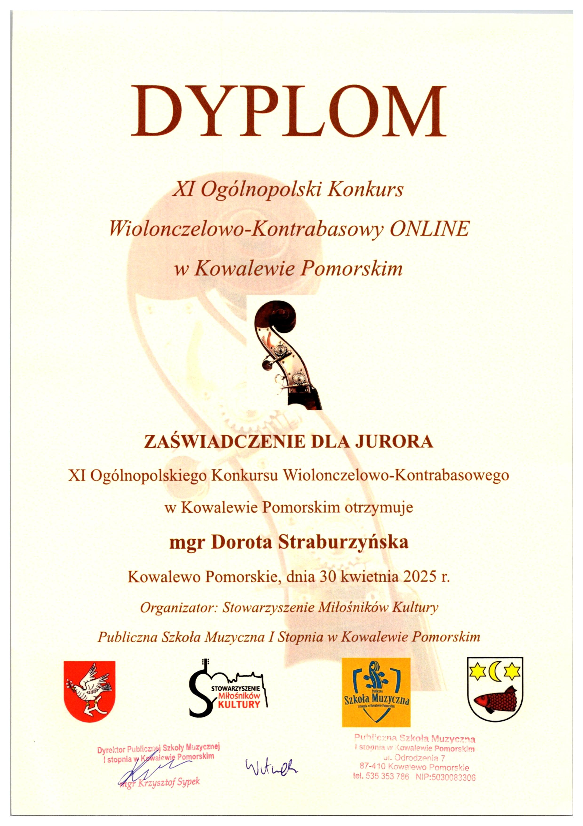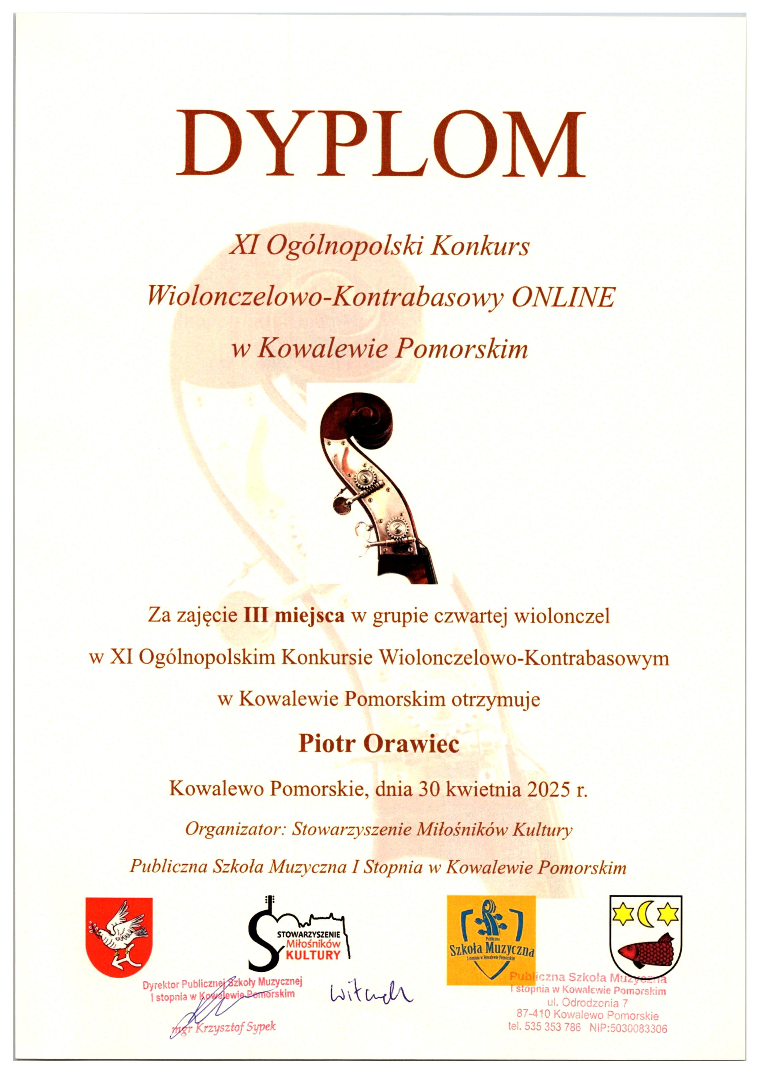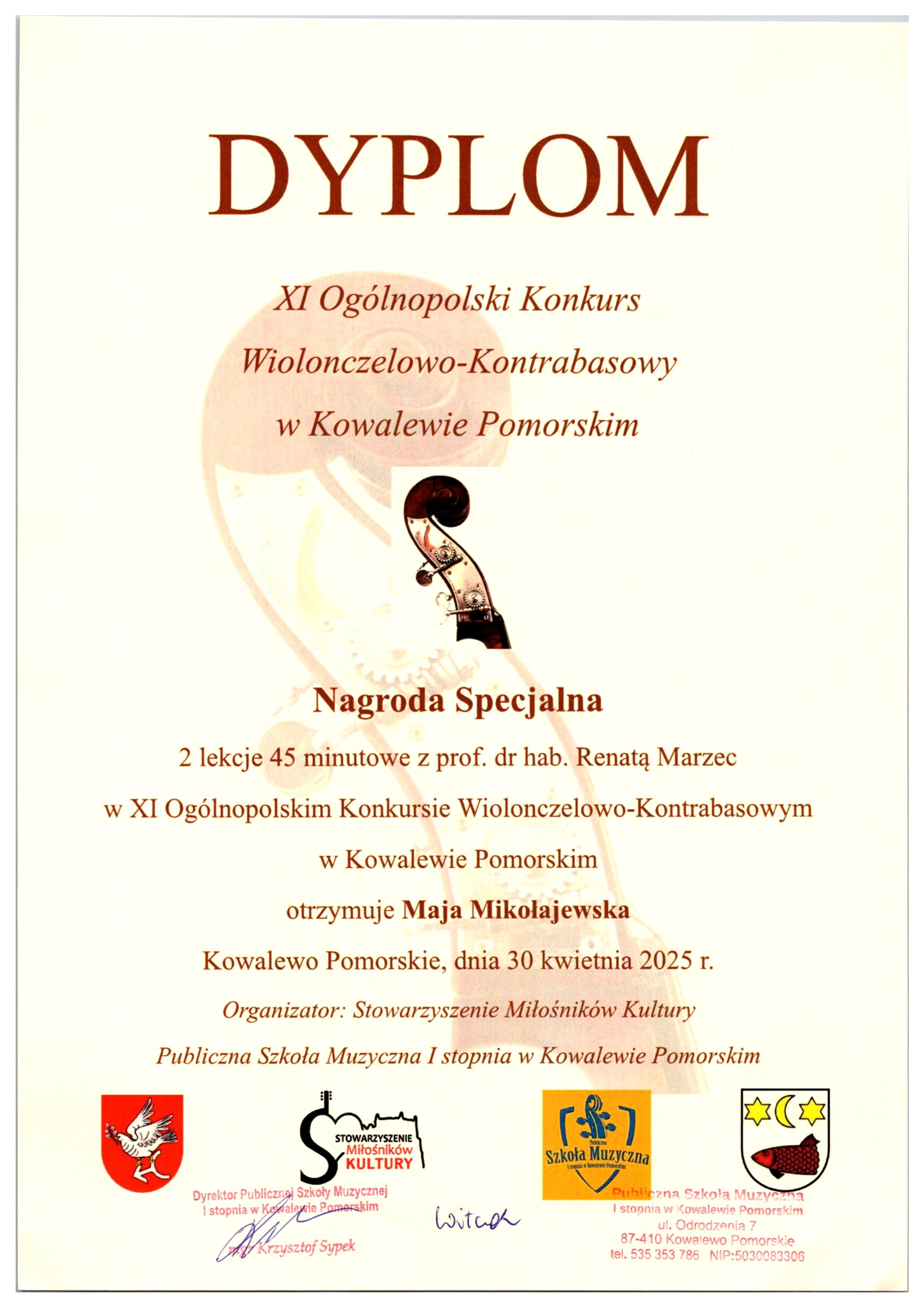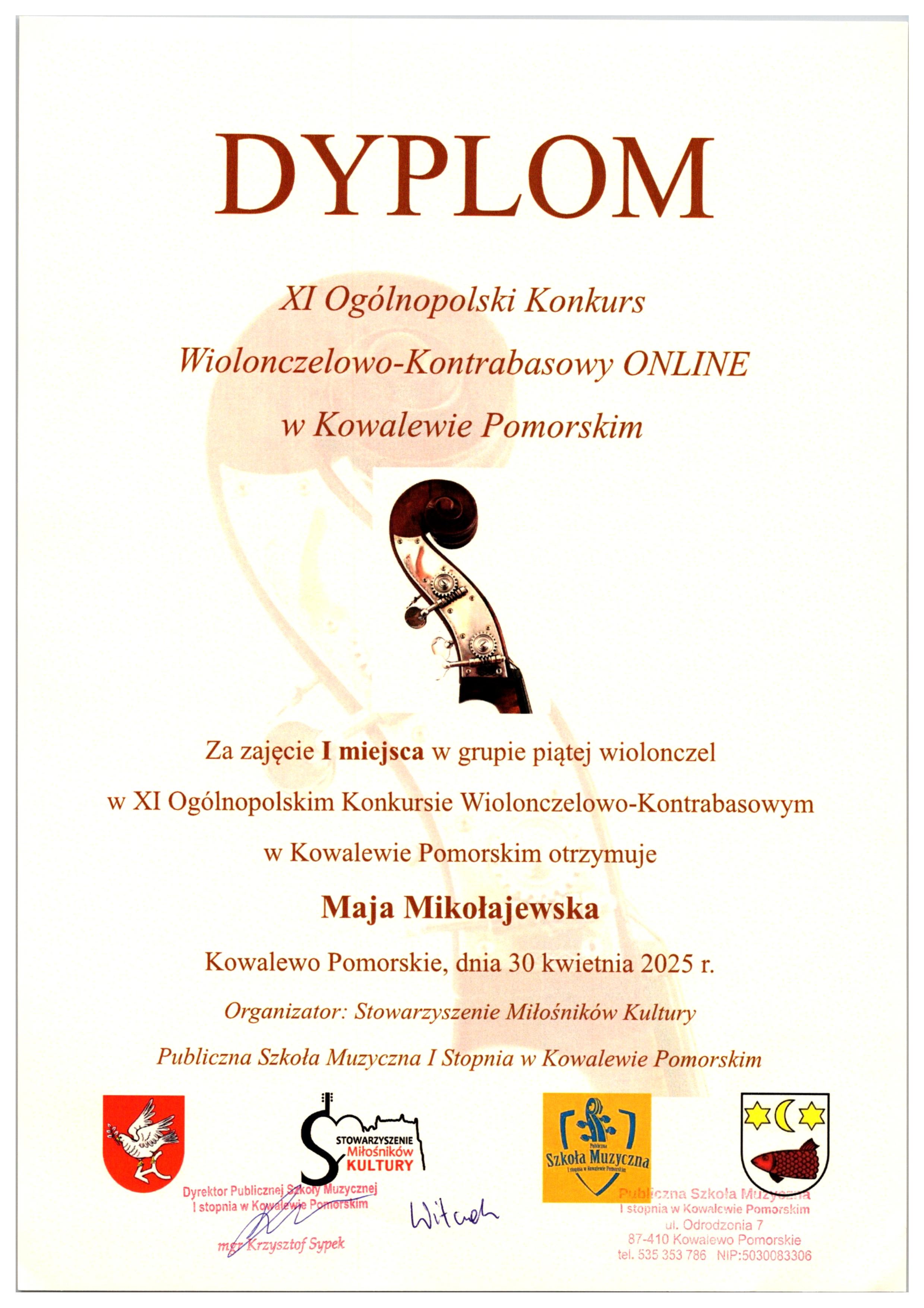 w XI Ogólnopolskim Konkursie Wiolonczelowo-Kontrabasowym w Kowalewie Pomorskim: