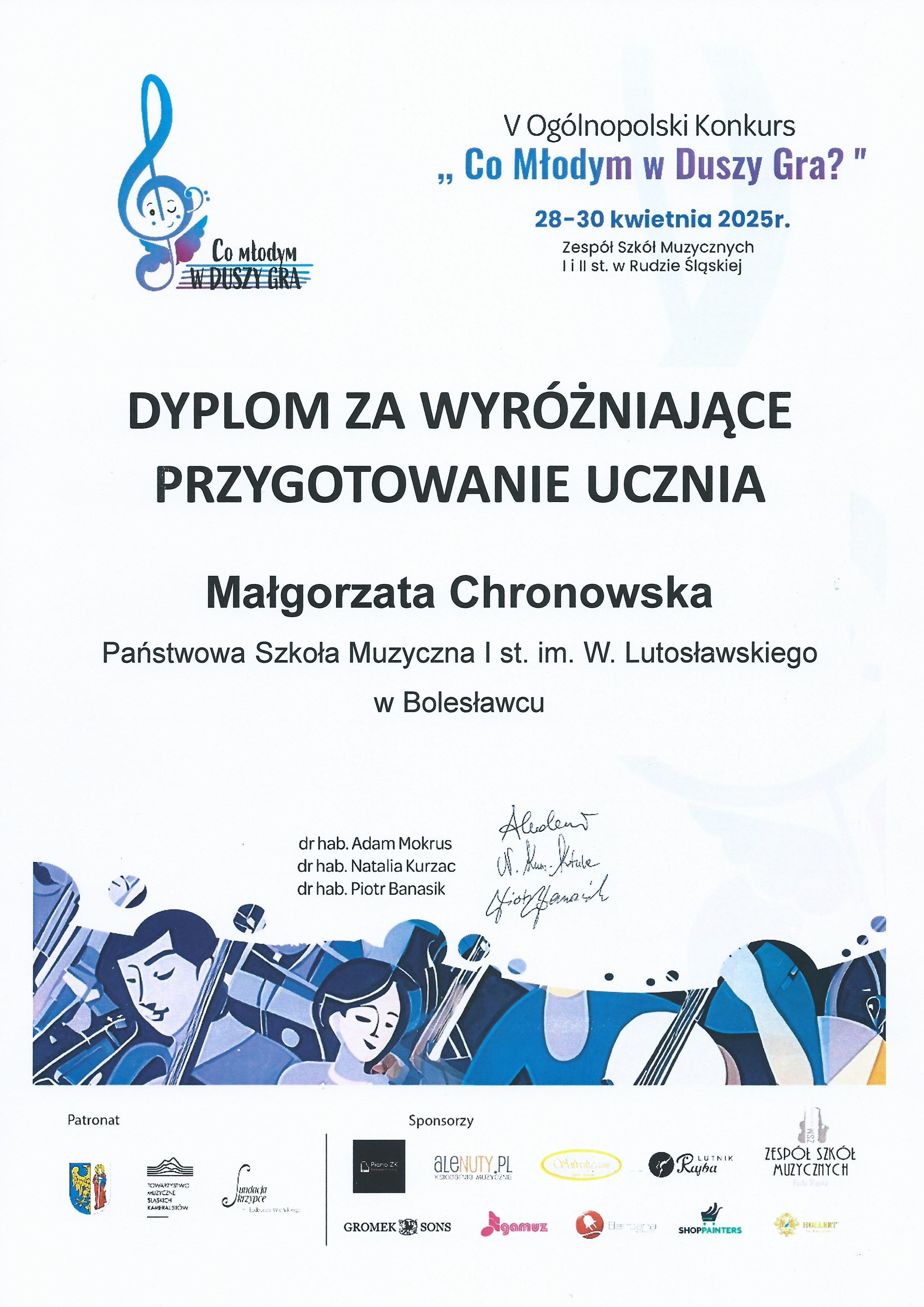Ponadto dyplomy honorowe za wyróżniające przygotowanie Uczniów otrzymali: p. Małgorzata Chronowska, p. Agata Klich oraz p. Dorota Straburzyńska. I w tym miejscu dziękujemy także panu Andrzejowi Janidze, który zawsze doskonale akompaniuje