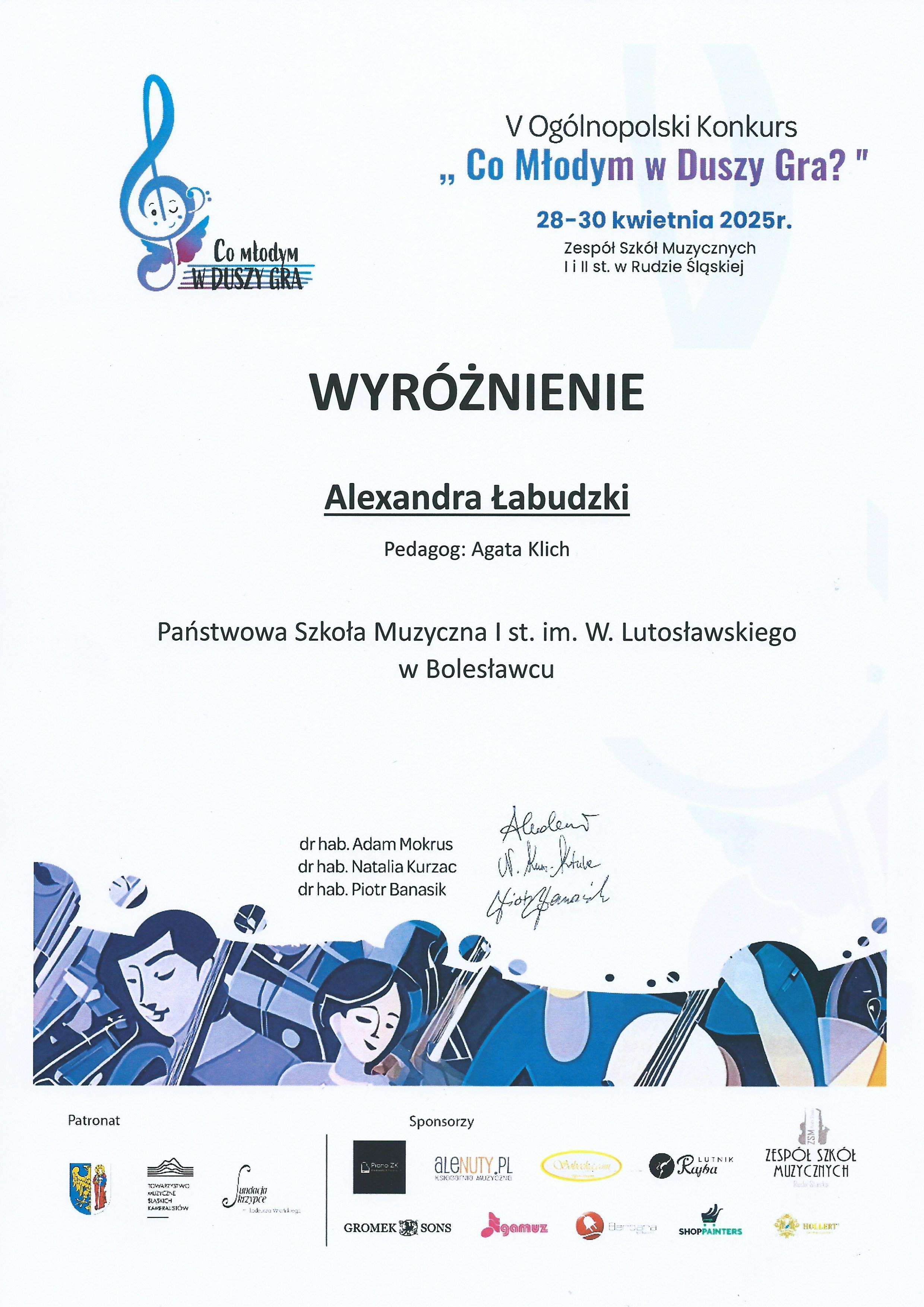 wyróżnienie - Alexandra Łabudzki i Antoni Bulsza z klasy skrzypiec