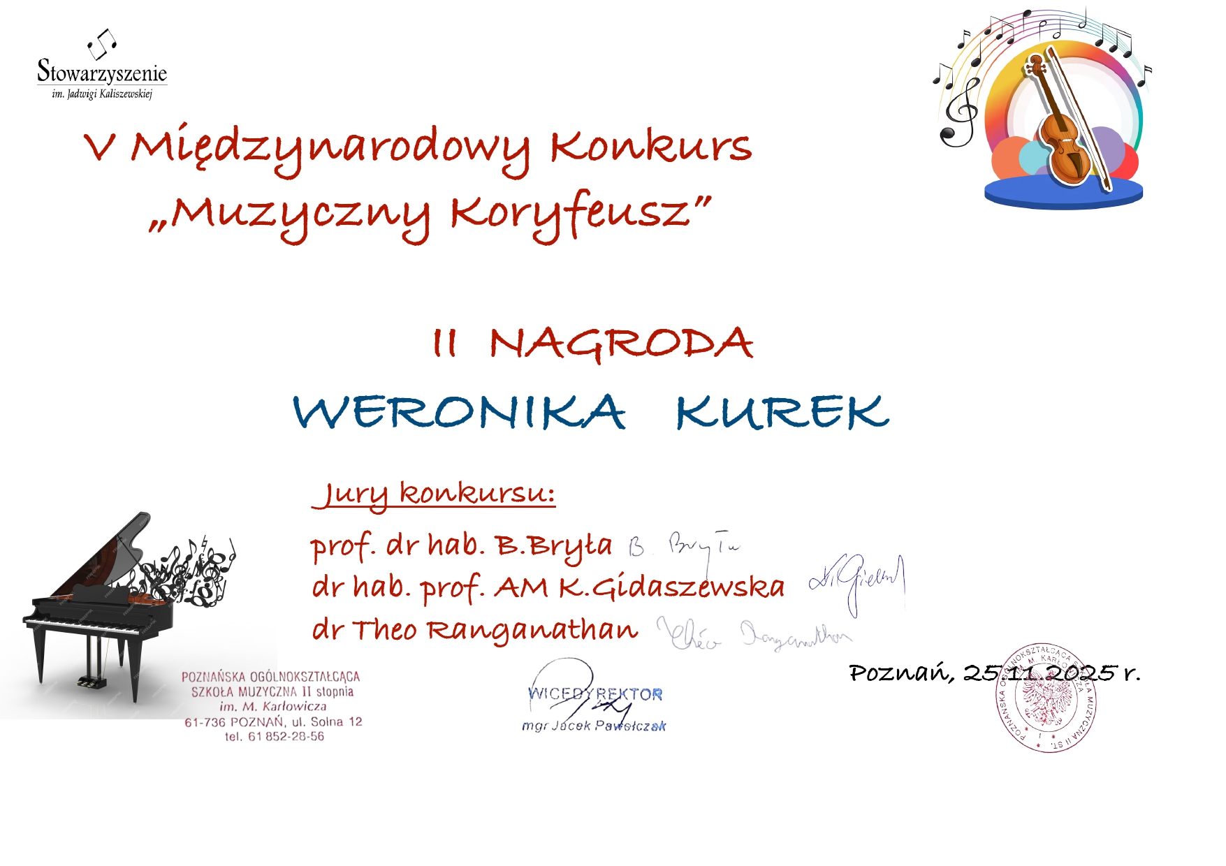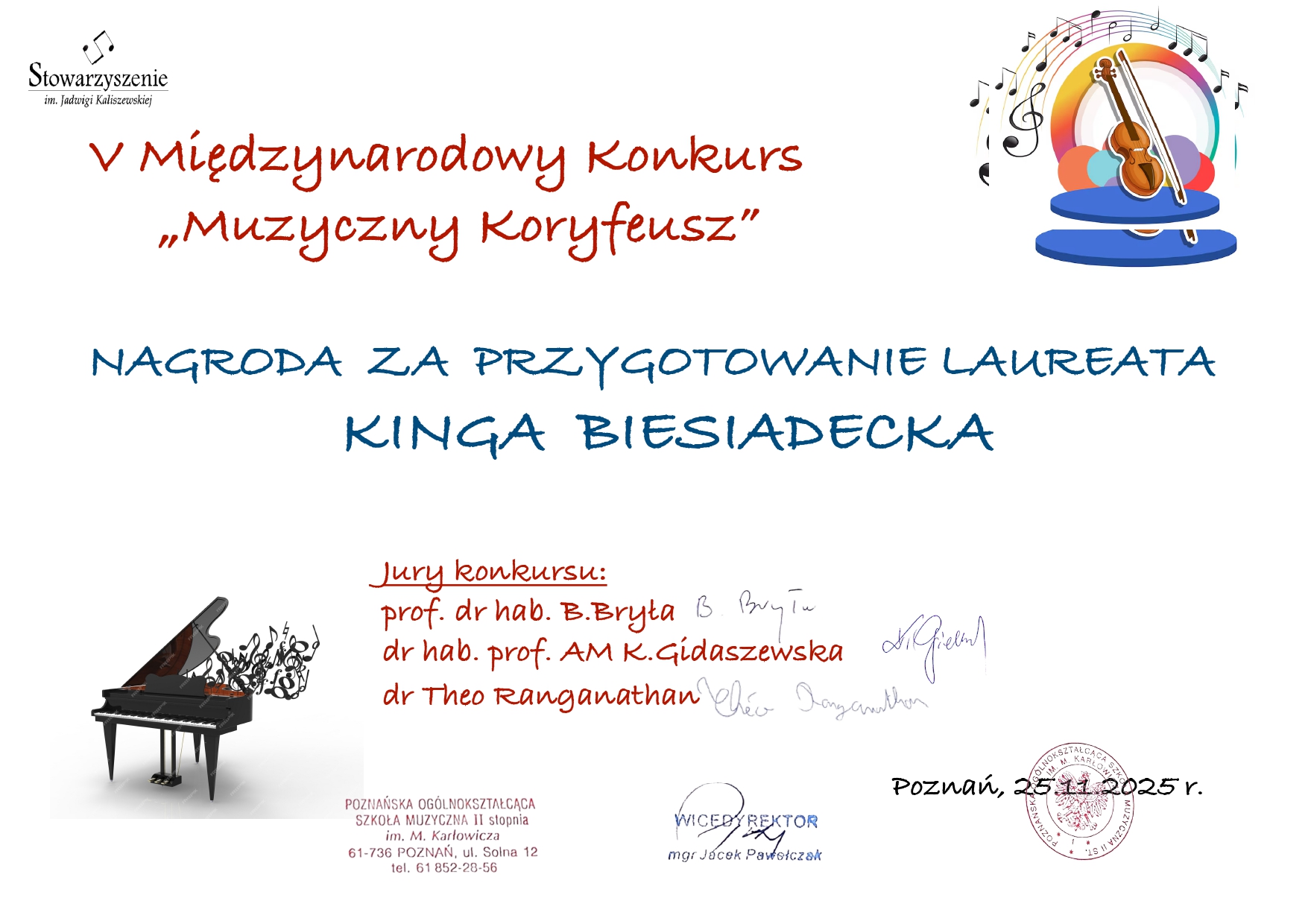 pani Kingi Biesiadeckiej zdobyła II Nagrodę w V Międzynarodowym Konkursie "Muzyczny Koryfeusz"