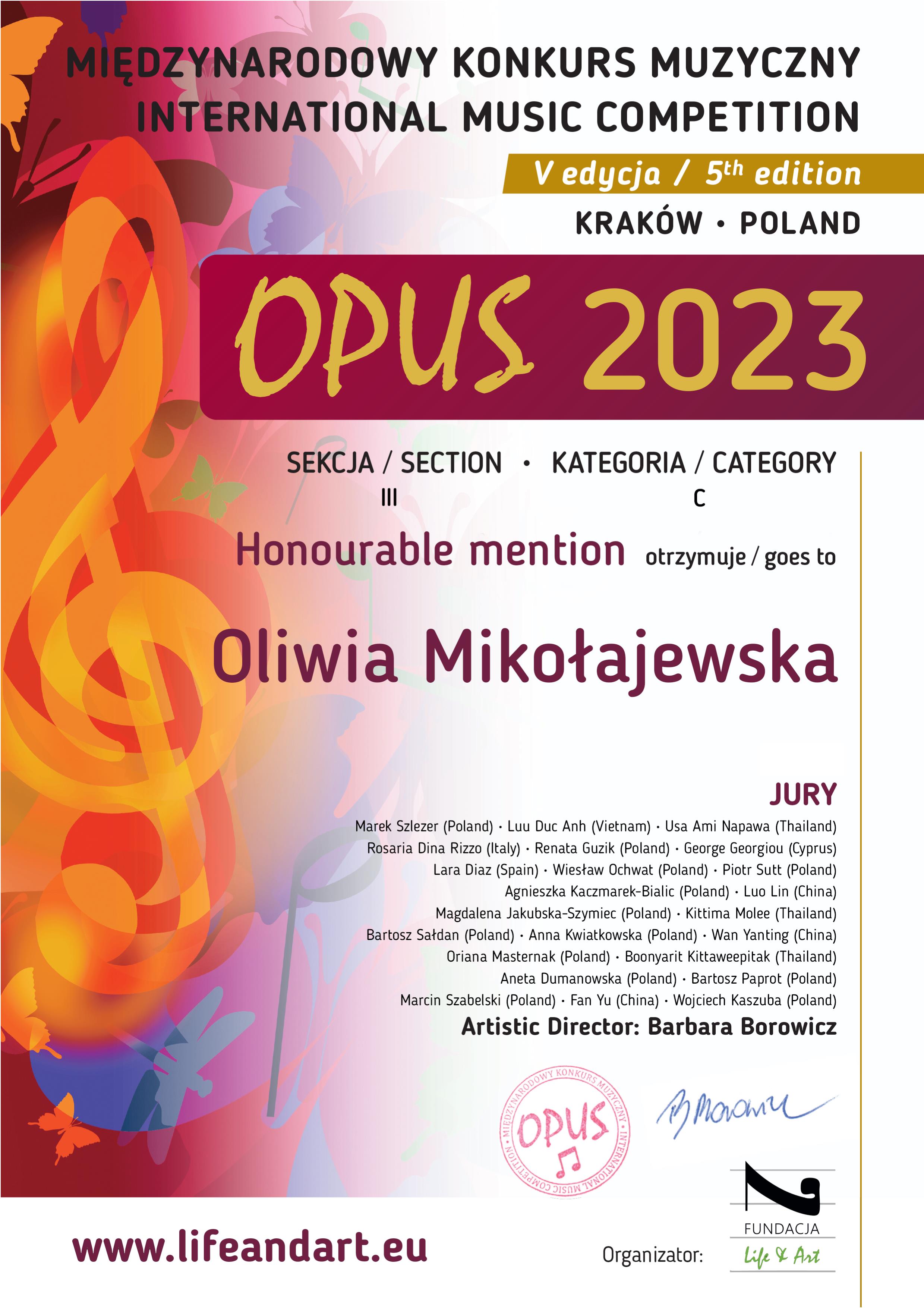 W piątej edycji Międzynarodowego Konkursu Muzycznego Opus 2023, organizowanego wyłącznie w formule on-line, nasza Oliwia zdobyła również wyróżnienie! W obu konkursach akompaniowała pani Halyna Hachak. Ogromne brawa!![]()