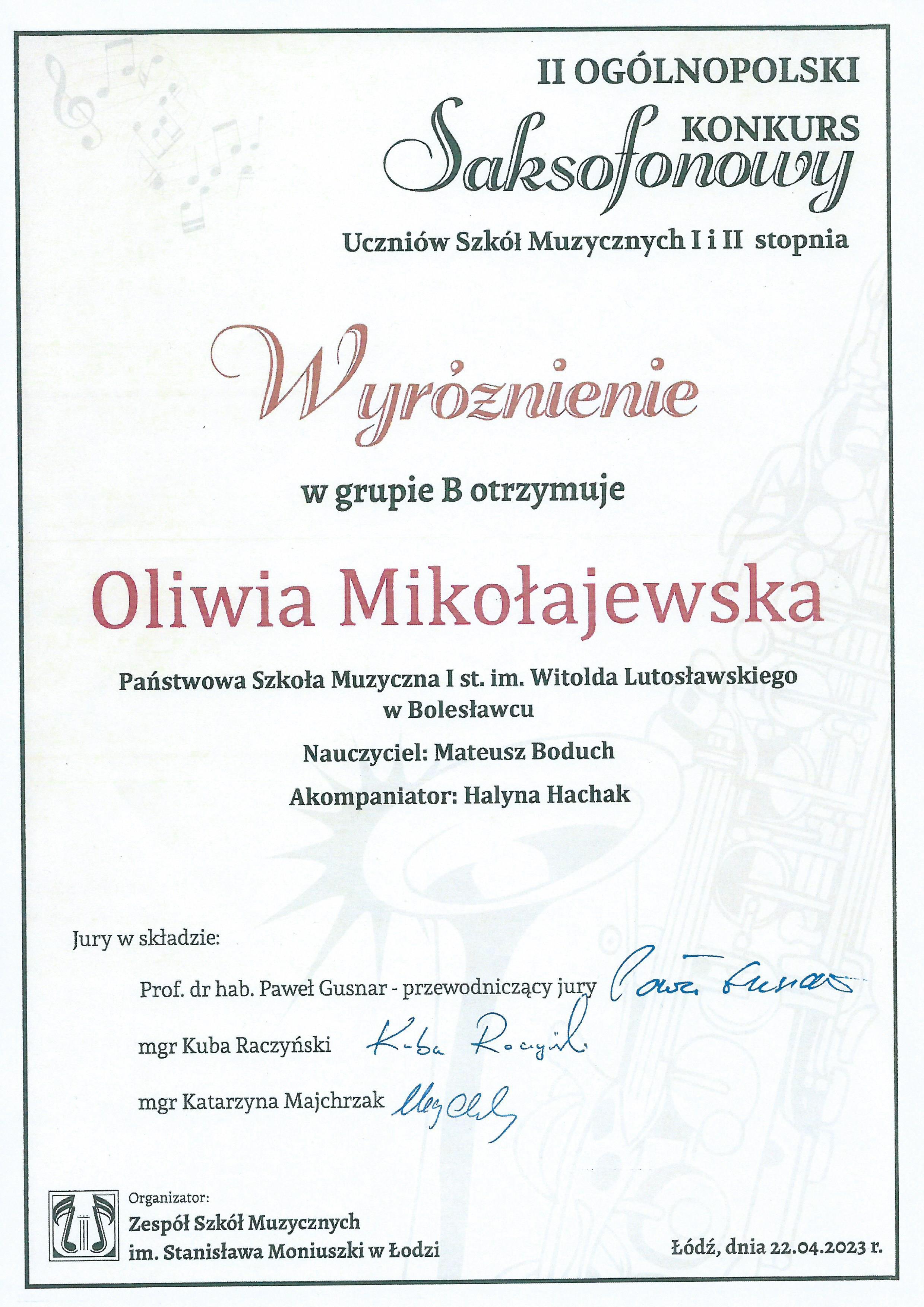 II Ogólnopolski Konkurs Saksofonowy uczniów Szkół Muzycznych I i II stopnia organizowany przez Zespół Szkół Muzycznych w Łodzi składał się z dwóch etapów. Pierwszy miał formułę eliminacji w postaci przesłuchań on-line, które Oliwia pomyślnie przeszła. Następnie drugi etap polegał na przesłuchaniach na żywo w Zespole Szkół Muzycznych w Łodzi. Ten etap zakończył się przyznaniem Oliwii wyróżnienia w grupie B. Ale to nie wszystko!