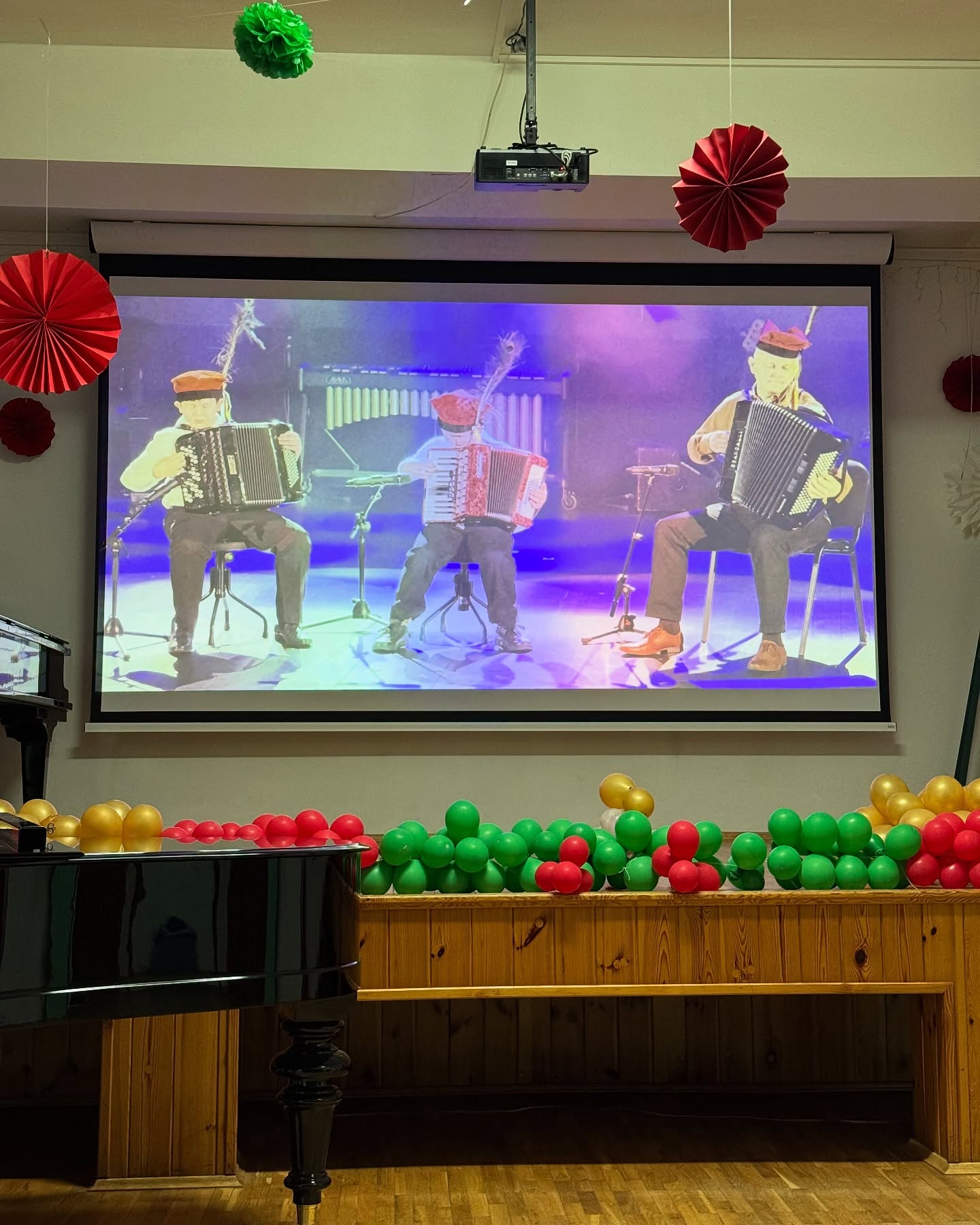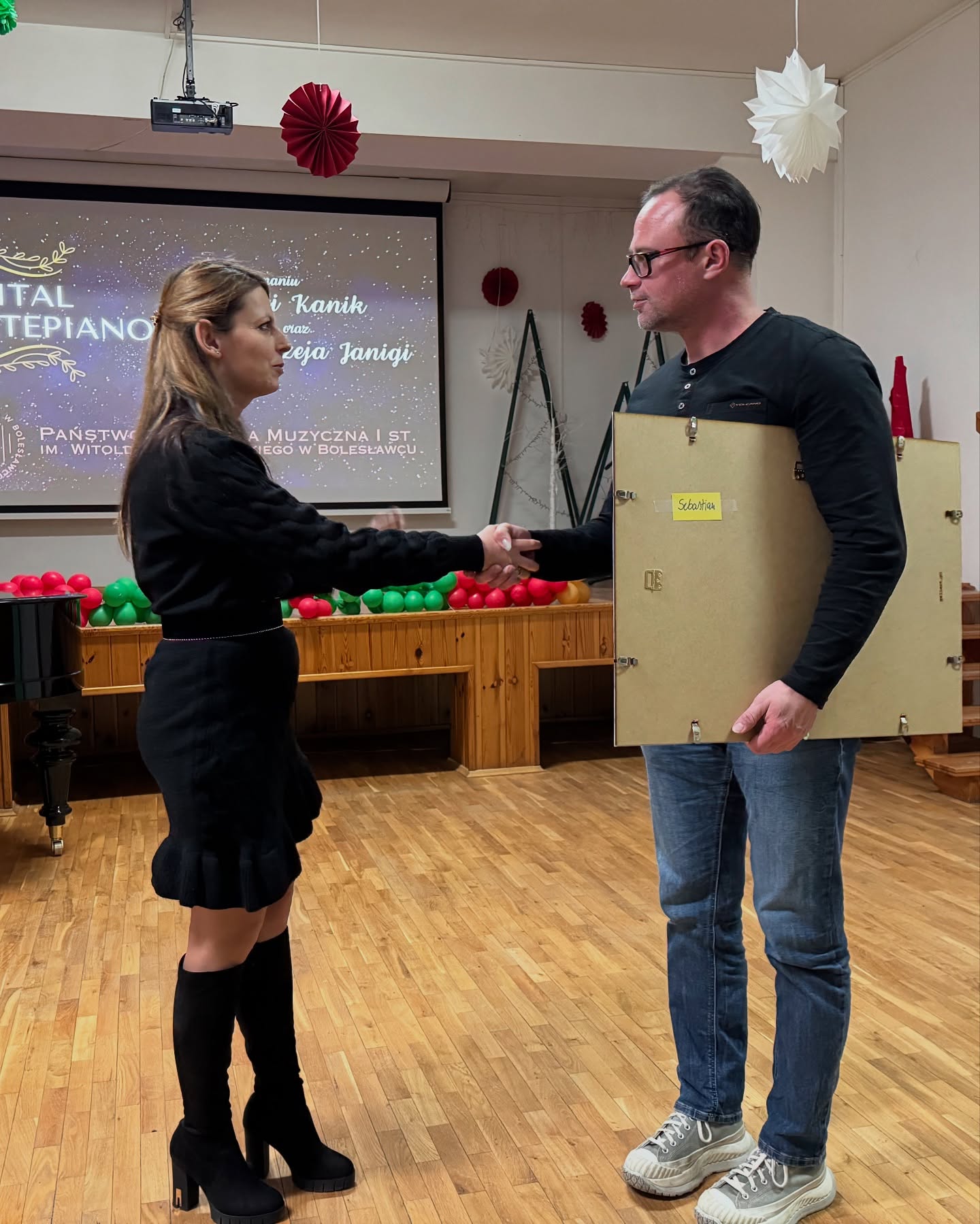 wraz z ekranem, który wzbogaci artystycznie nasze koncerty i pozwoli także na organizację wieczorów kinowych. Na ekranie wszyscy obejrzeliśmy materiał złożony z fragmentów występów na Koncercie Noworocznym z 16 stycznia 2025 r. przygotowany przez pana Łukasza Byzdrę, któremu od dzisiaj dochodzić będą nowe obowiązki z zakresu realizacji filmowej