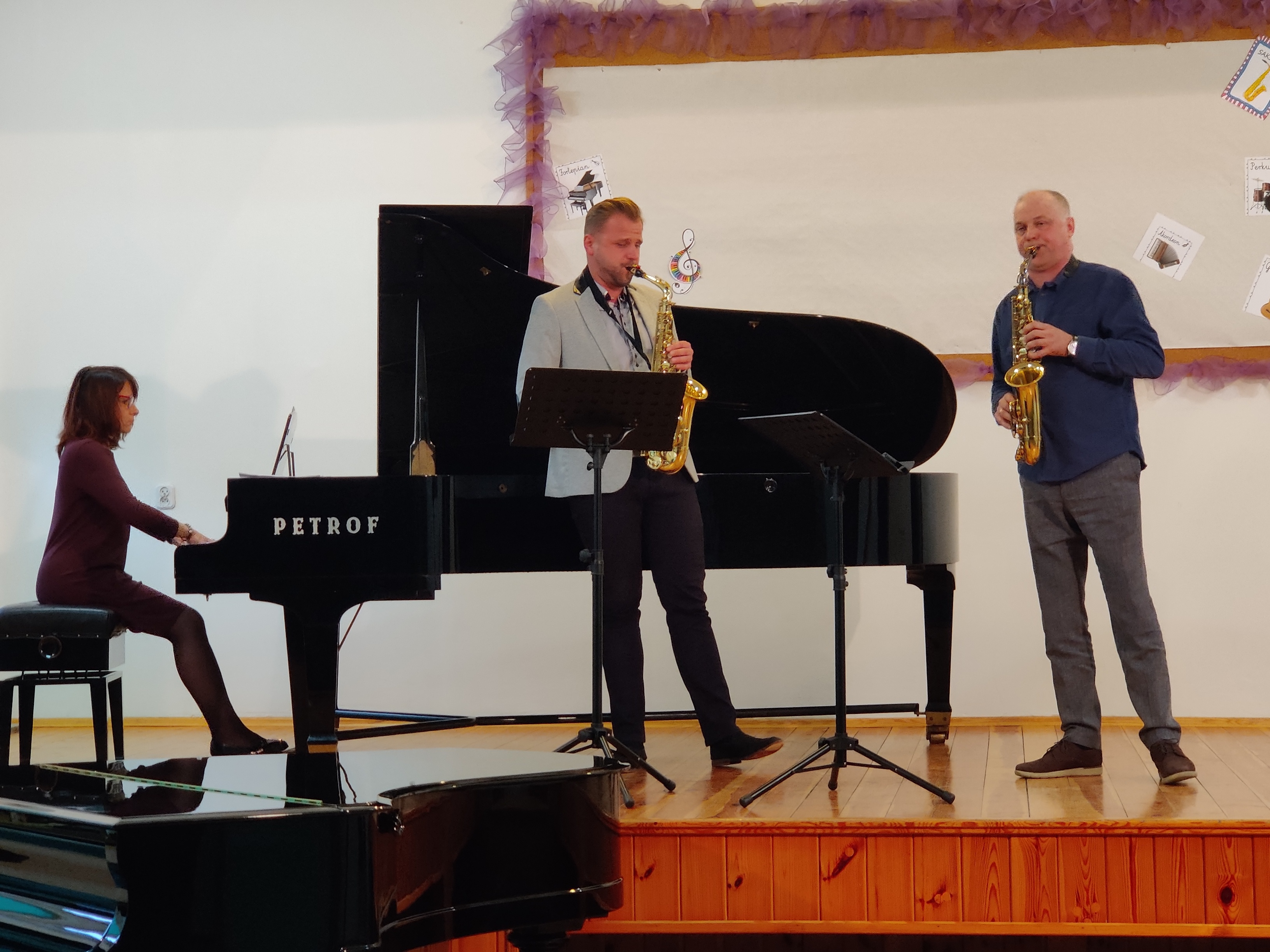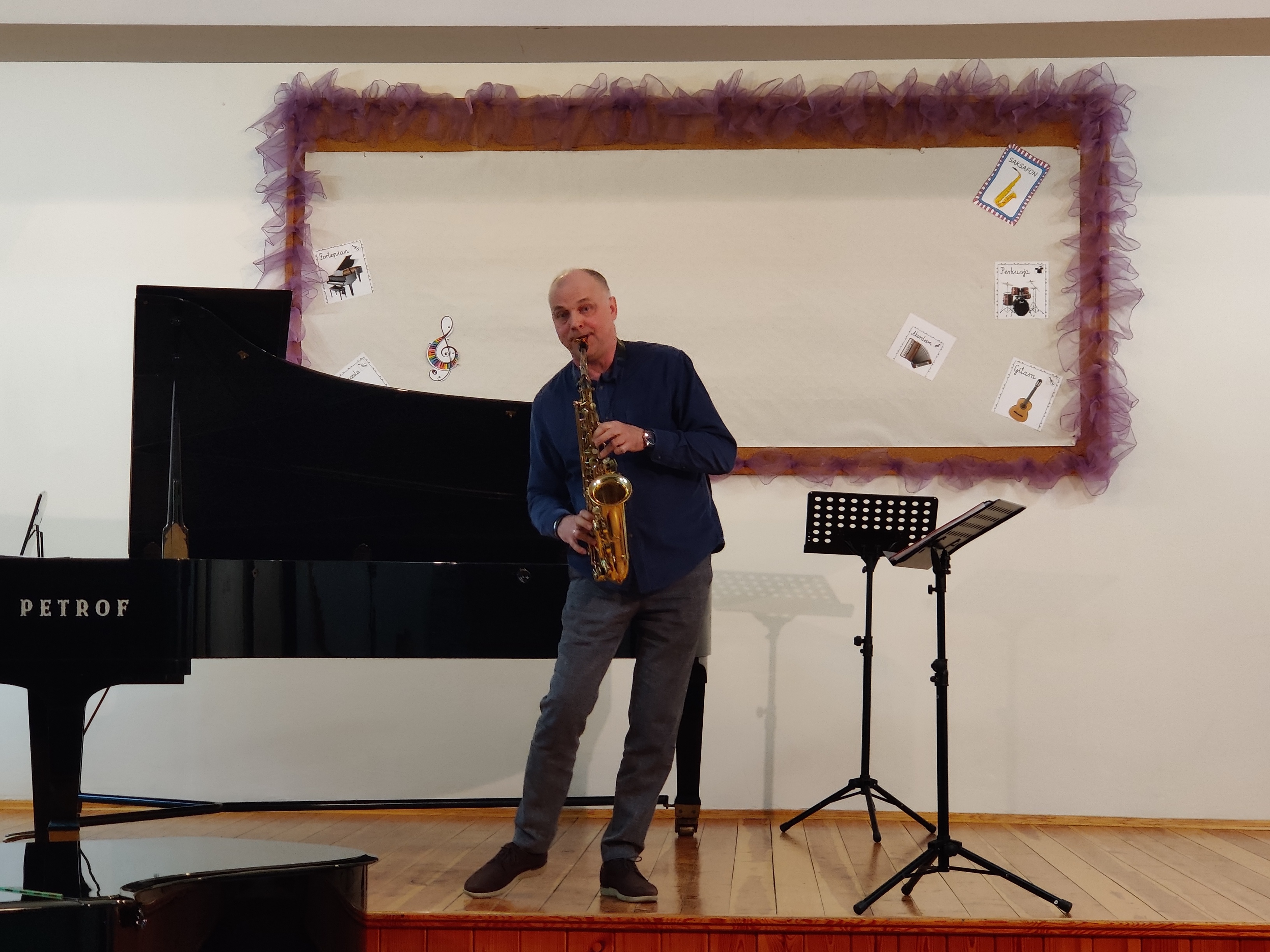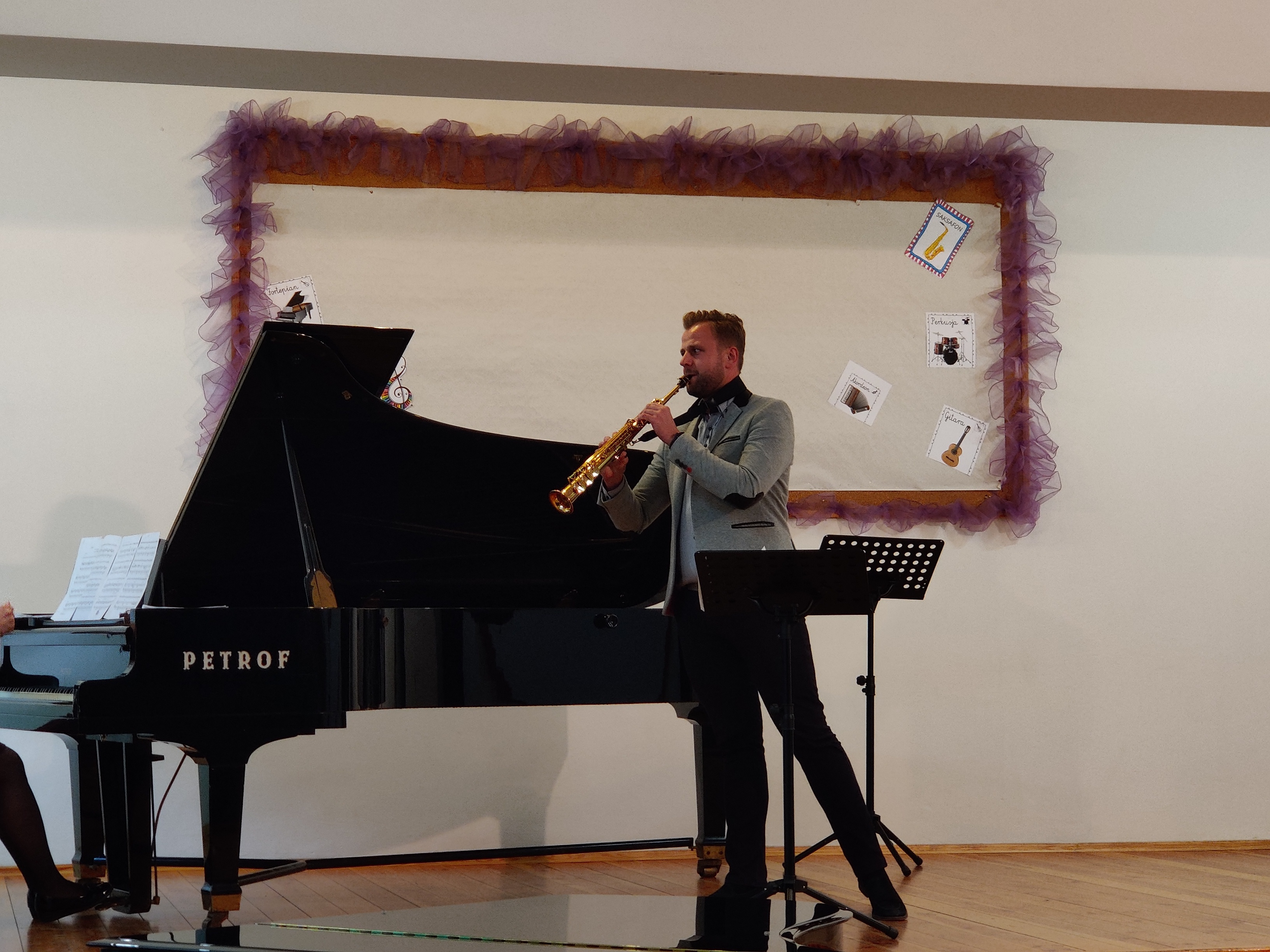 Po bardzo owocnym i intensywnym popołudniu warsztatów, sam mistrz pokazał jakie „cuda” można wykonywać na saksofonie i jak bawić się dźwiękami. Spotkanie z profesorem zakończył wieczorny koncert, w którym wystąpił dawny uczeń pana Ryszarda Żołędziewskiego, a obecnie nasz nauczyciel – Mateusz Boduch. Na fortepianie akompaniowała pani Halyna Hachak.