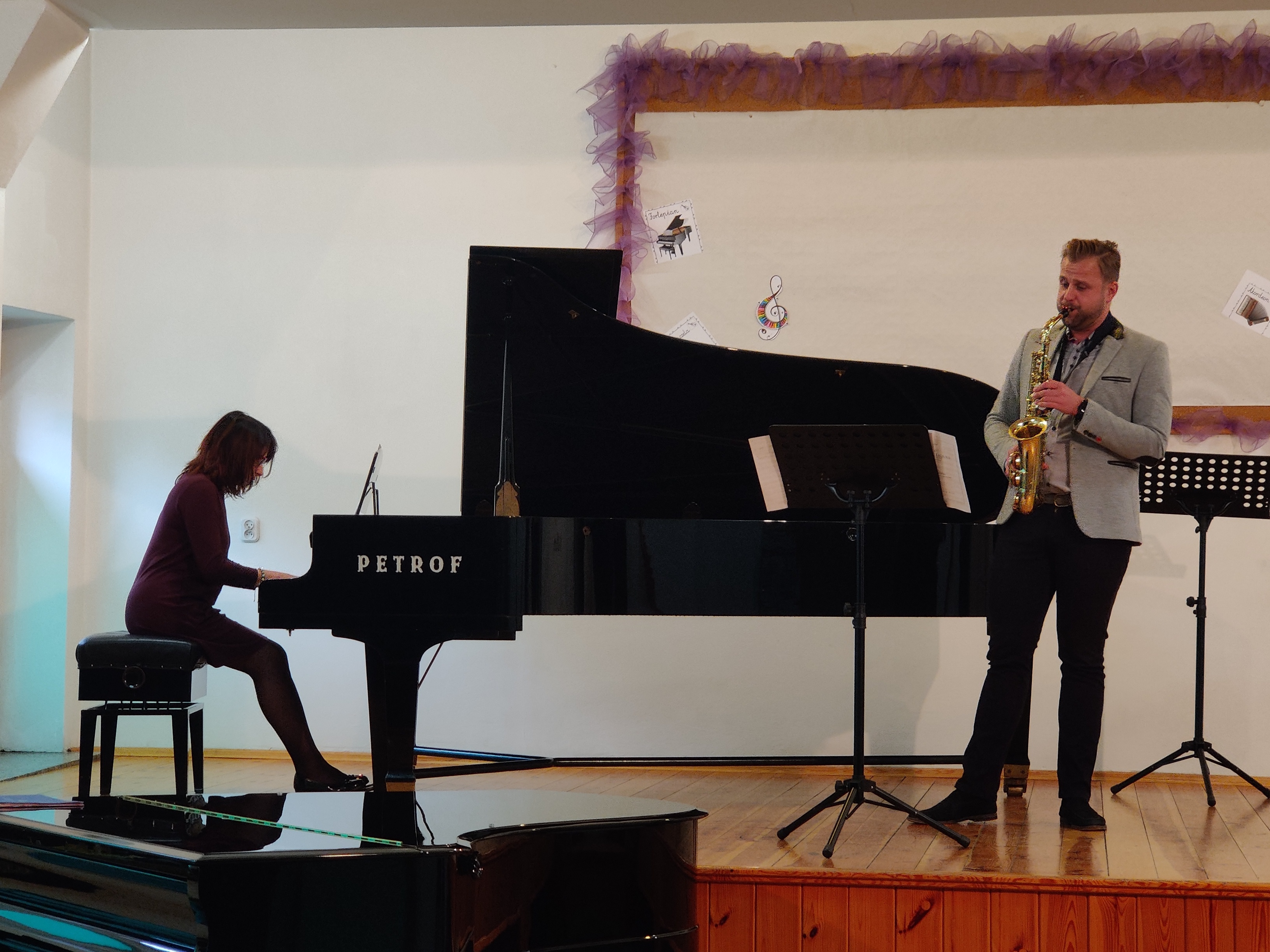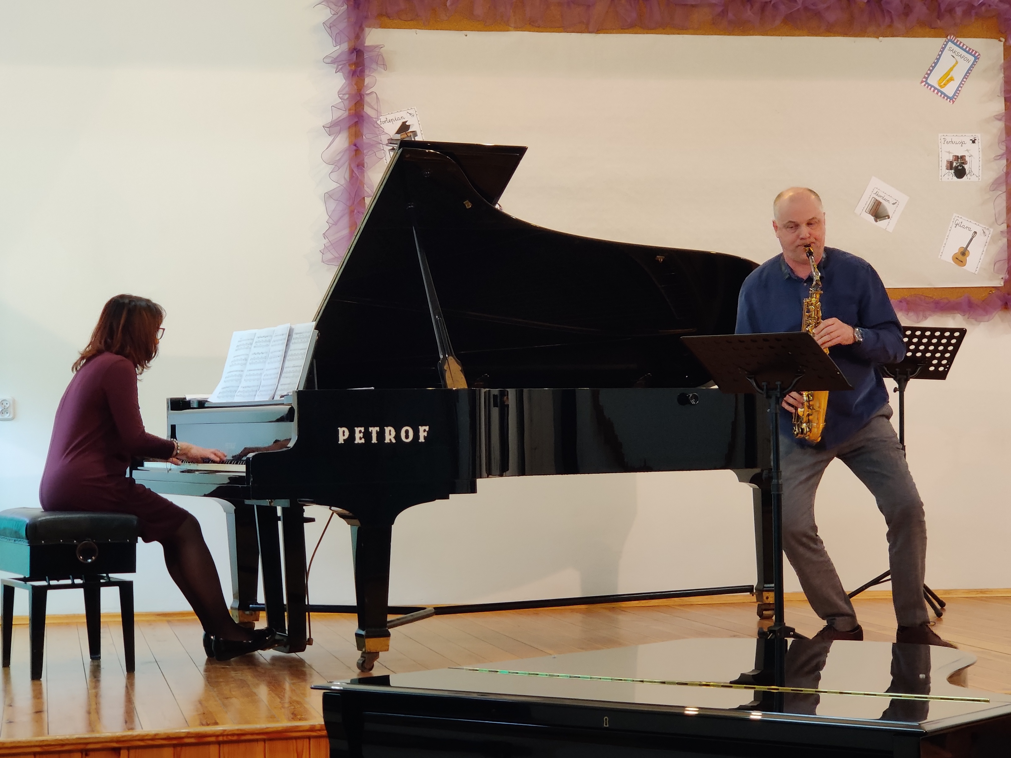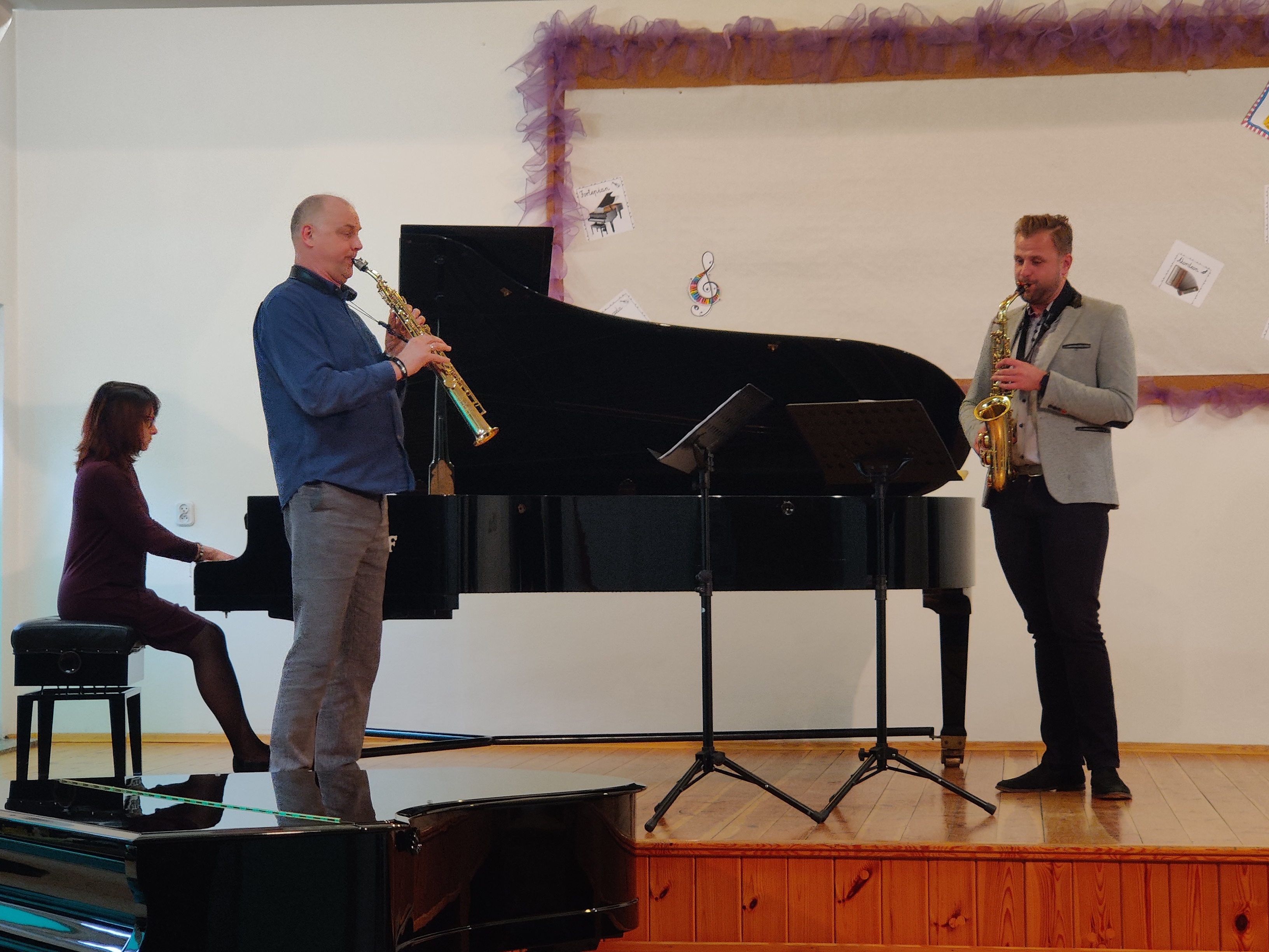 Po bardzo owocnym i intensywnym popołudniu warsztatów, sam mistrz pokazał jakie „cuda” można wykonywać na saksofonie i jak bawić się dźwiękami. Spotkanie z profesorem zakończył wieczorny koncert, w którym wystąpił dawny uczeń pana Ryszarda Żołędziewskiego, a obecnie nasz nauczyciel – Mateusz Boduch. Na fortepianie akompaniowała pani Halyna Hachak.